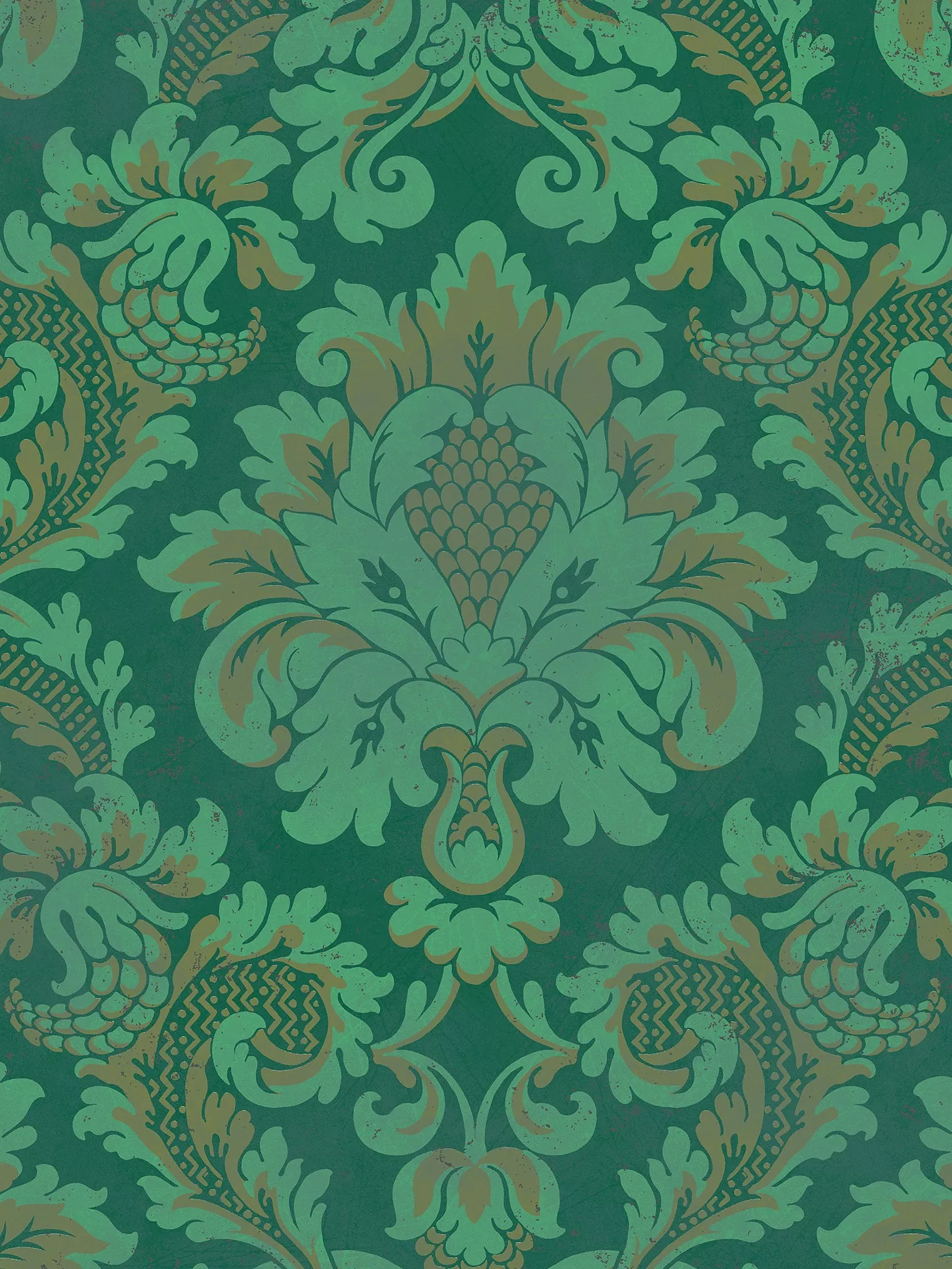 A classic damask, combines with a full width tile layout, to create a striking, aged patina effect.