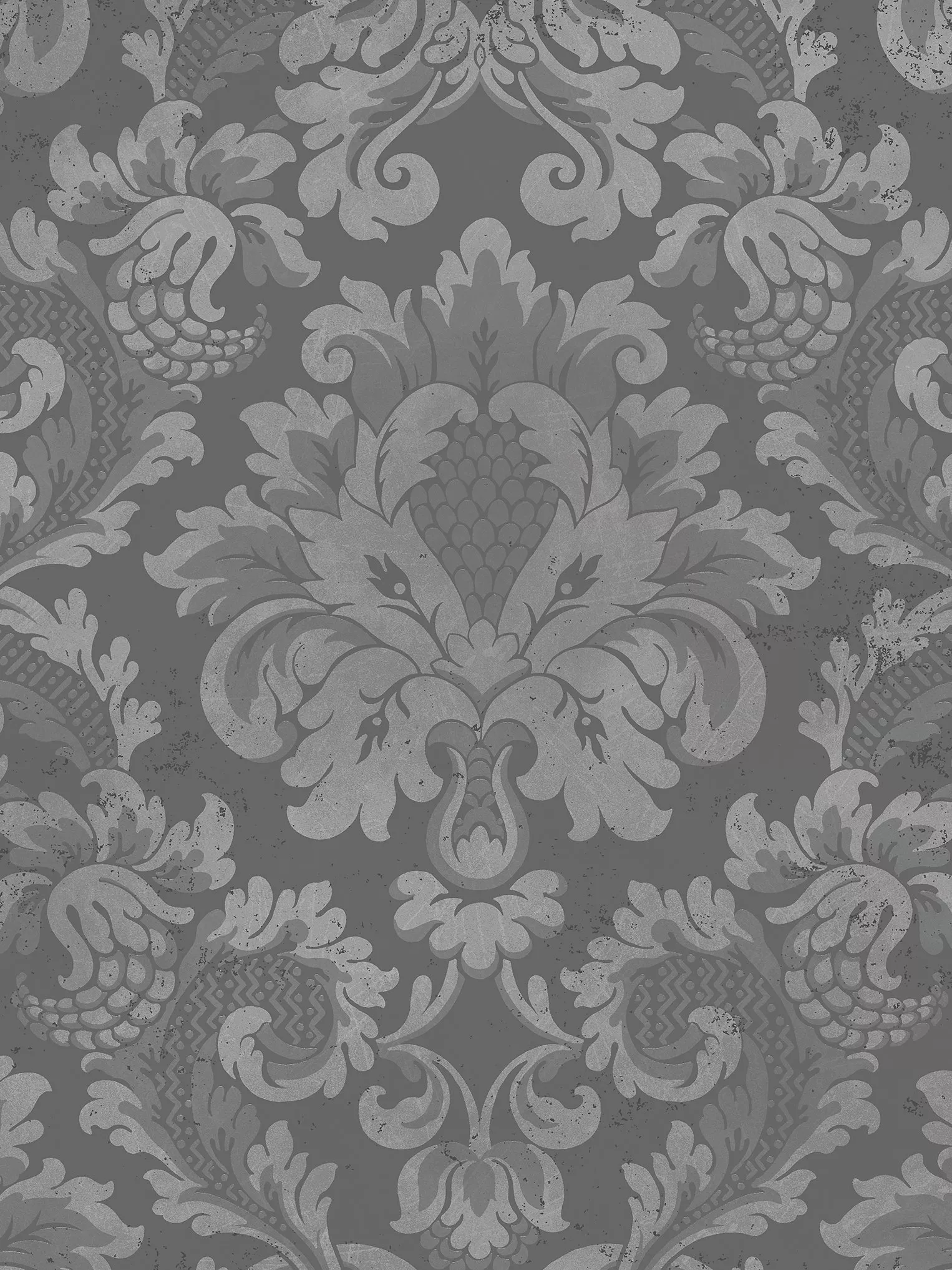 A classic damask, combines with a full width tile layout, to create a striking, aged patina effect.