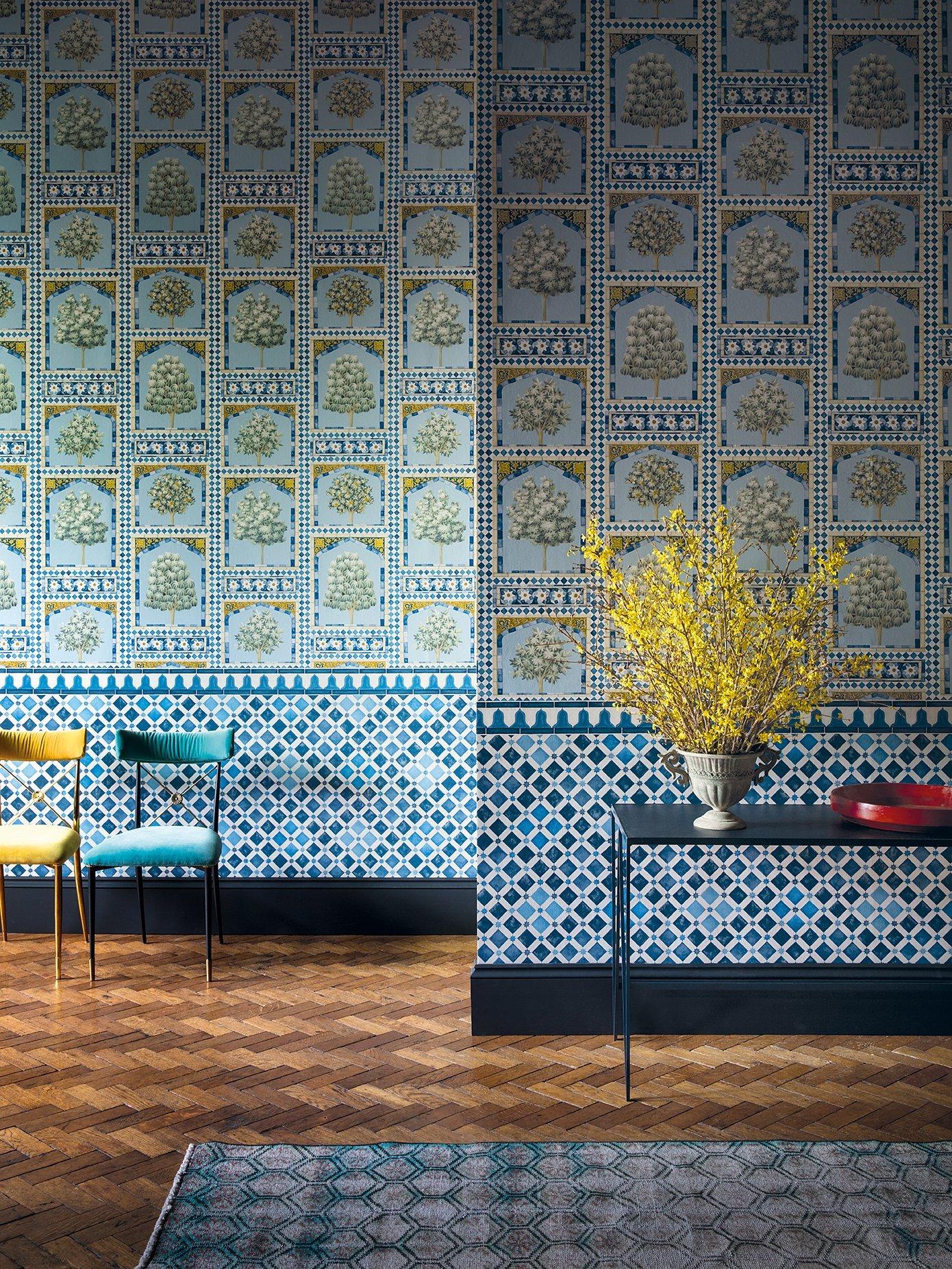 The Zellige Border provides a decorative trim to many of the Martyn Lawrence Bullard designs, including Zellige and Sultan’s Palace. Vibrant shades of China Blue and White, Olive, and Soot and Snow add the perfect finishing touch to Martyn’s signature layered style.