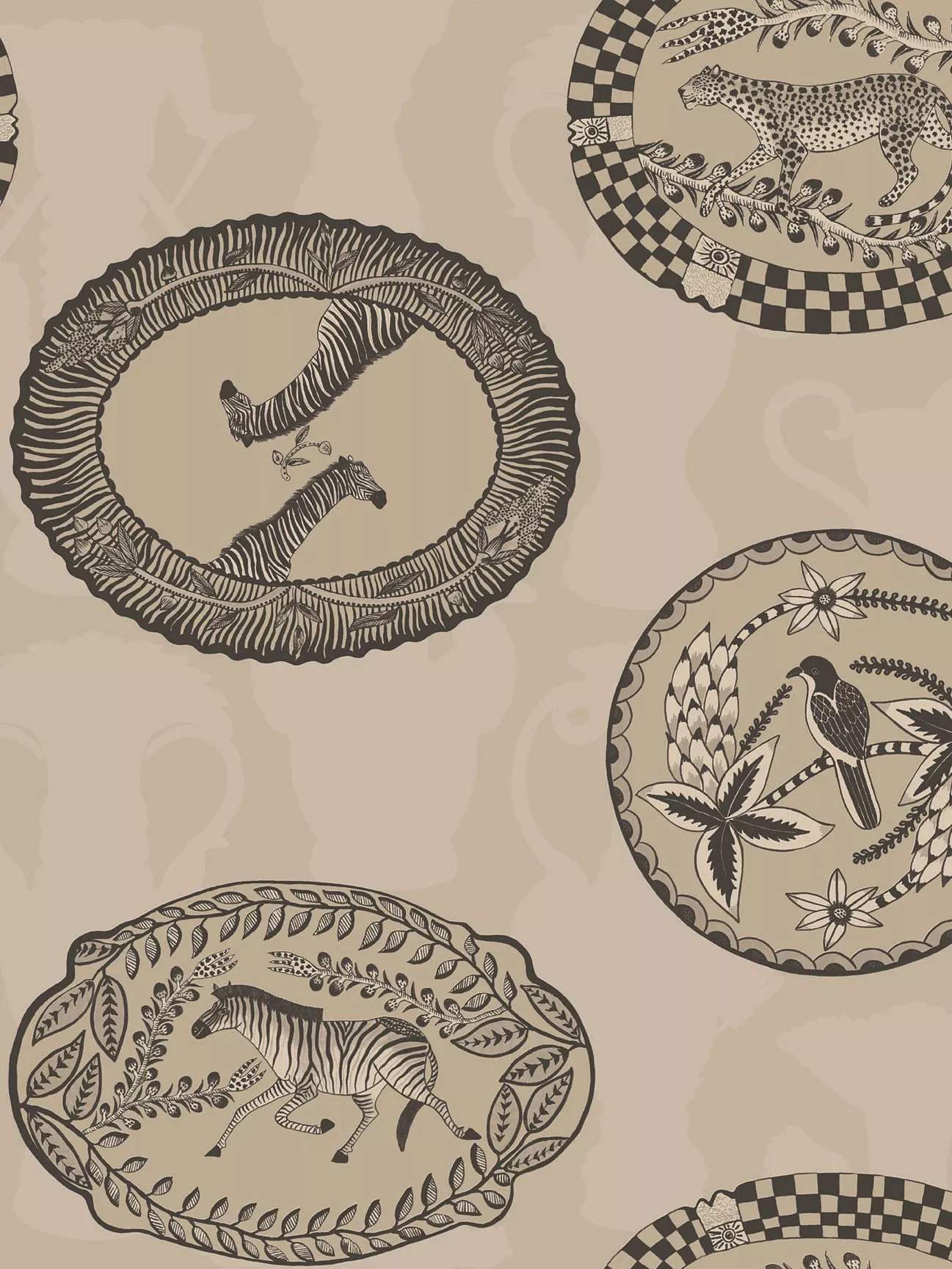 Matrinah reveals an arrangement of ornamental platters and dishes, all intricately patterned with birds and animals and edged with decorative borders and pie crust scallops.