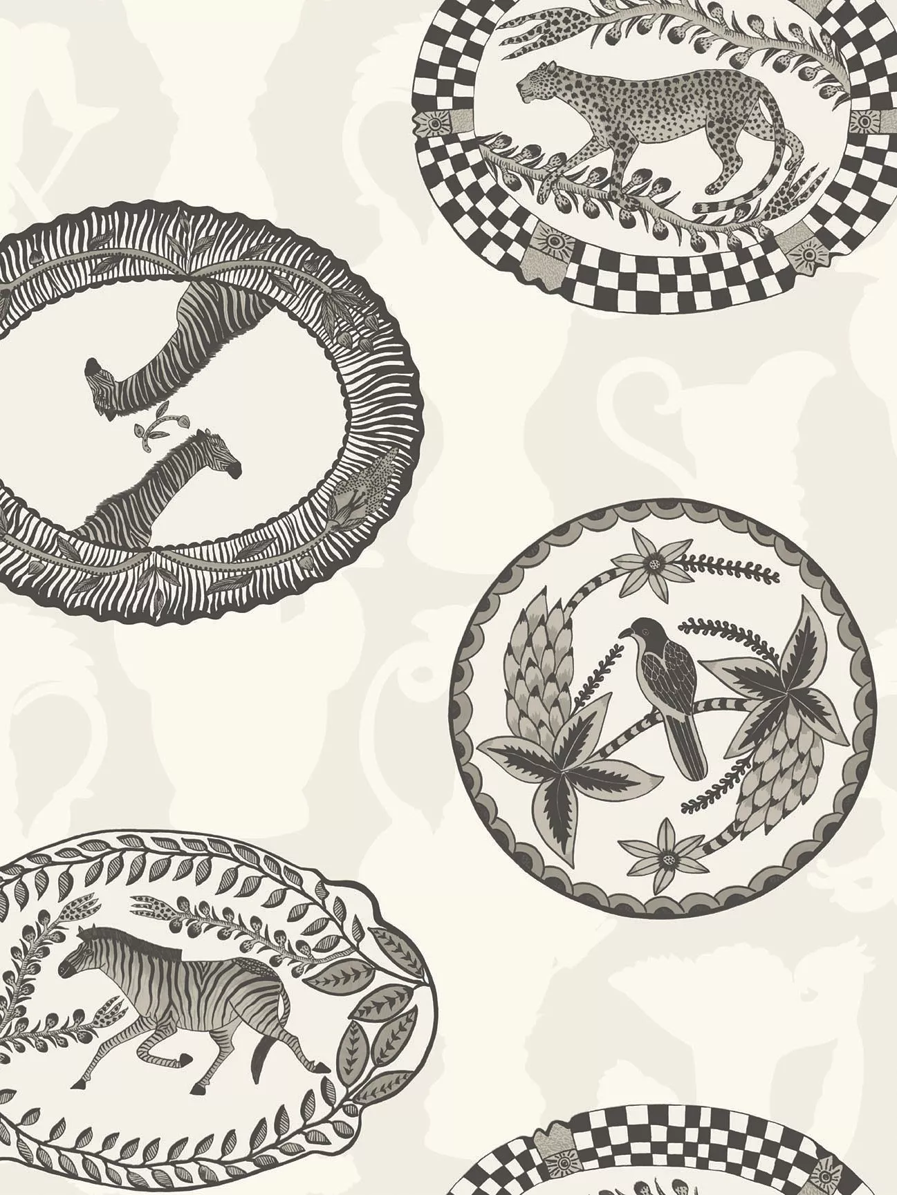 Matrinah reveals an arrangement of ornamental platters and dishes, all intricately patterned with birds and animals and edged with decorative borders and pie crust scallops.