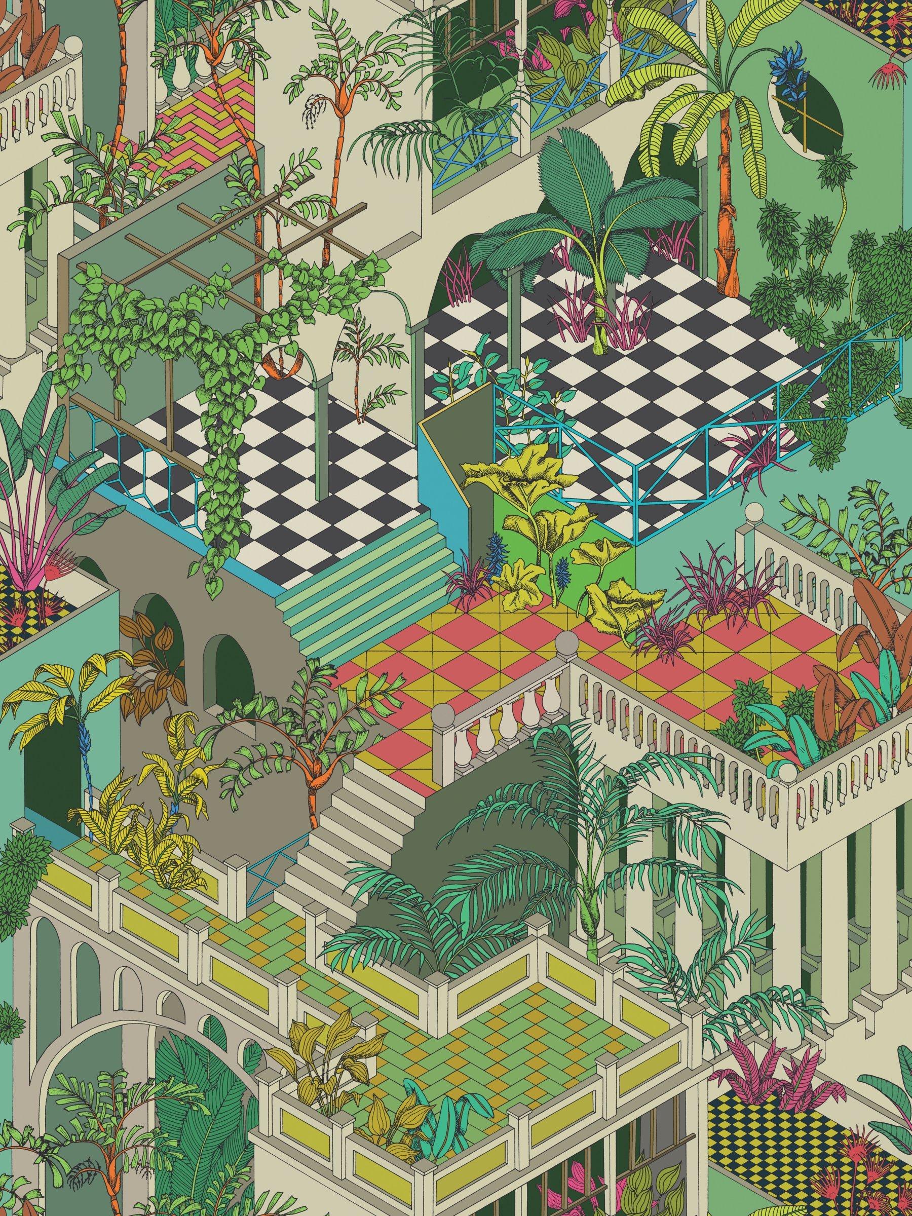Elegant terraces, colonnades and pillars, with palms and exotic flora.