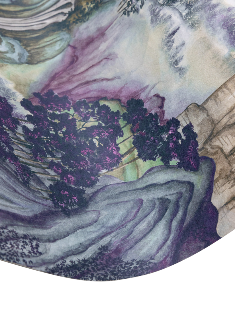 The artistic tone honours Tani Bunchō’s style with a modern interpretation. The delicately hand-painted design allows you to escape into the detail of the stillness of the mountains and the flow of the water source, making your mind wander across each peak and valley. Find your inspiration and Zen within the Mountainscape scene.