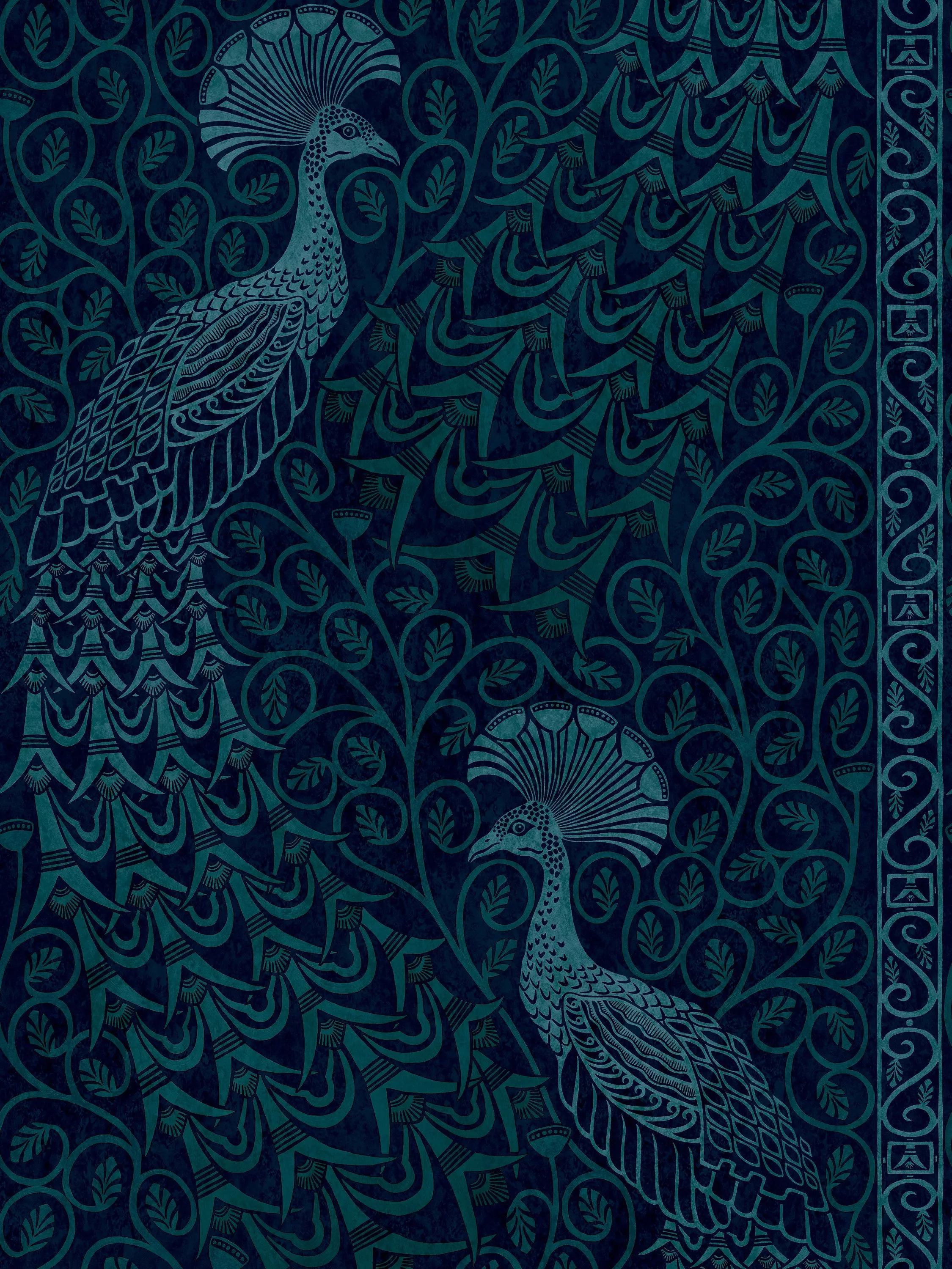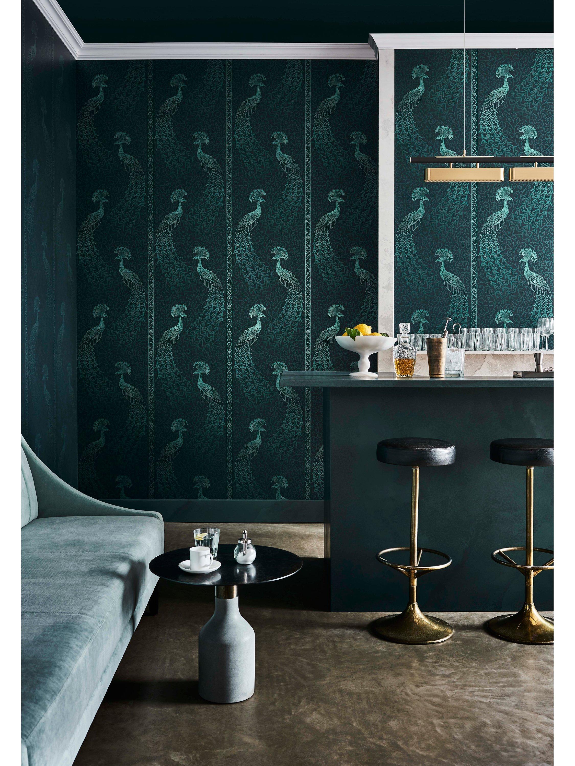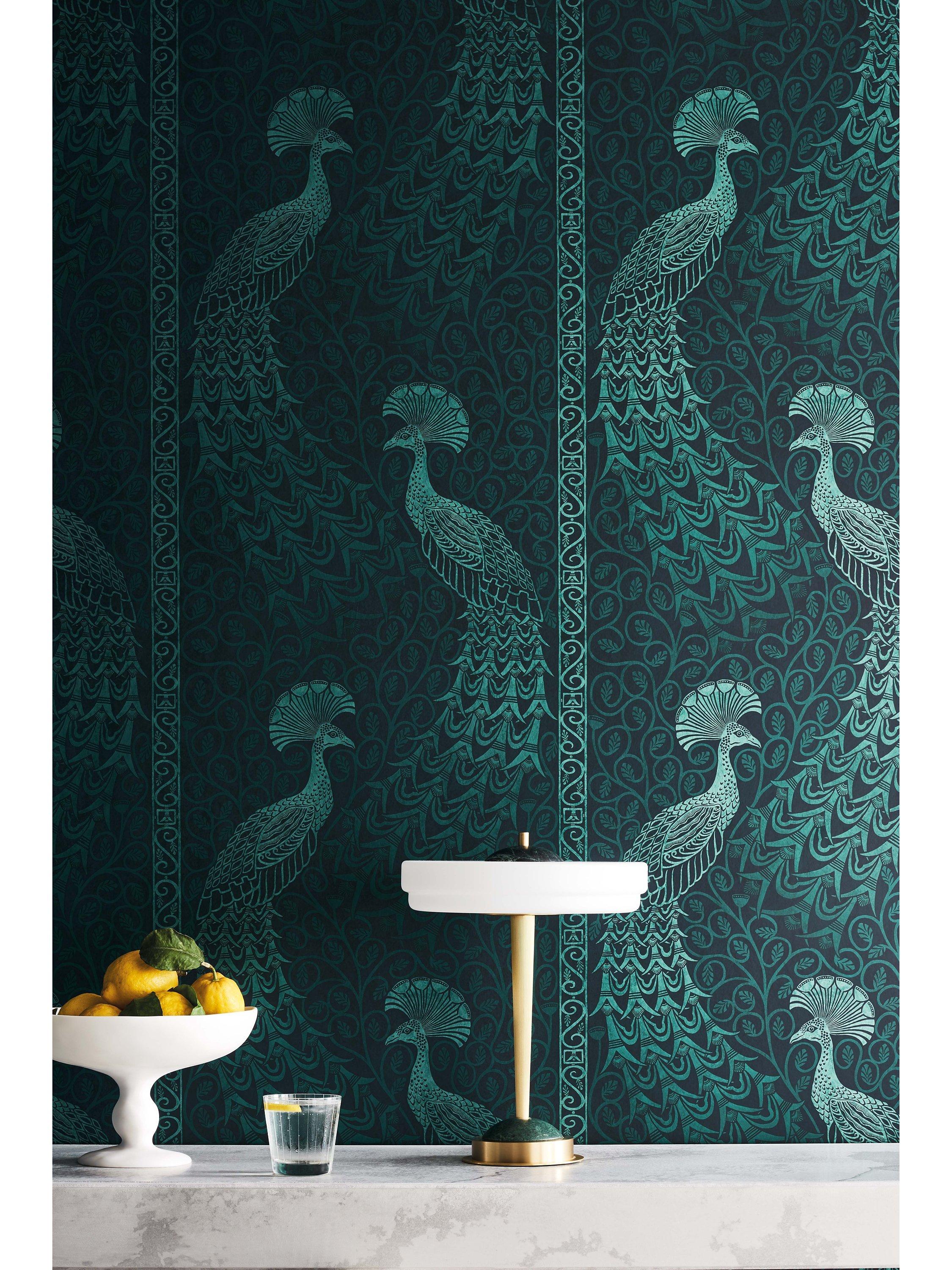 Pavo Parade is an opulent host of metallic-toned peacocks. Their subtly ombréd trailing tails pay homage to a technique pioneered by Cole & Son, whilst the subtle framing of the design creates a panel-like effect emphasizing the birds' grandeur.