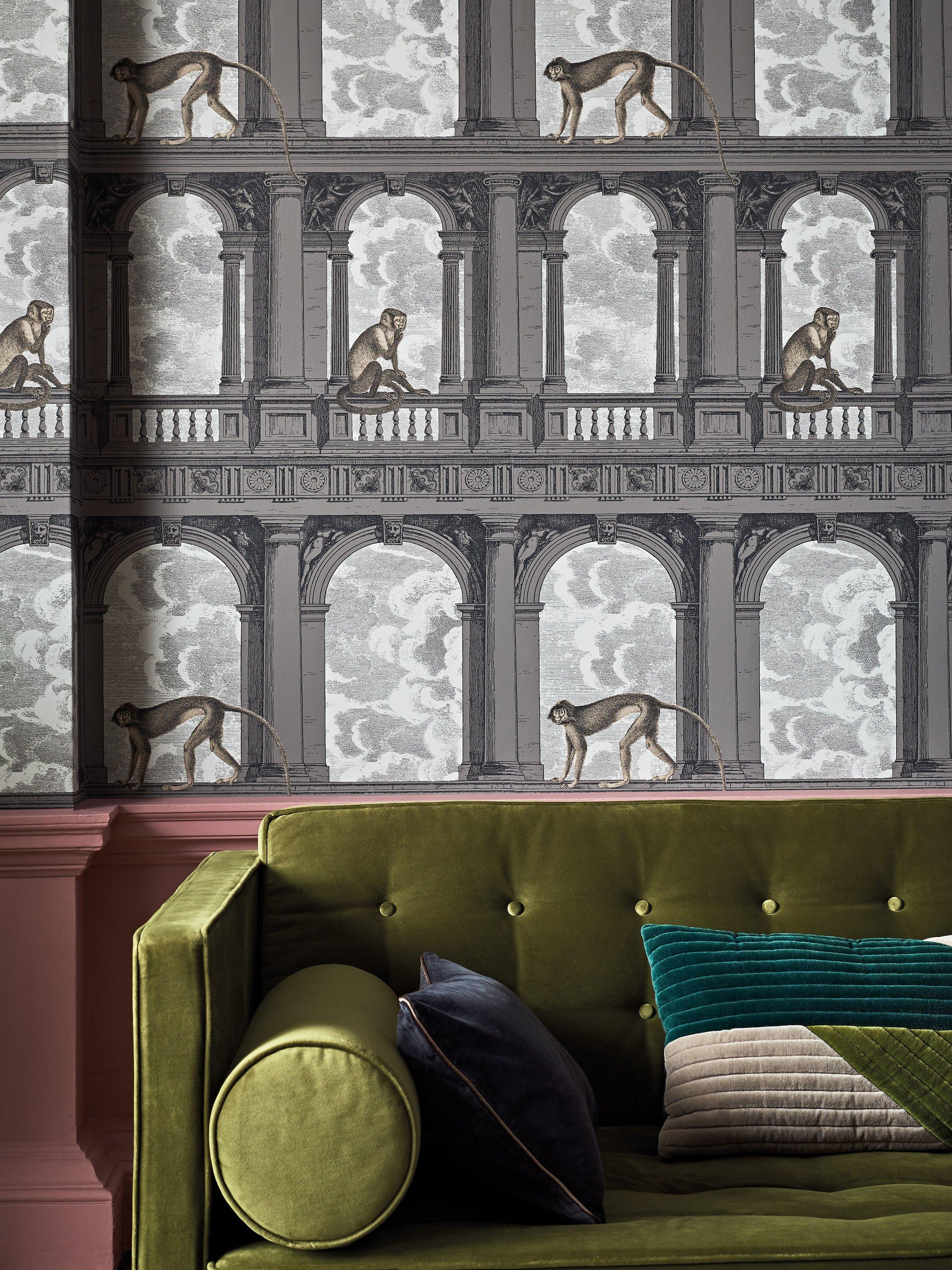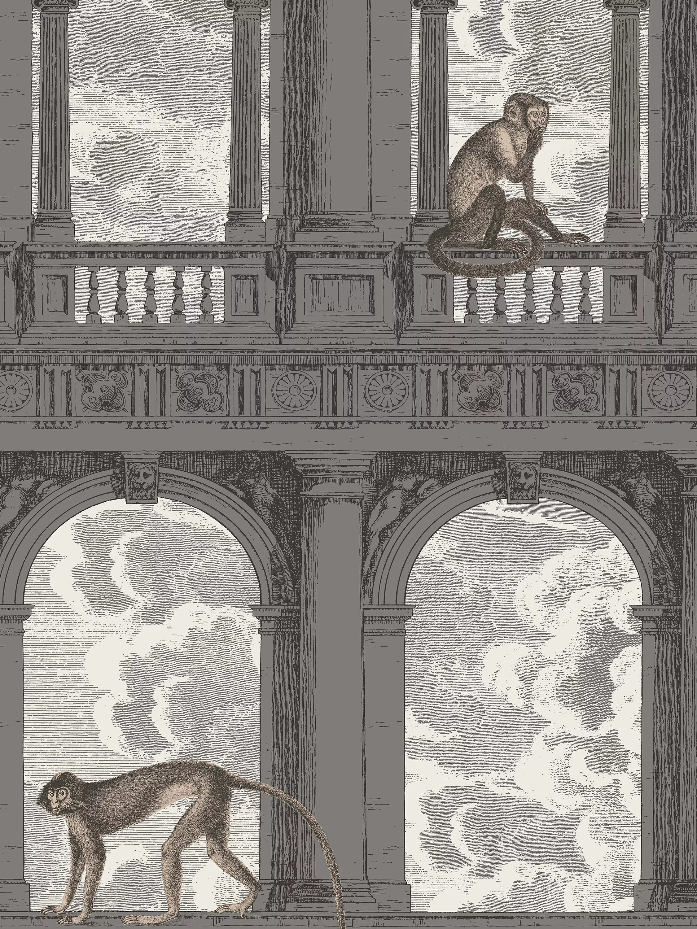 The Procuratie facades of St Mark s Square in Venice provides a primates' playground for these mischievous monkeys, wrapped around the classical arches and ornate balustrades. Drawn in a simple intaglio style, the timeless soft palette enhances the intricate line work without detracting from the design's stunning scene.