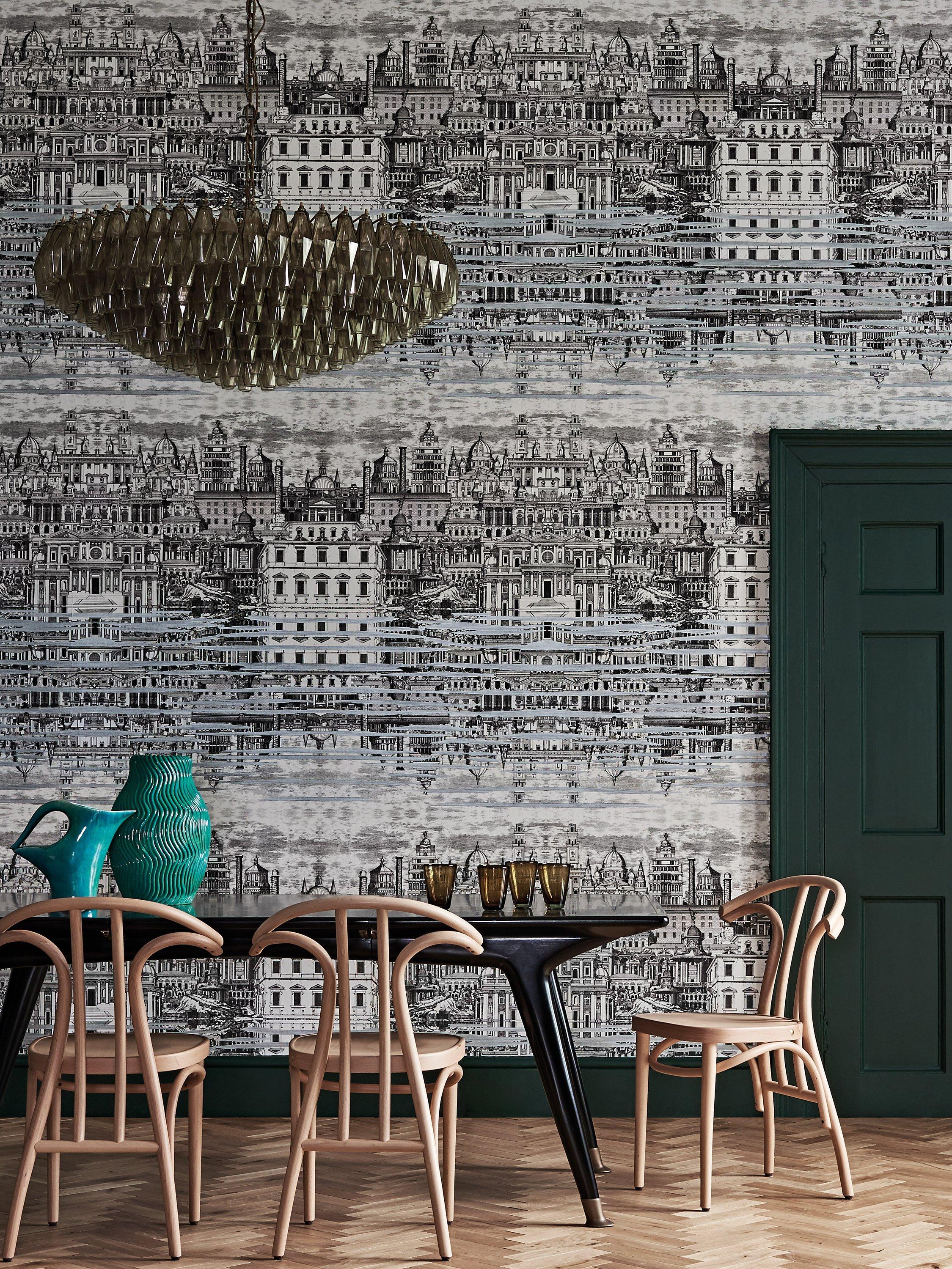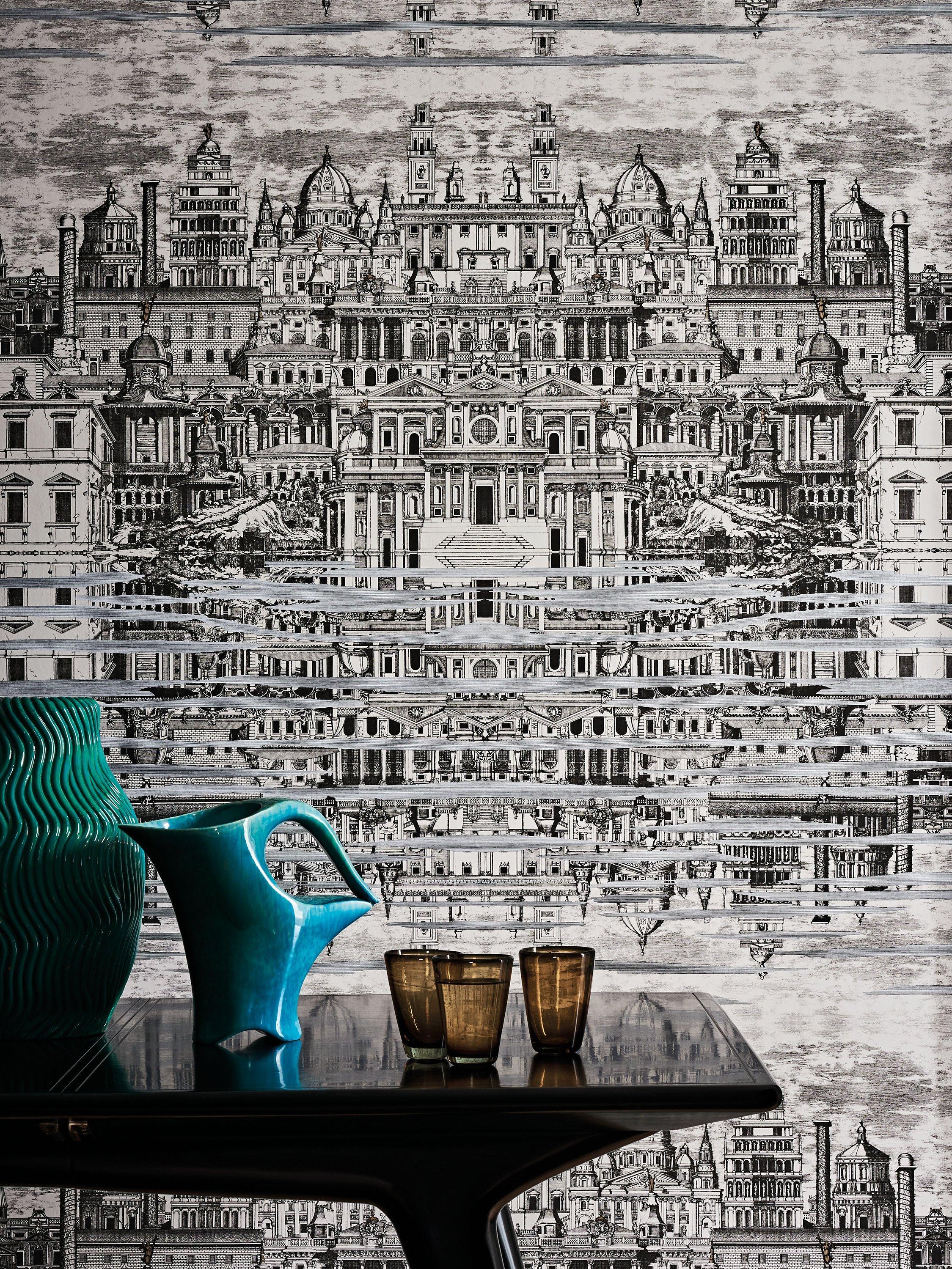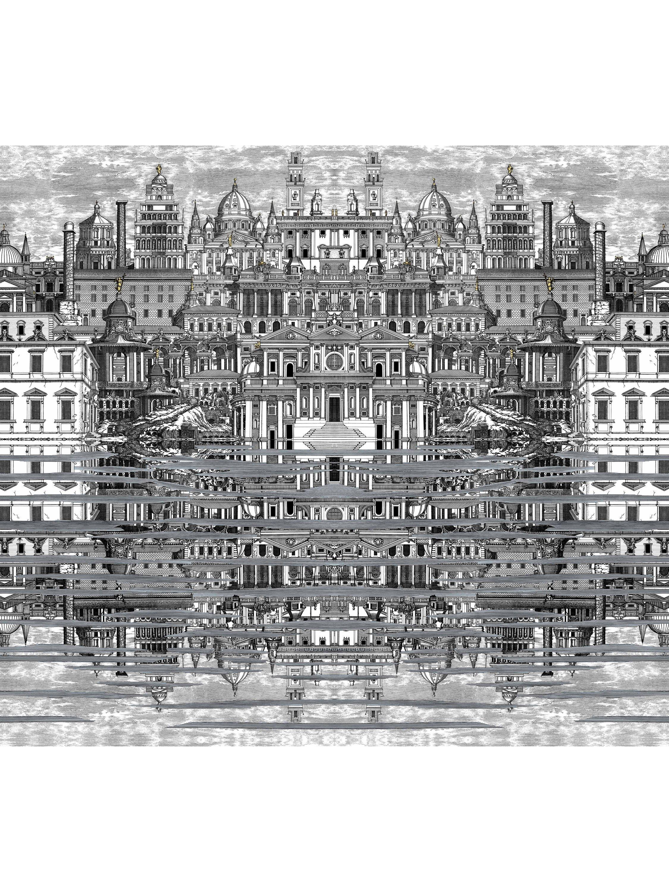 Riflesso is an atmospheric reflected depiction of Baroque Rome, as seen through Piero Fornasetti's surrealistic eye circa 1955. The right side is a mirror image of the left, with the scene reflected below in the water. Available in black and white with icy silvered highlights.