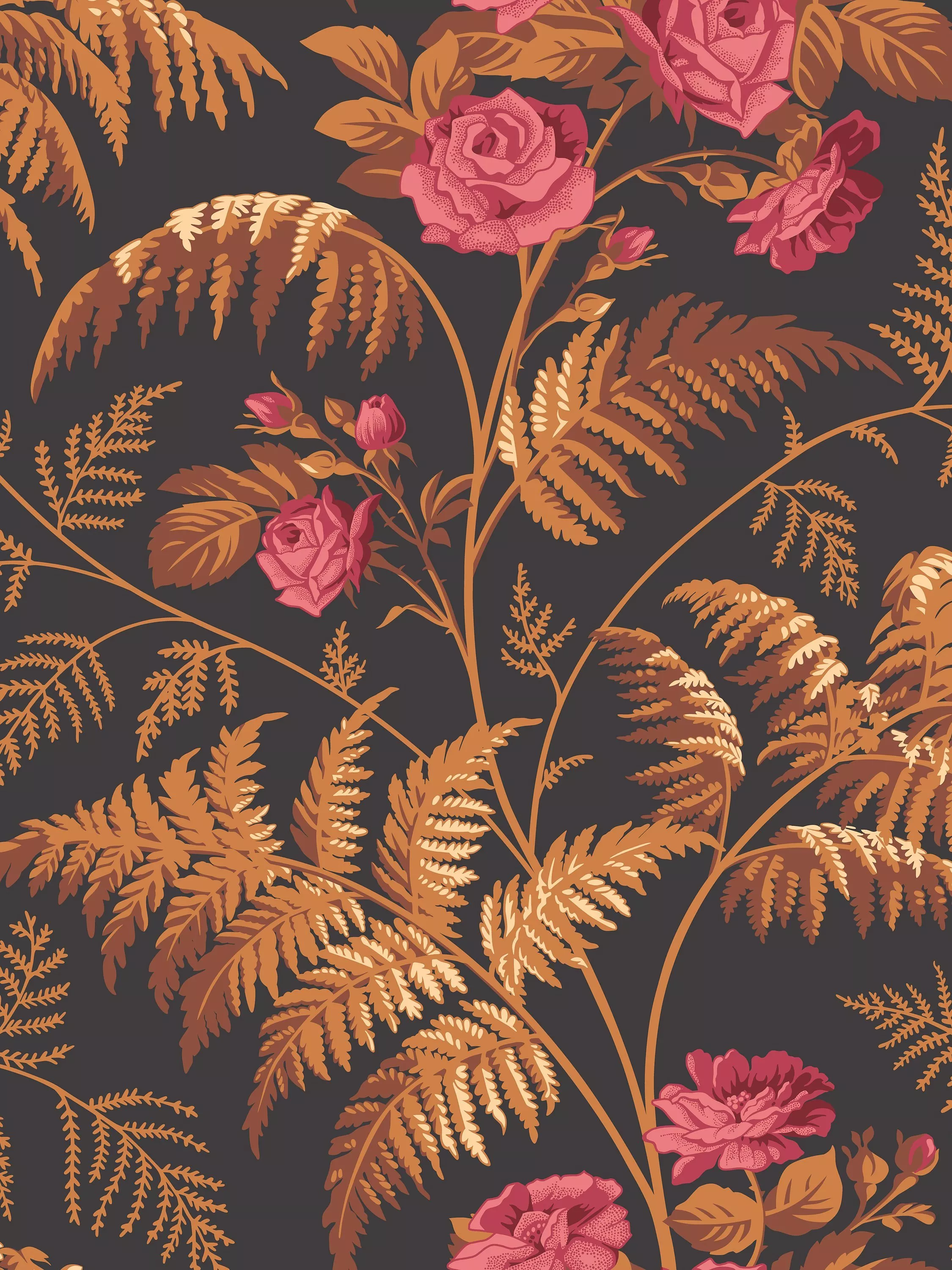This charming ogee trail design with lush, budding bouquets is surrounded by fern fronds, creating a richly organic, delicately detailed motif.
