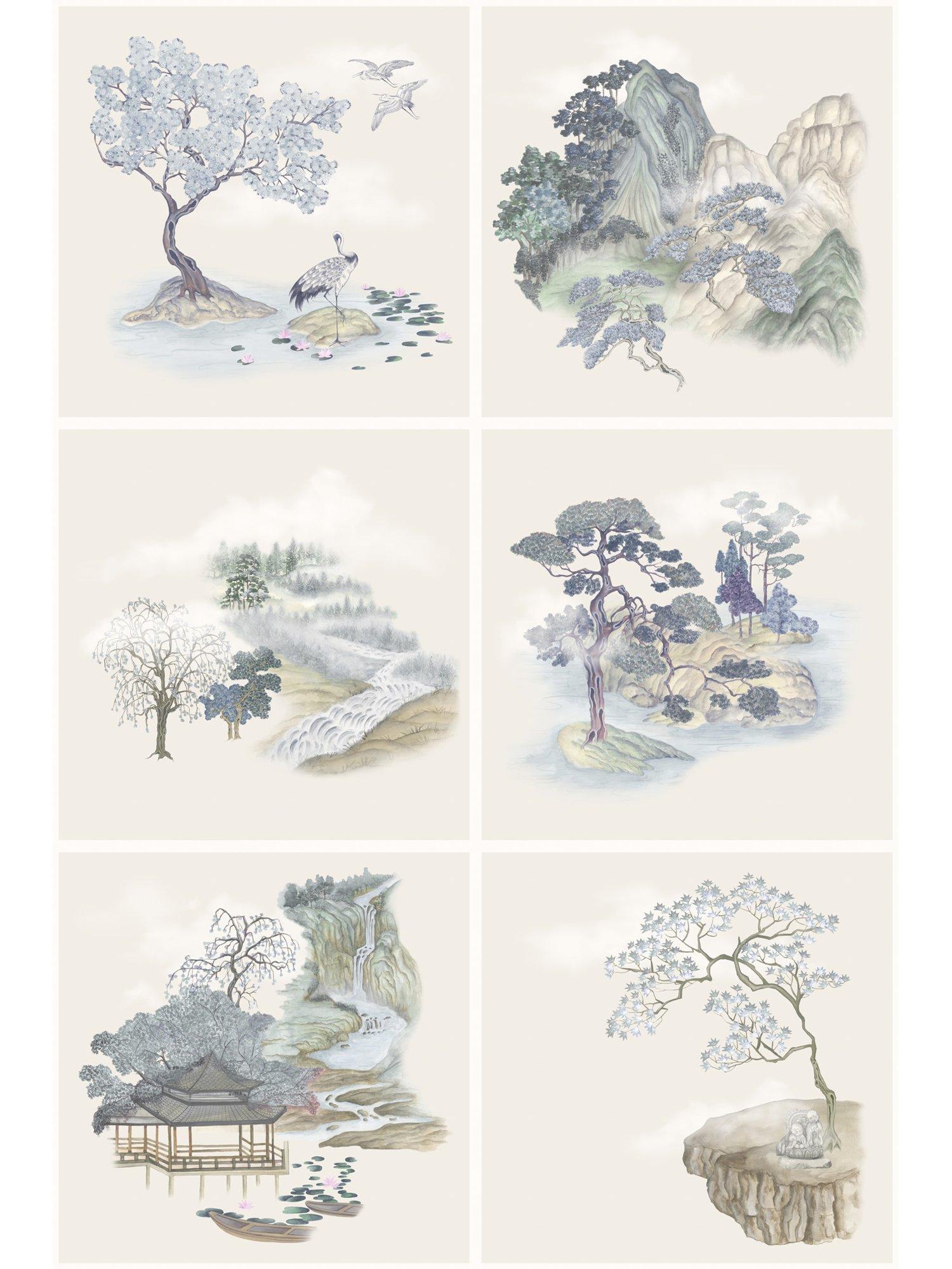 Connected to Cole & Son's Pavilion and Mountainscape wallpaper designs, Tile Toile depicts key scenes that were inspired by the beautiful landscapes of Silver Pavilion in Kyoto. The tile-like structure of the design mirrors traditional Japanese wall art and flirts with a Toile de Jouy. Each tile depicts a still life scene, however when viewed as one, it tells a harmonious story of the historical gardens.