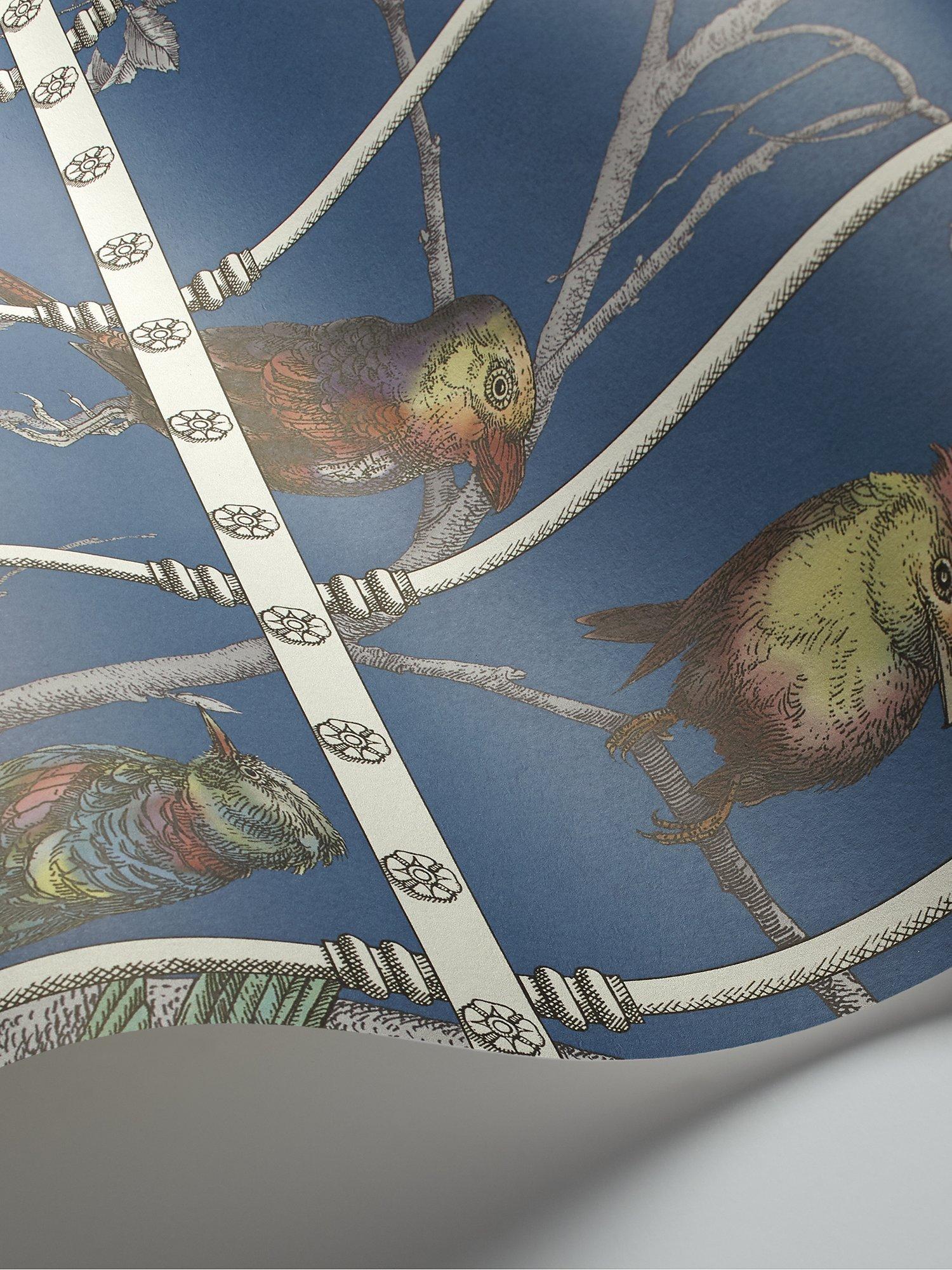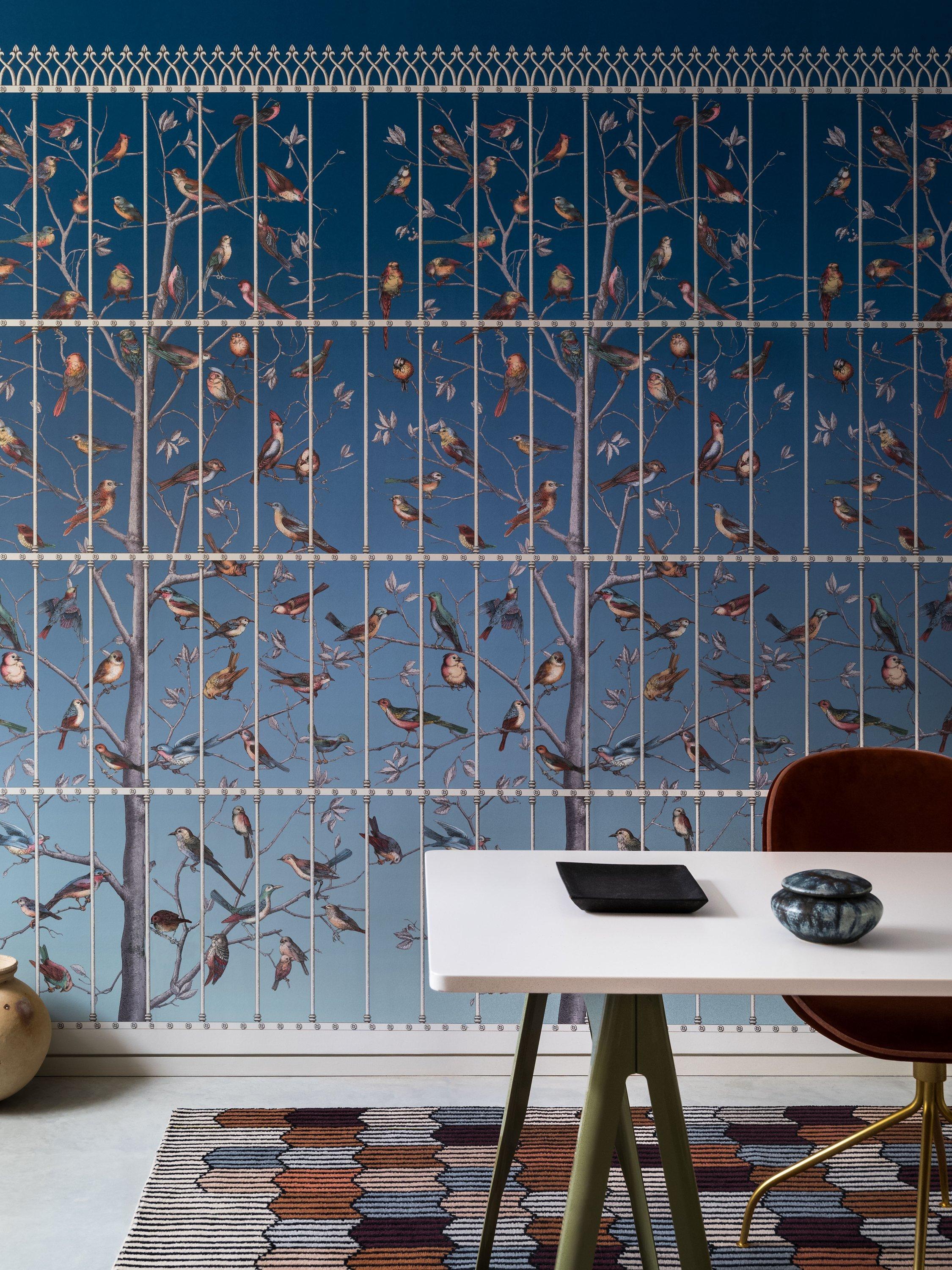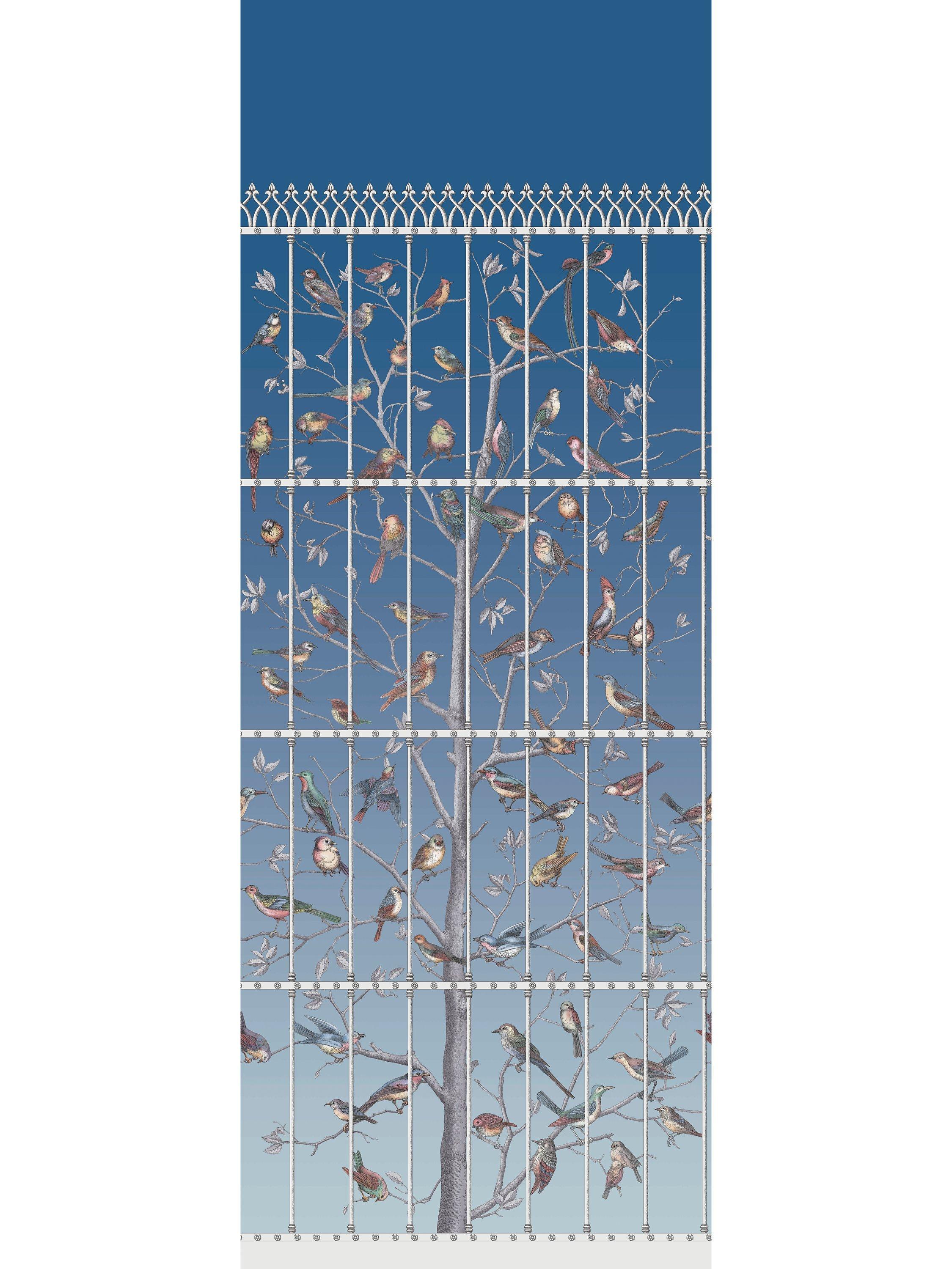 Since translated to a beautifully intricate wall covering panel design, this delicate motif brings an ornate quality to a stand-alone feature wall or, used in repeat, creates a stunning aviary rich in detail and colour.