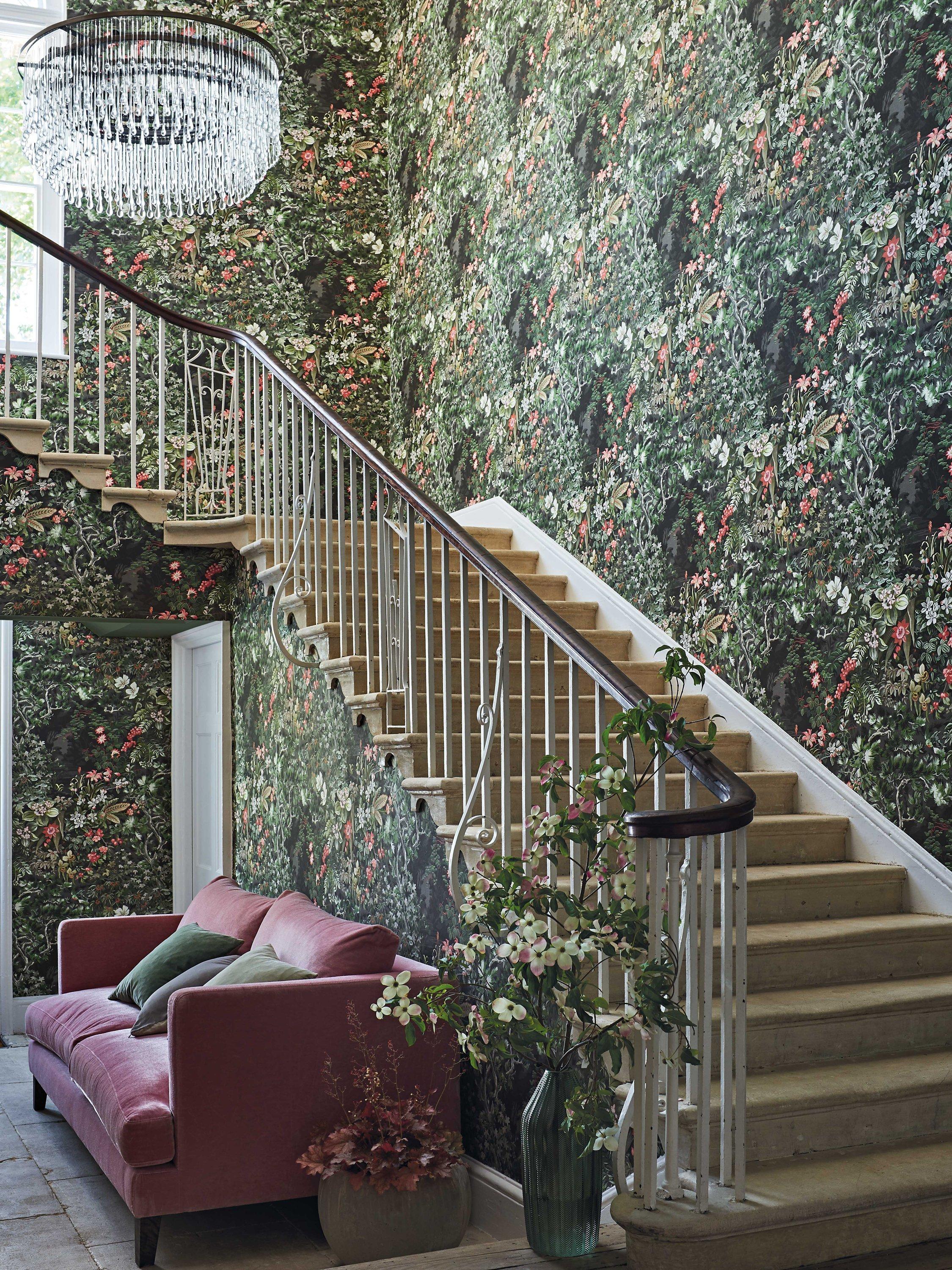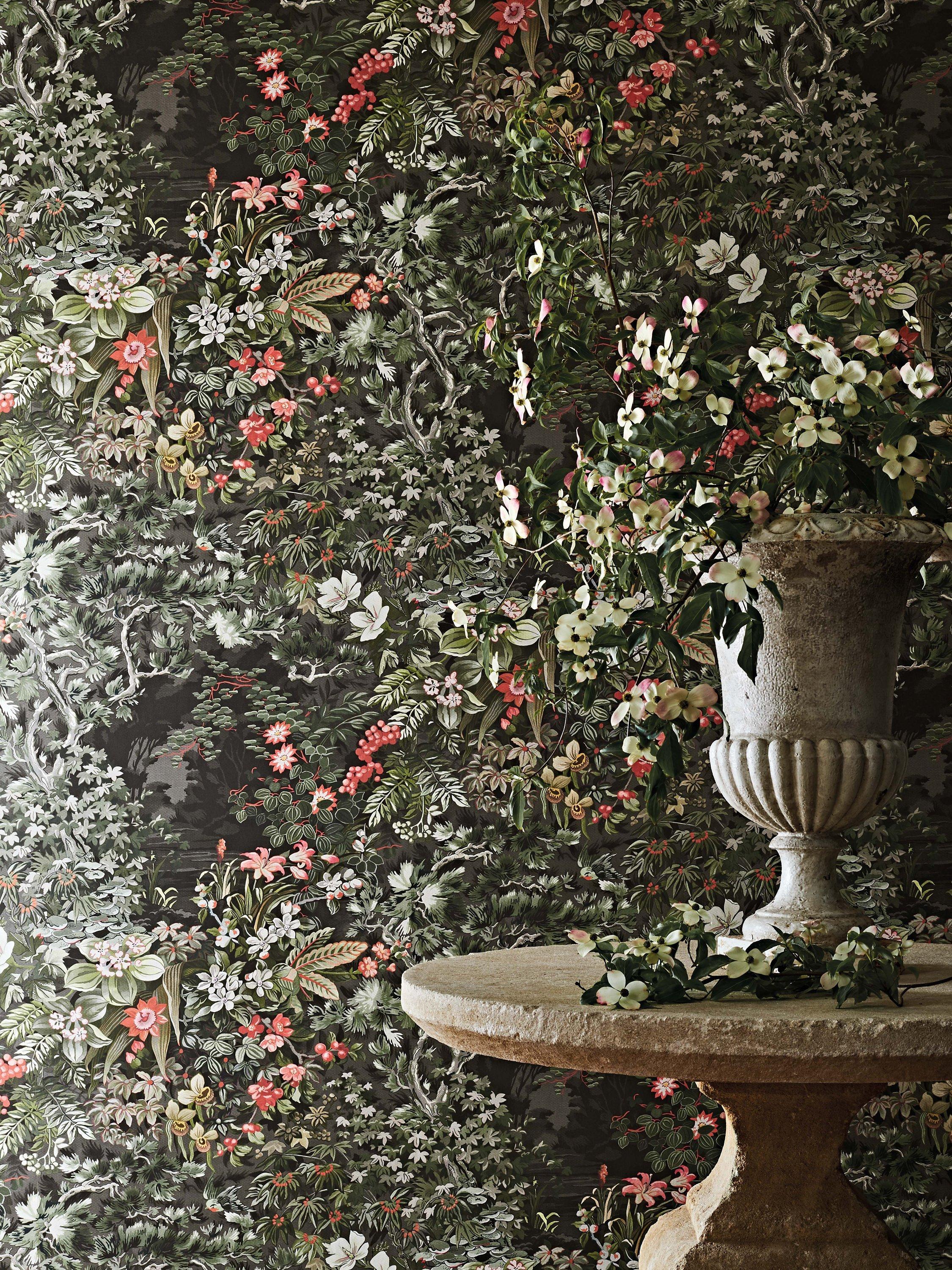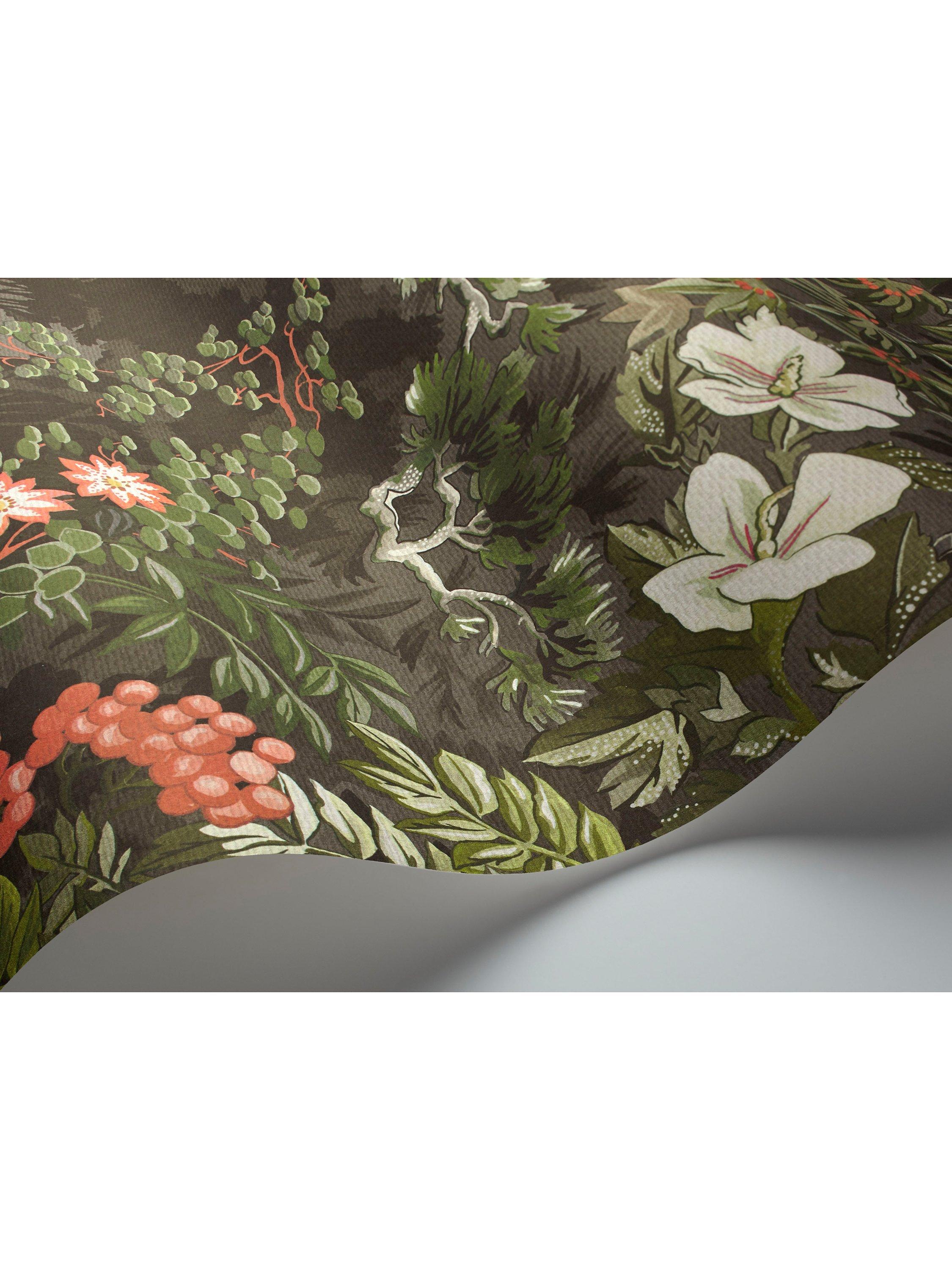 The Cole & Son studio have taken a beguiling scene, weaving familiar woodland themes to create a rich tapestry design, large in scale and engrossing in detail, in archival tones of vivid coral, contrasted with understated olive and charcoal.