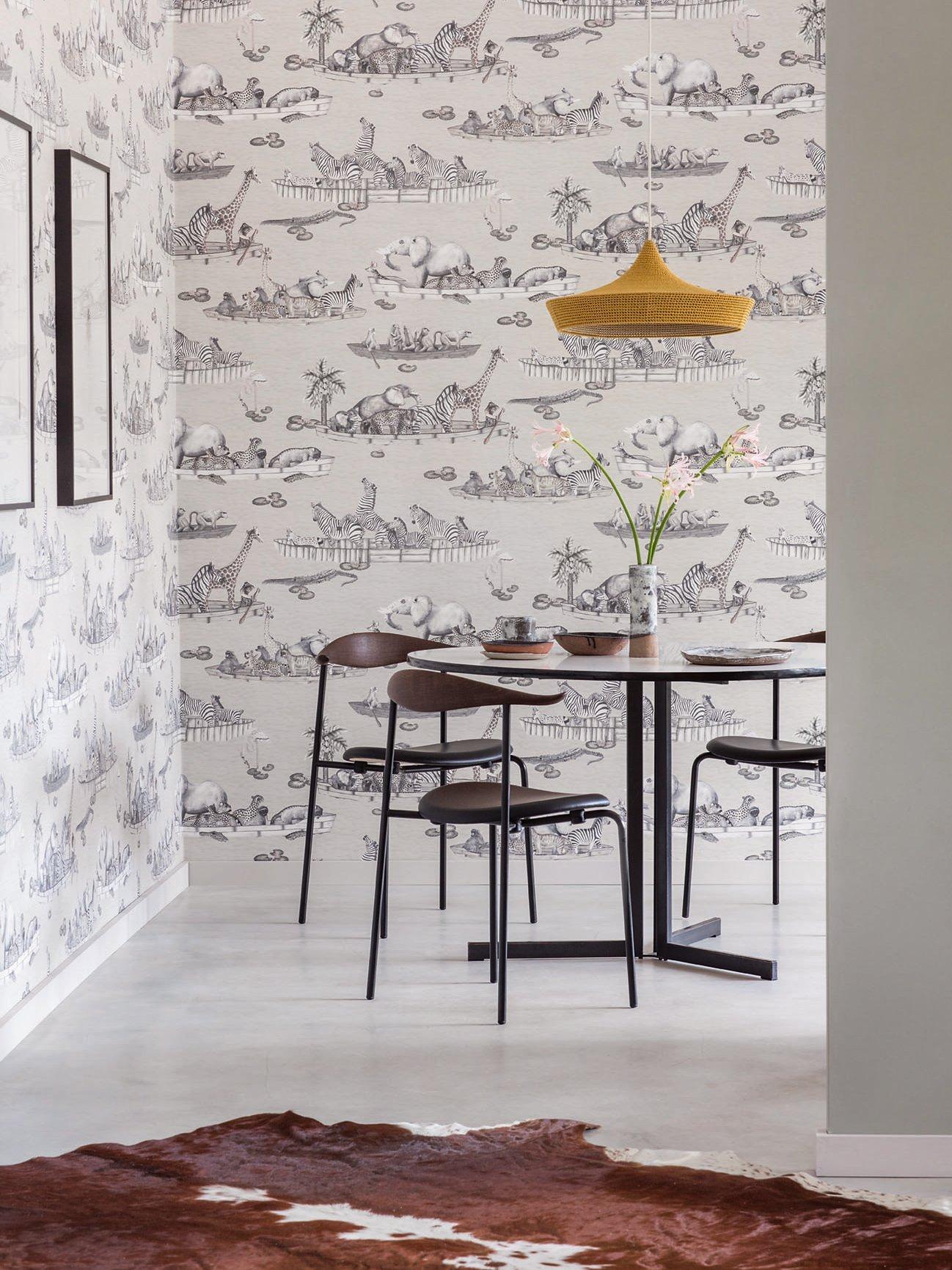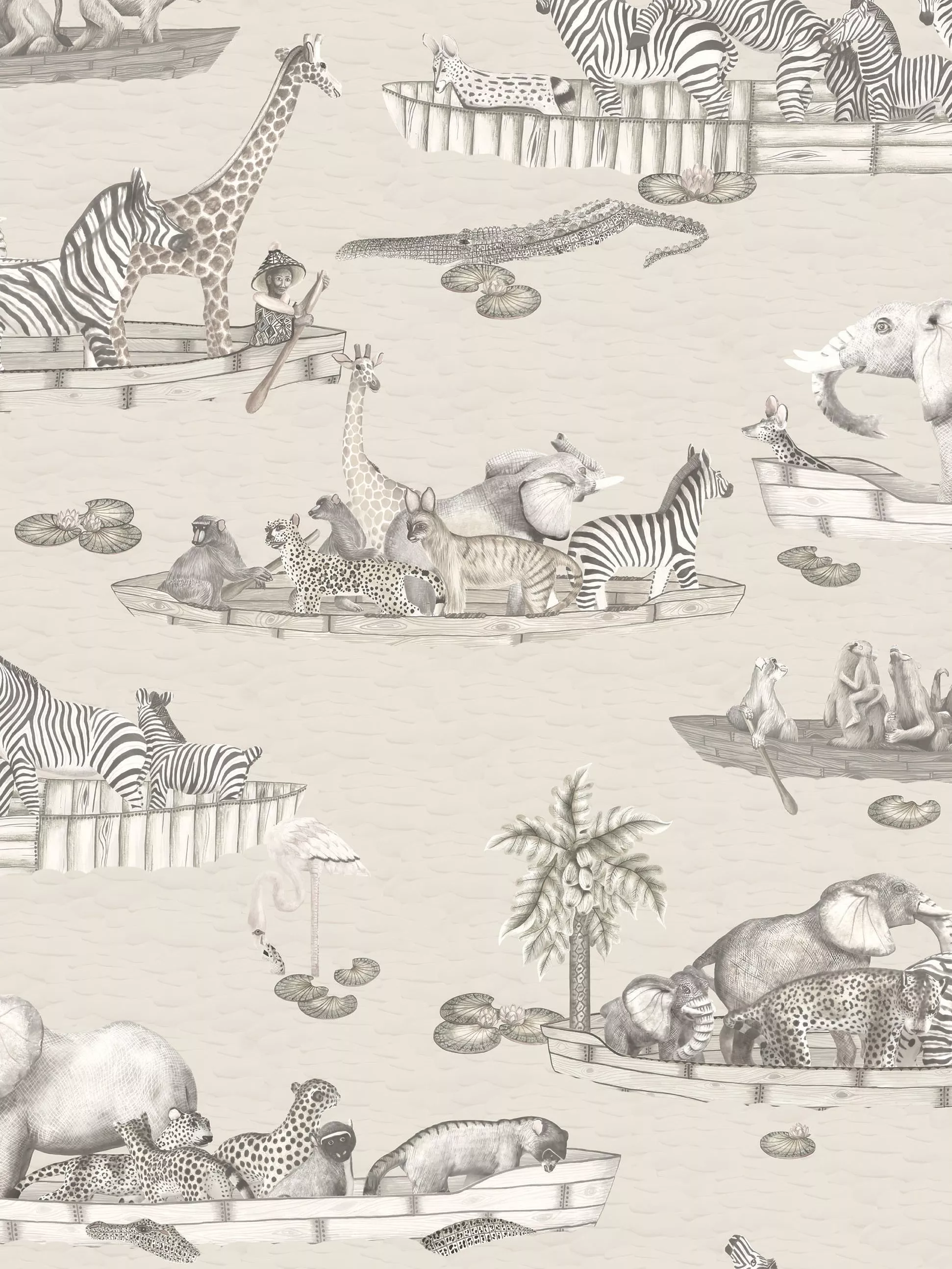 Zambezi features a flotilla of boats, captained by an array of animals, all floating gently down the Zambezi river in Zimbabwe. Inspired by Operation Noah, a mission led by people in boats to save drowning animals when the Zambezi flooded in the 1960s, this delightful wallpaper will be loved by children and adults alike.