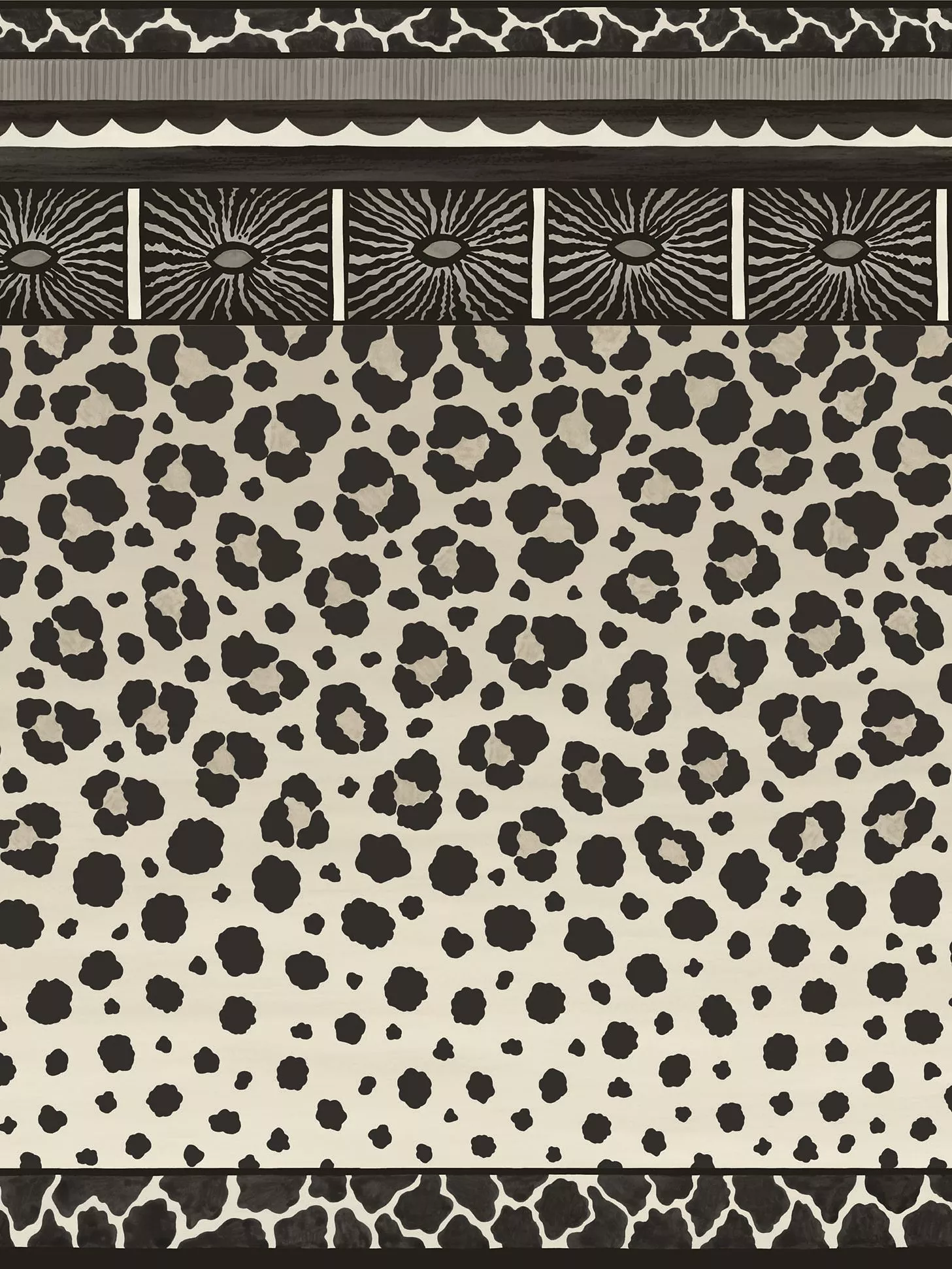Inspired by the pedestal base of a ceramic vase, this striking leopard spot border design has been created to be hung horizontally around the base of a wall but as a further option it can be hung vertically, as a reverse match, to create a dramatic and opulent wide graduated stripe.