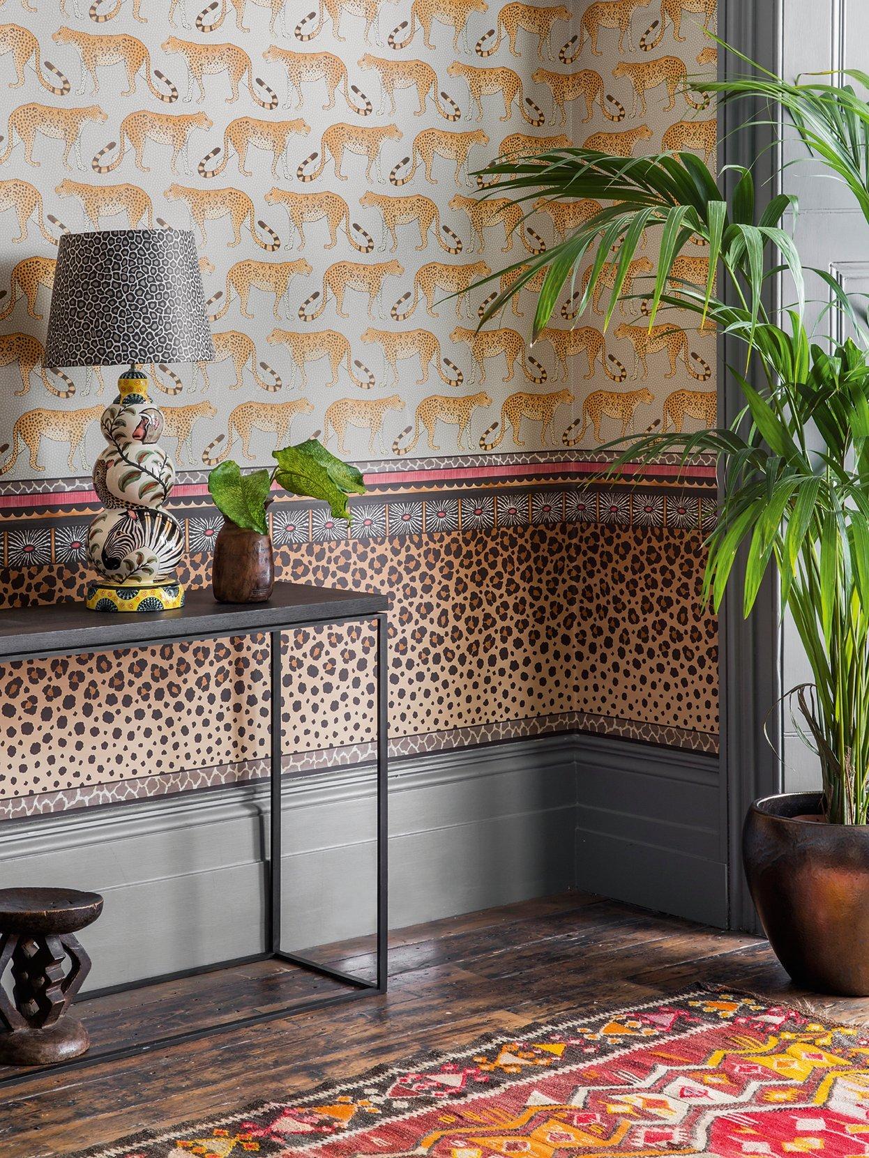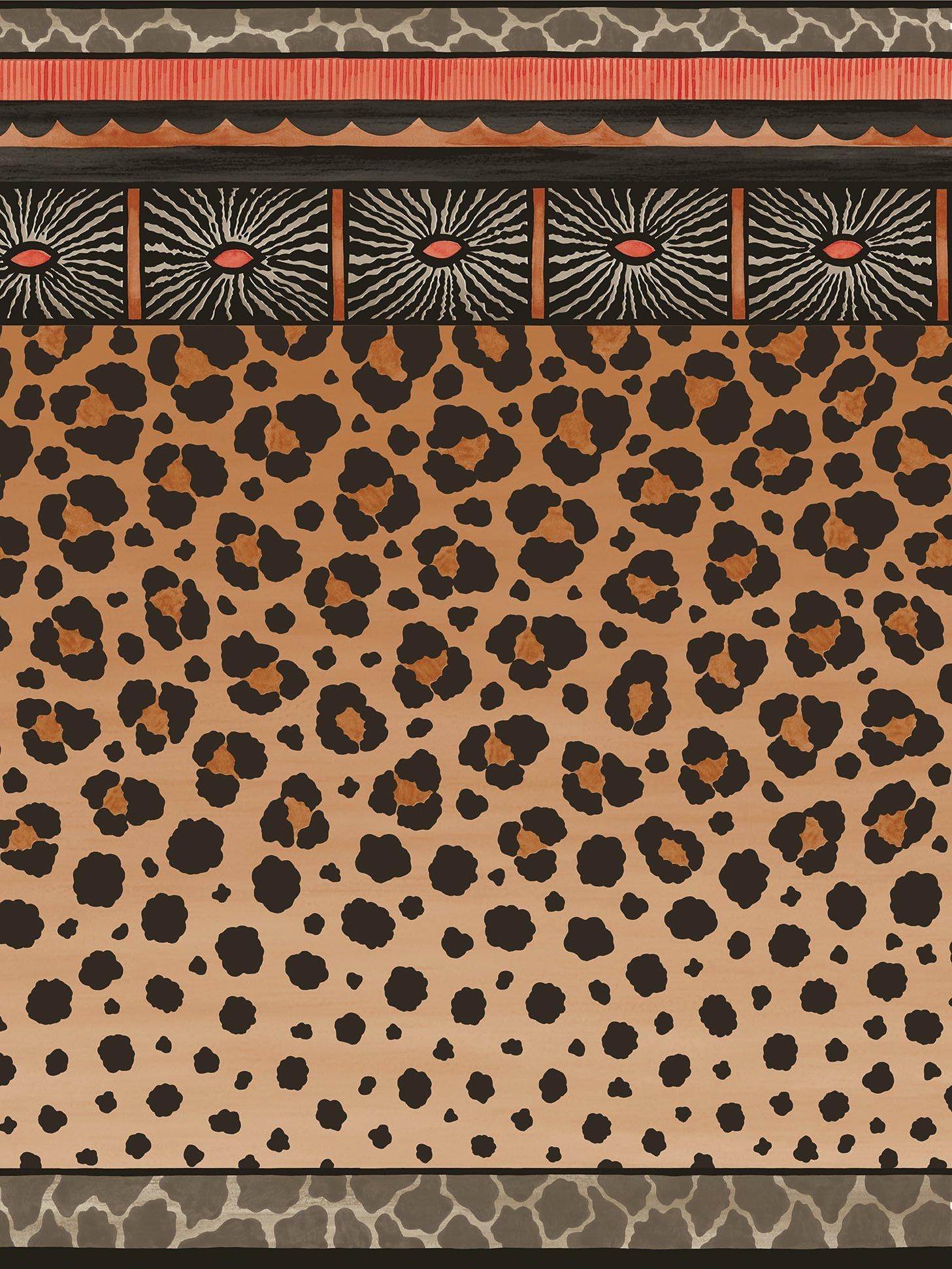 Inspired by the pedestal base of a ceramic vase, this striking leopard spot border design has been created to be hung horizontally around the base of a wall but as a further option it can be hung vertically, as a reverse match, to create a dramatic and opulent wide graduated stripe.