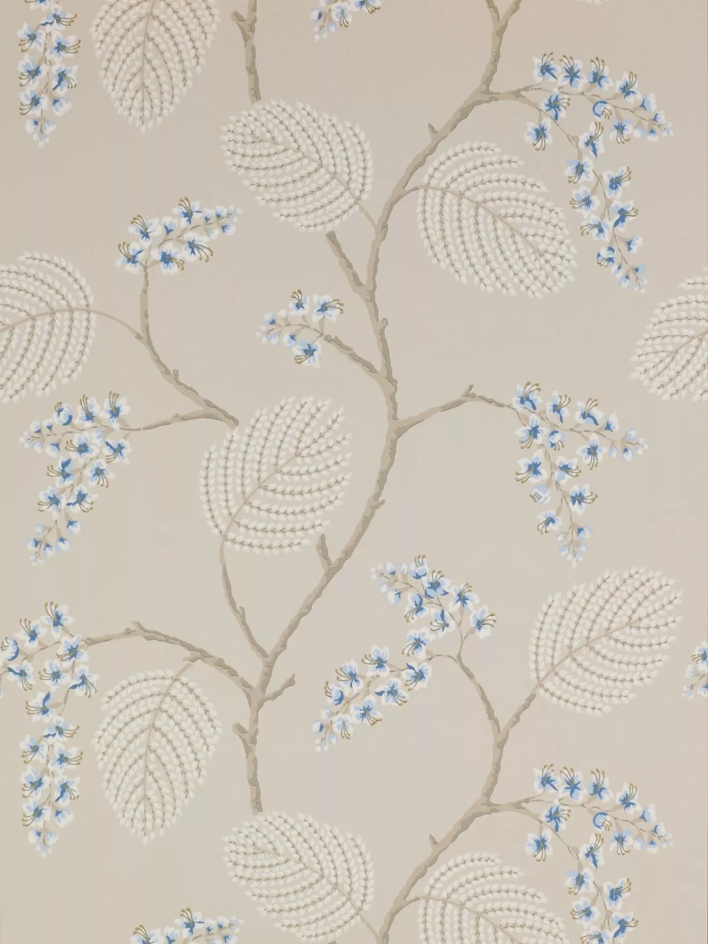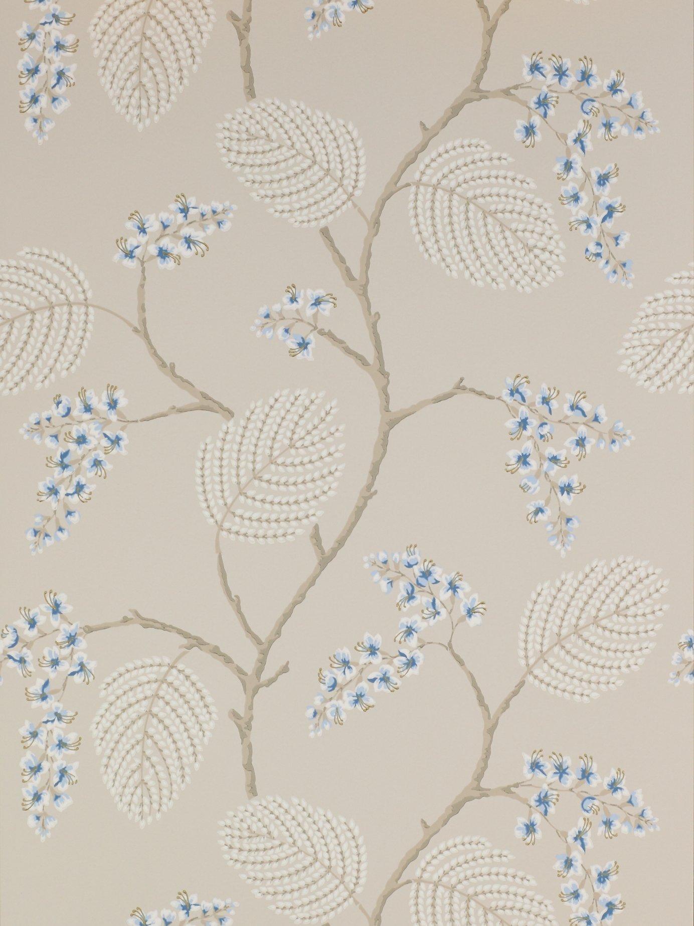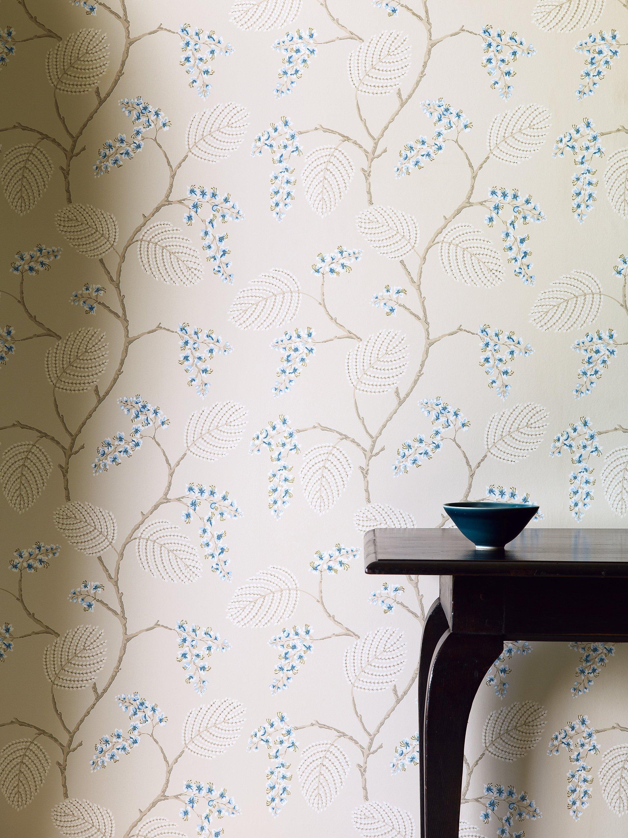 The delicate stylised fronds of a frangipani tree, combined with accents of colour in the flowers, make this an appealing wallpaper.