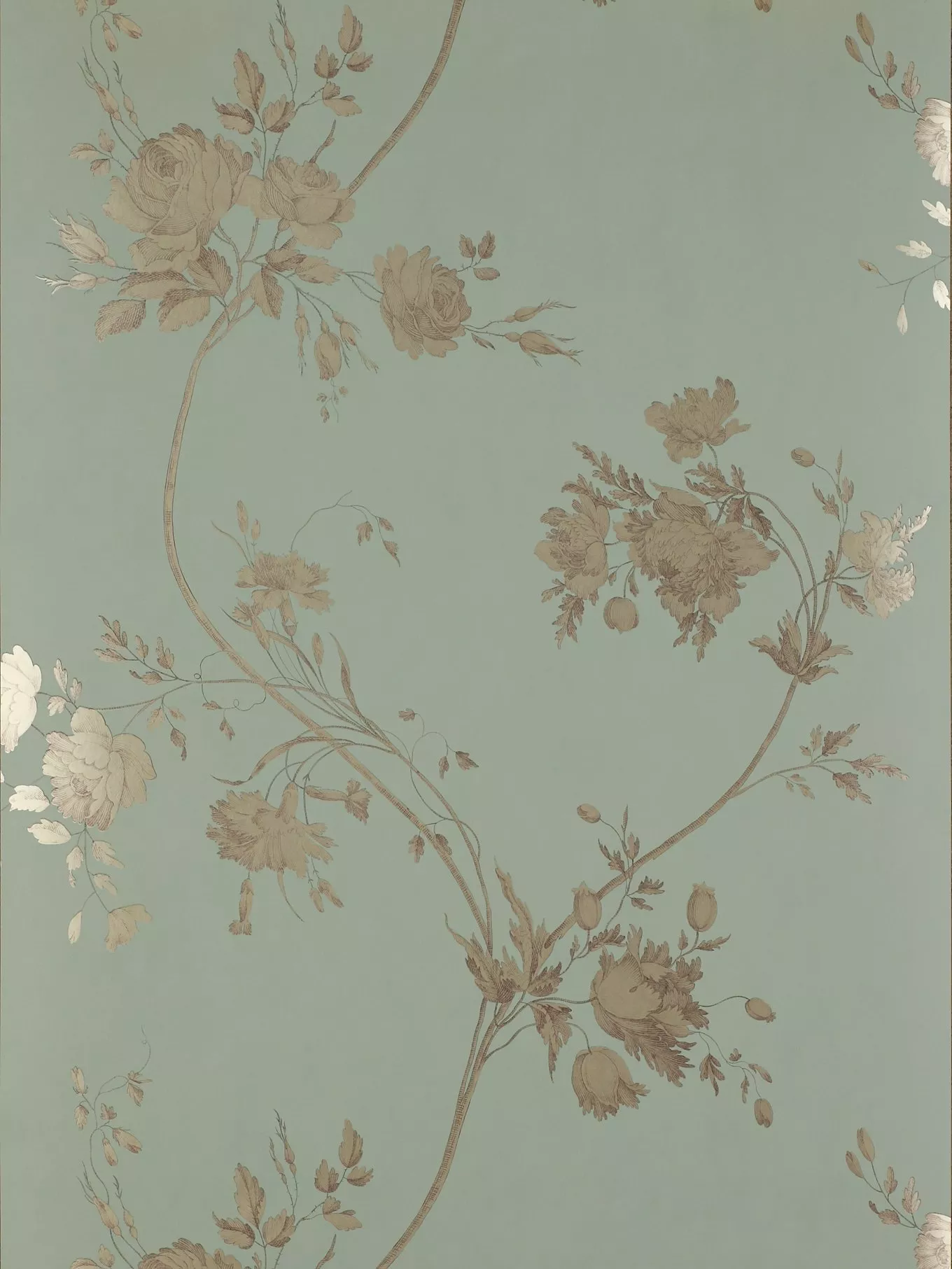 An elegant paper inspired by a design discovered in the Bromley Hall pattern book held in the Victoria and Albert Museum. A fine toile of delicate trailing roses, on a soft textured ground, with a foxed mirror effect.