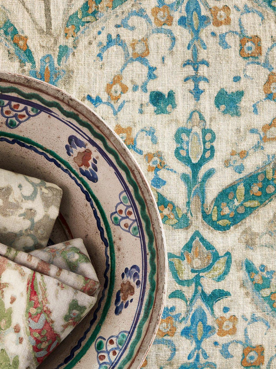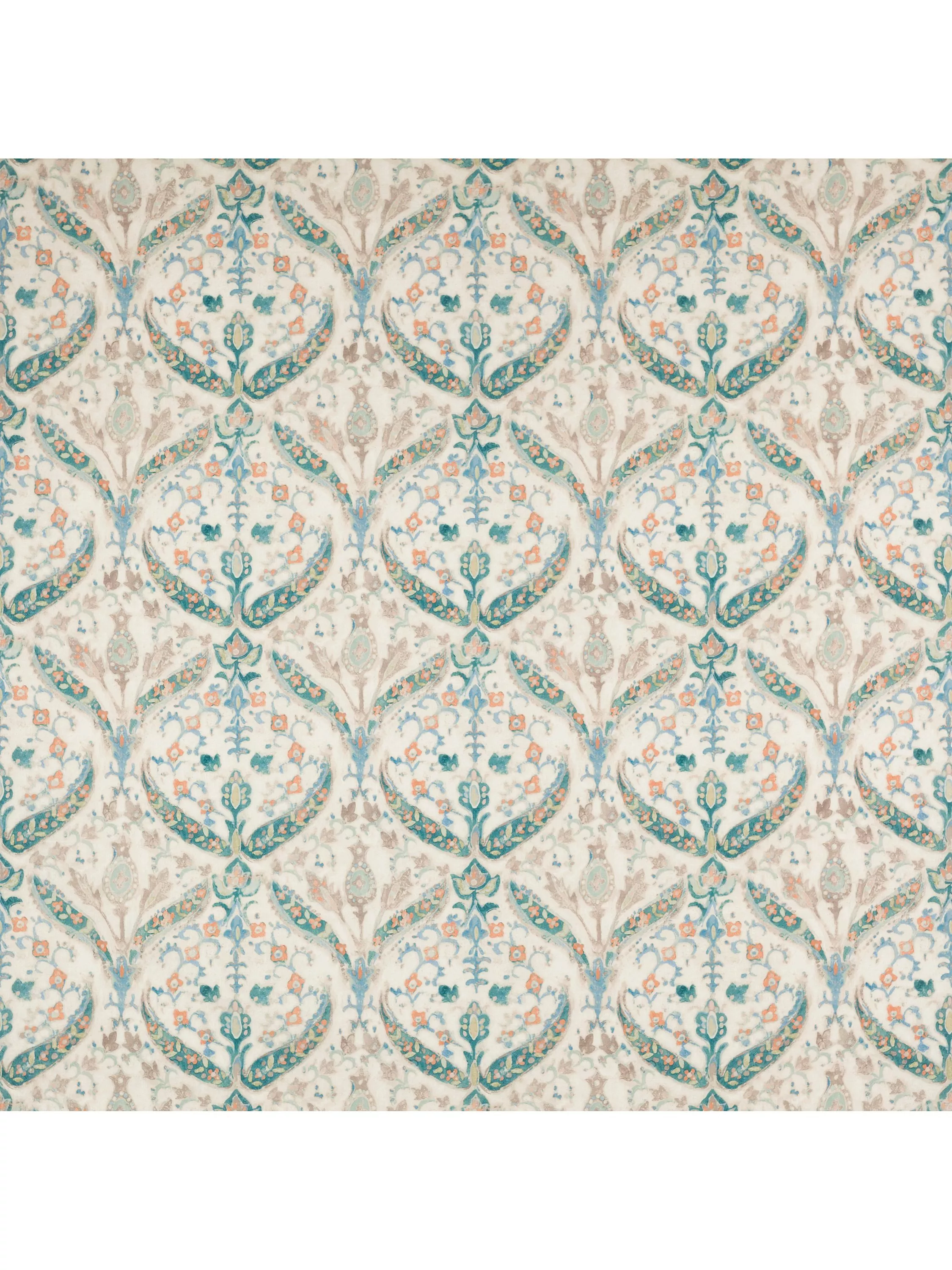 A print influenced by Persian tiles and decorative imagery featuring stylised floral and paisley motifs in an ogee pattern, Yasamin has a pleasantly relaxed character. The design is loosely interpreted with techniques developed from hand painted batik work, which gives it a charming informality featuring glowing jewel colours on neutral grounds.