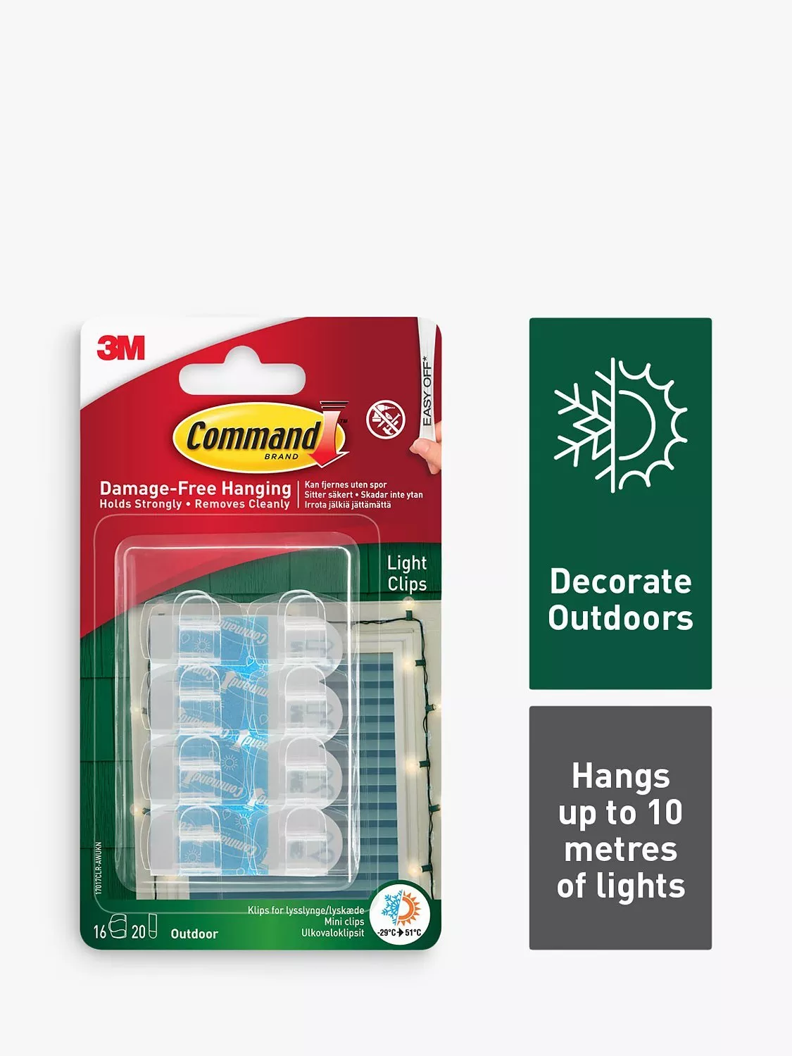 A pack of 16 outdoor light clips and small outdoor strips, an innovative and damage-free solution for hanging lights in your garden and other outdoor places securely. They hold strongly and remove cleanly using Command's 3M stretch-release technology. This pack hangs up to 10 metres of outdoor lights.