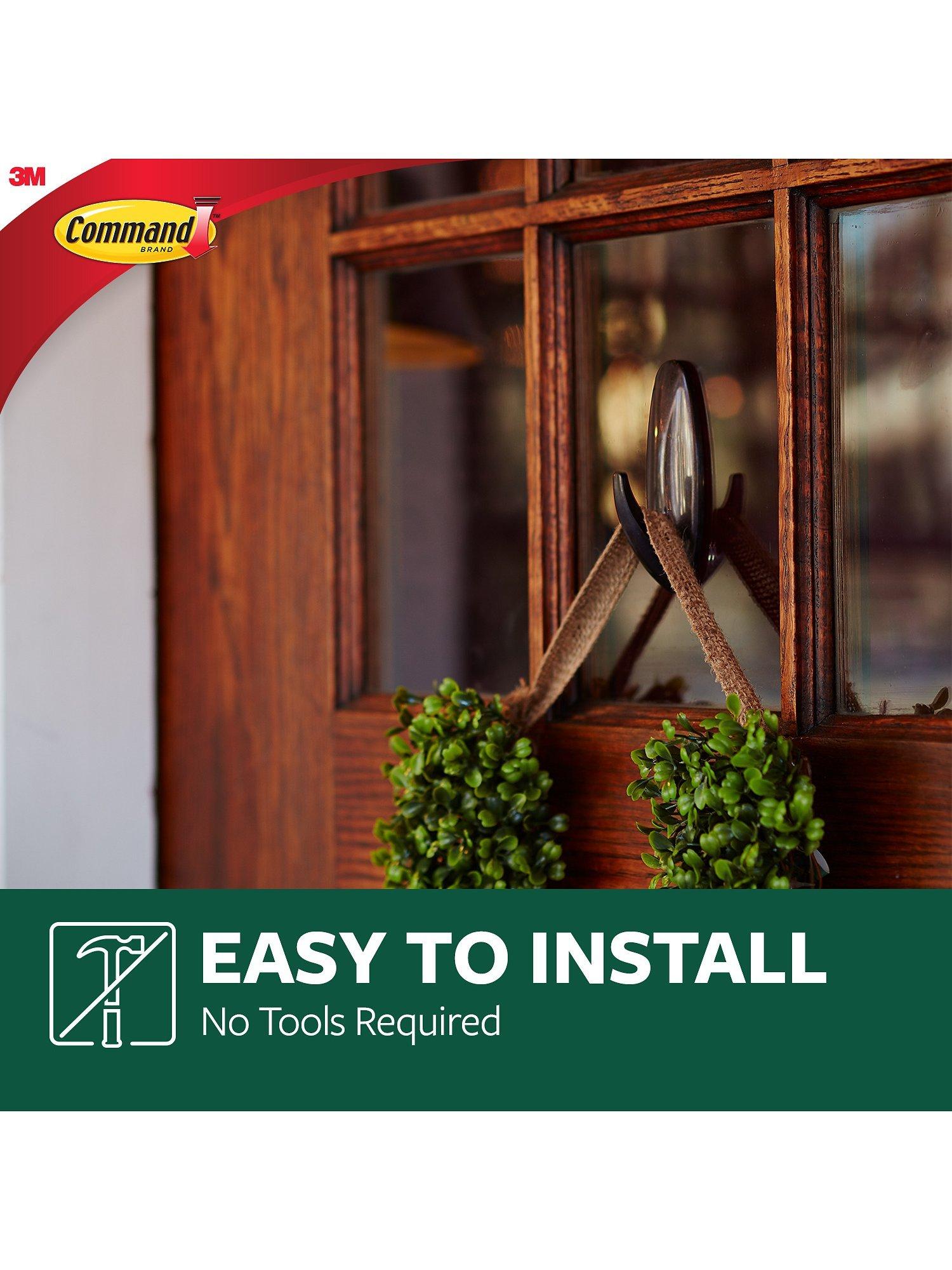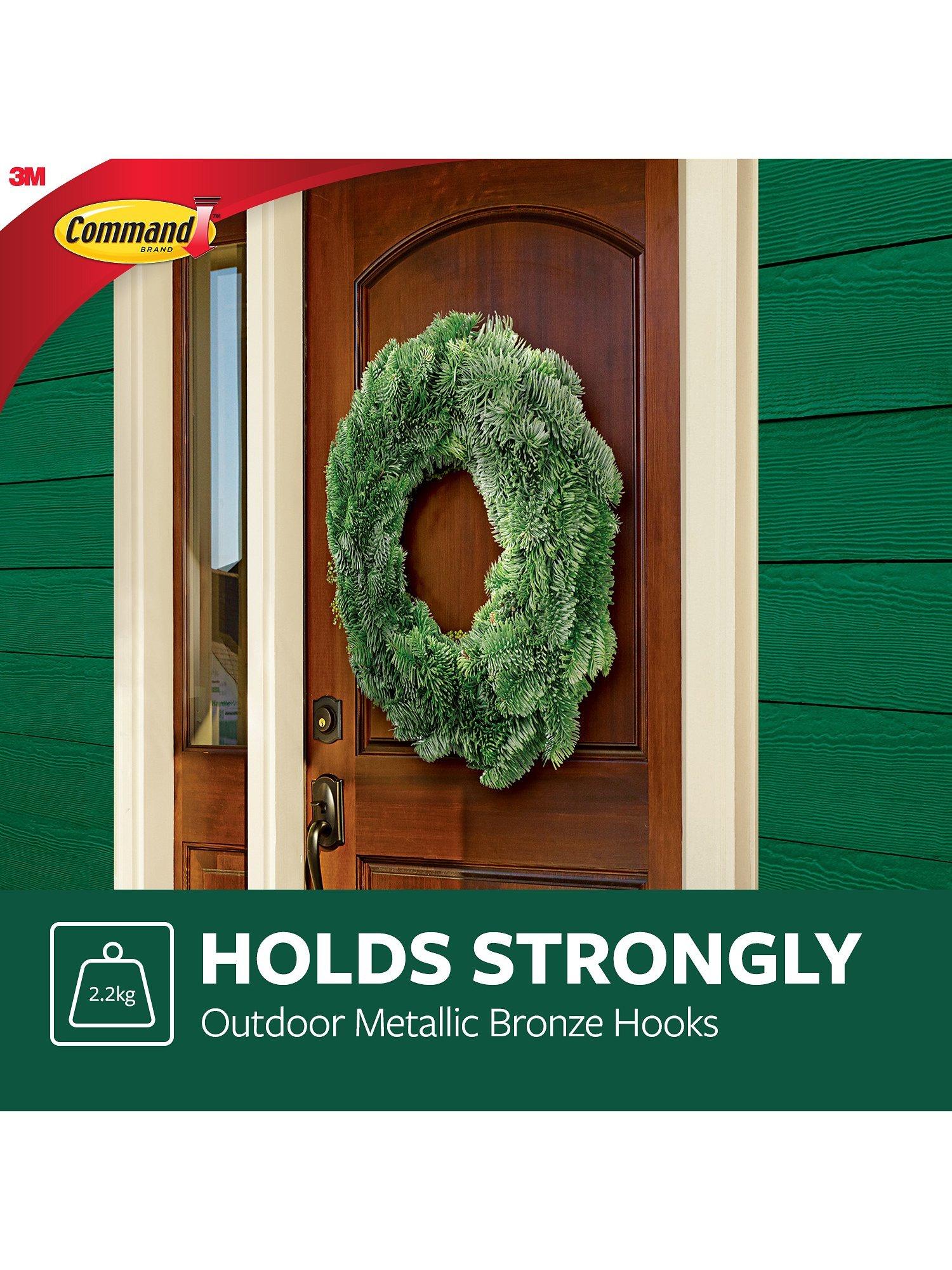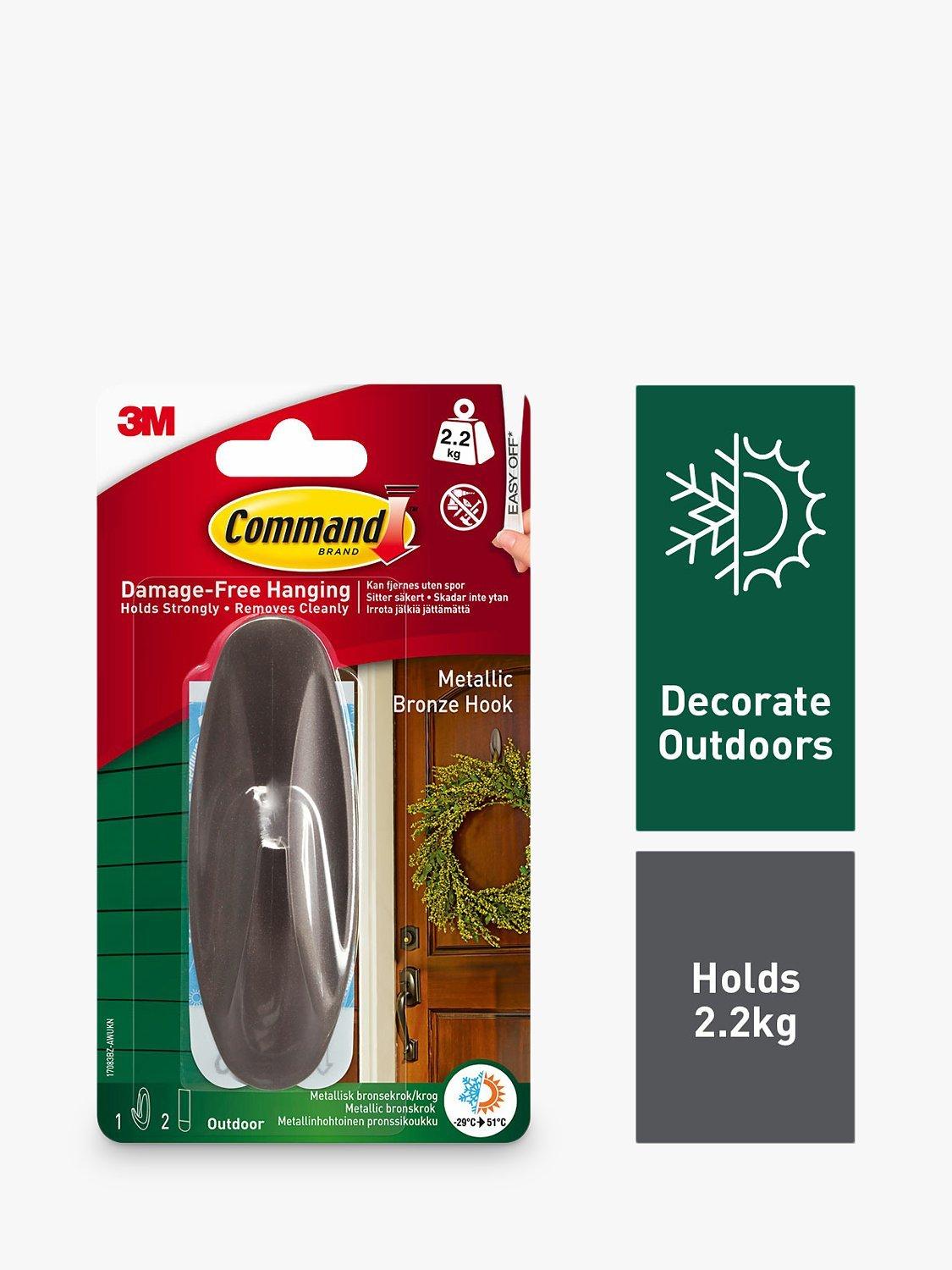 This pack contains a metal hanging hook with a bronze finish, for hanging outdoor wreaths, signs and other objects securely and damage-free. It holds strongly and removes cleanly using Command's 3M stretch-release technology. The pack includes one metal hook and two large strips for outdoor use. The hook holds up to 2.2kg.