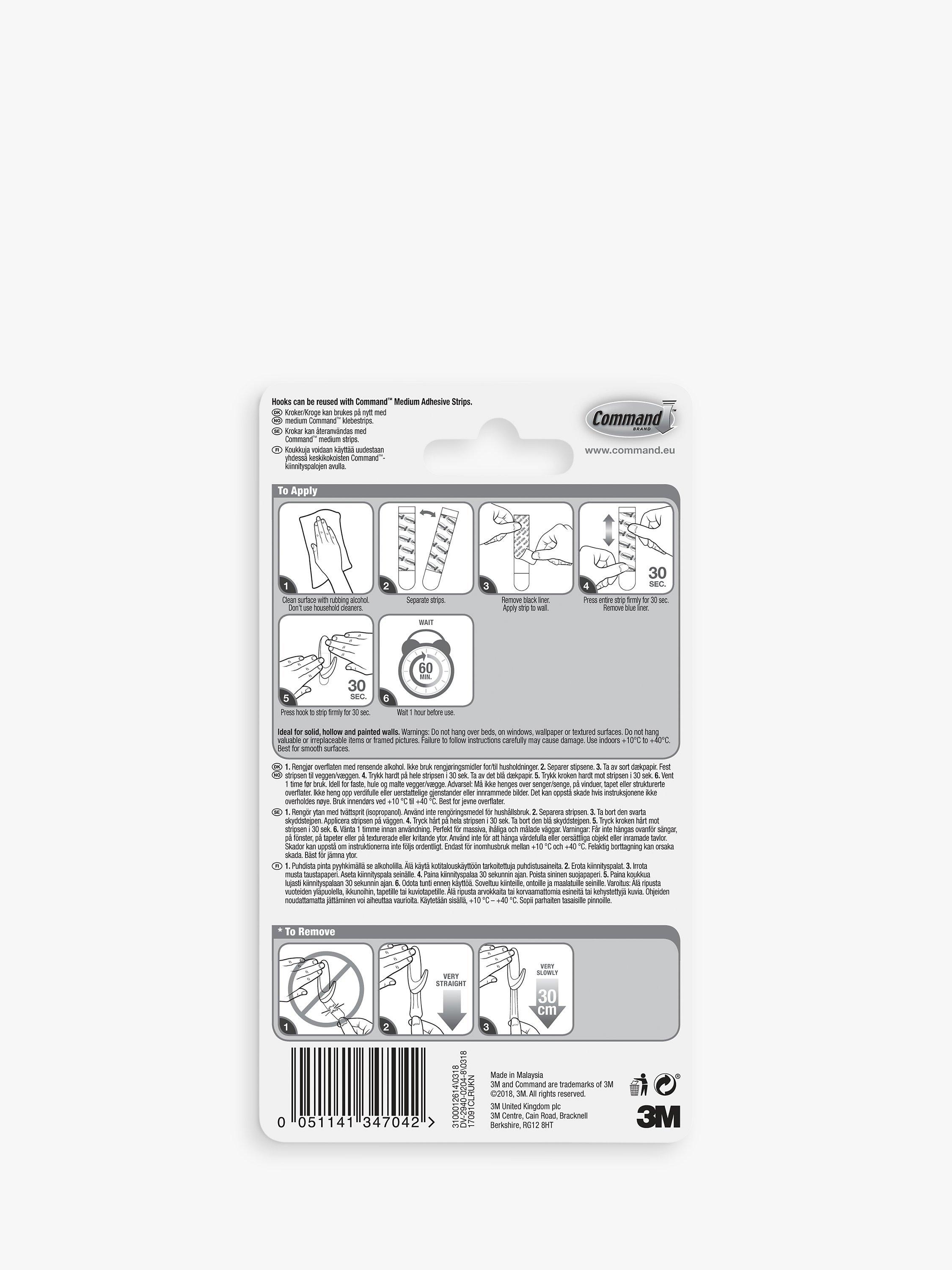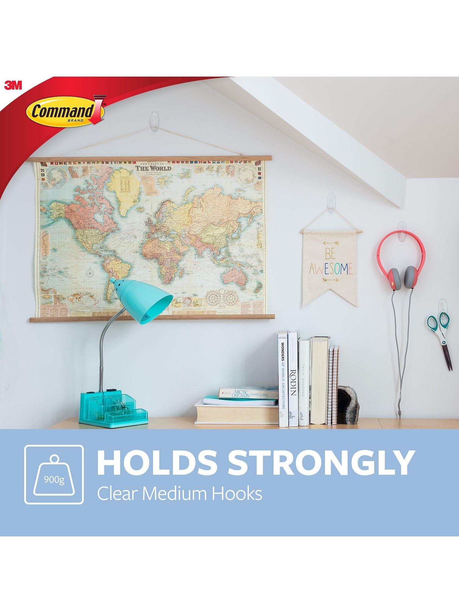 Command™ Medium Clear Hooks with Clear Strips are an innovative solution for hanging accessories, seasonal decor, cleaning tools and other medium-weight objects securely and damage-free. They hold strongly and remove cleanly using 3M stretch-release technology. Each hook holds up to 900g.