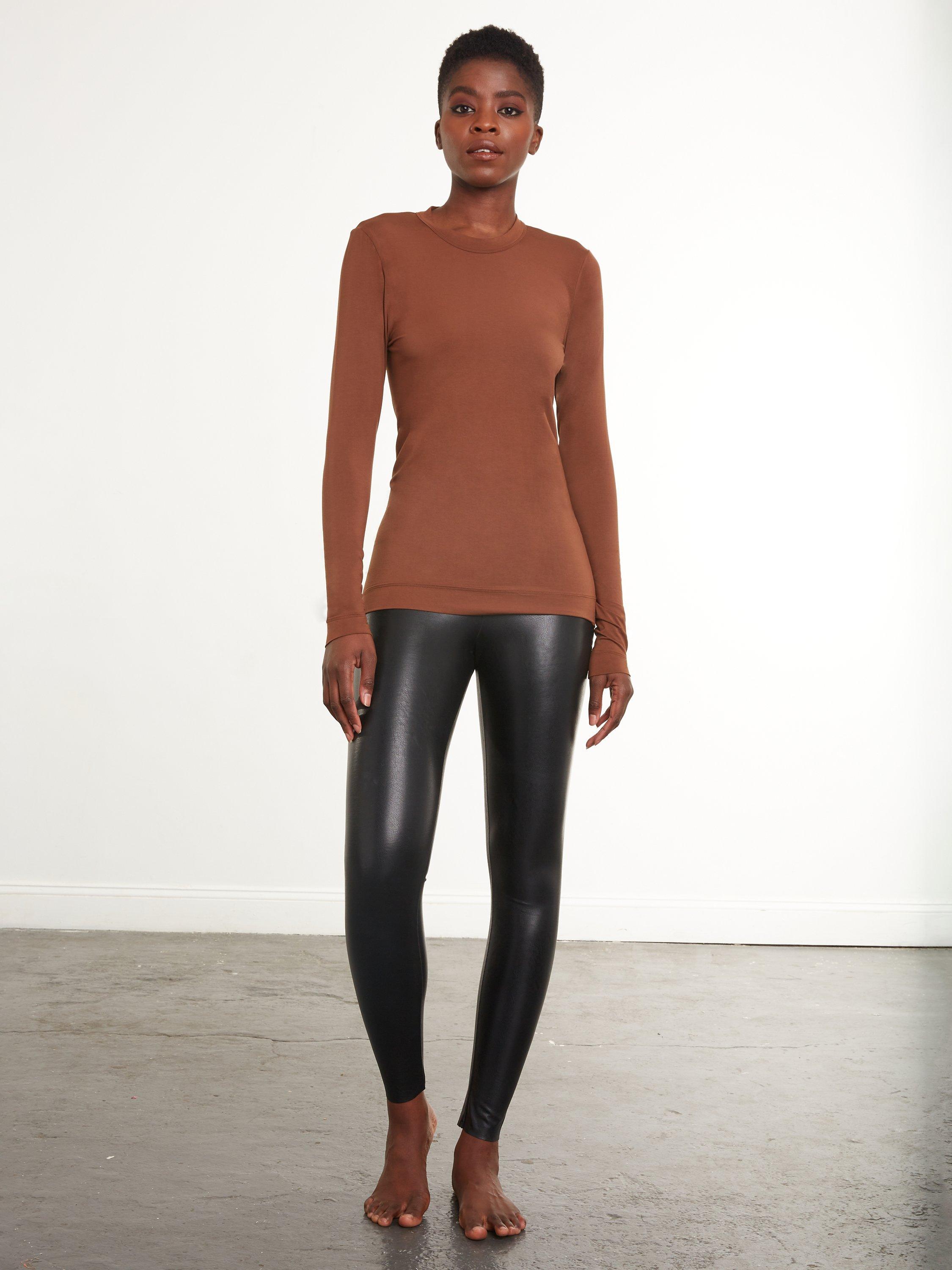 Commando's Faux Leather Leggings feature signature internal smoothing waistband made from a firming fabric that doesn't bag or sag even after hours of wear. The faux leather is soft but flexible with four-way stretch and recovery.