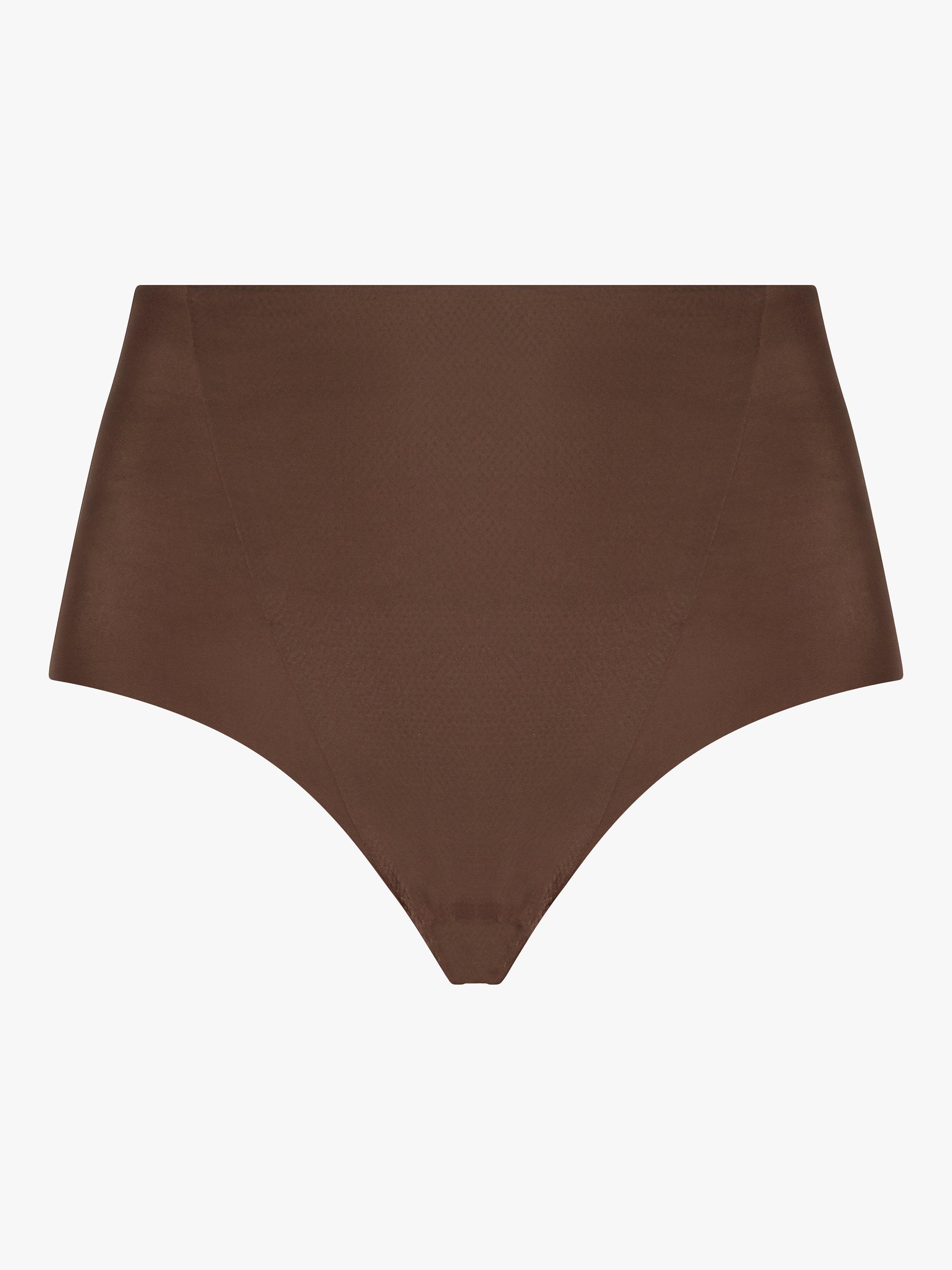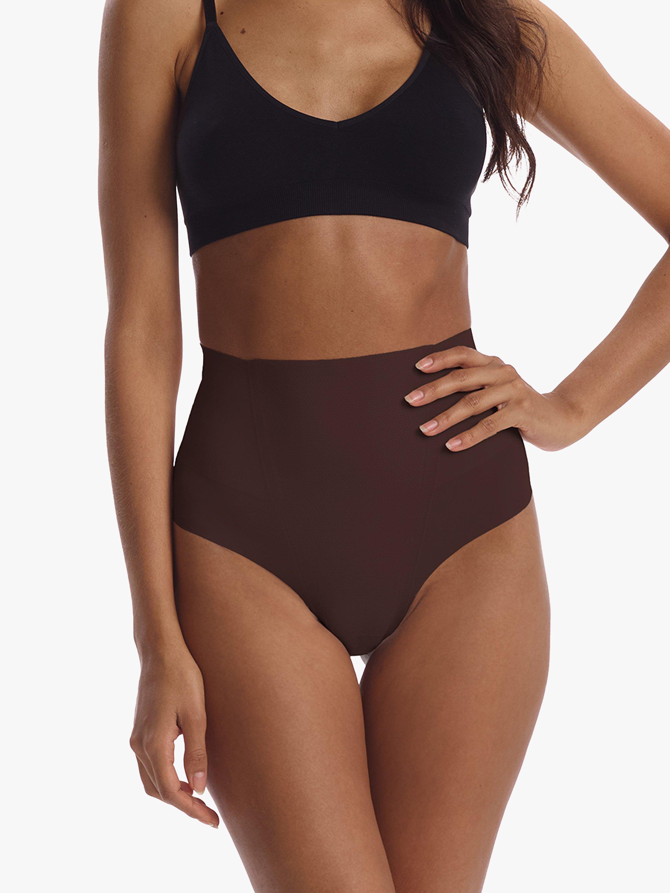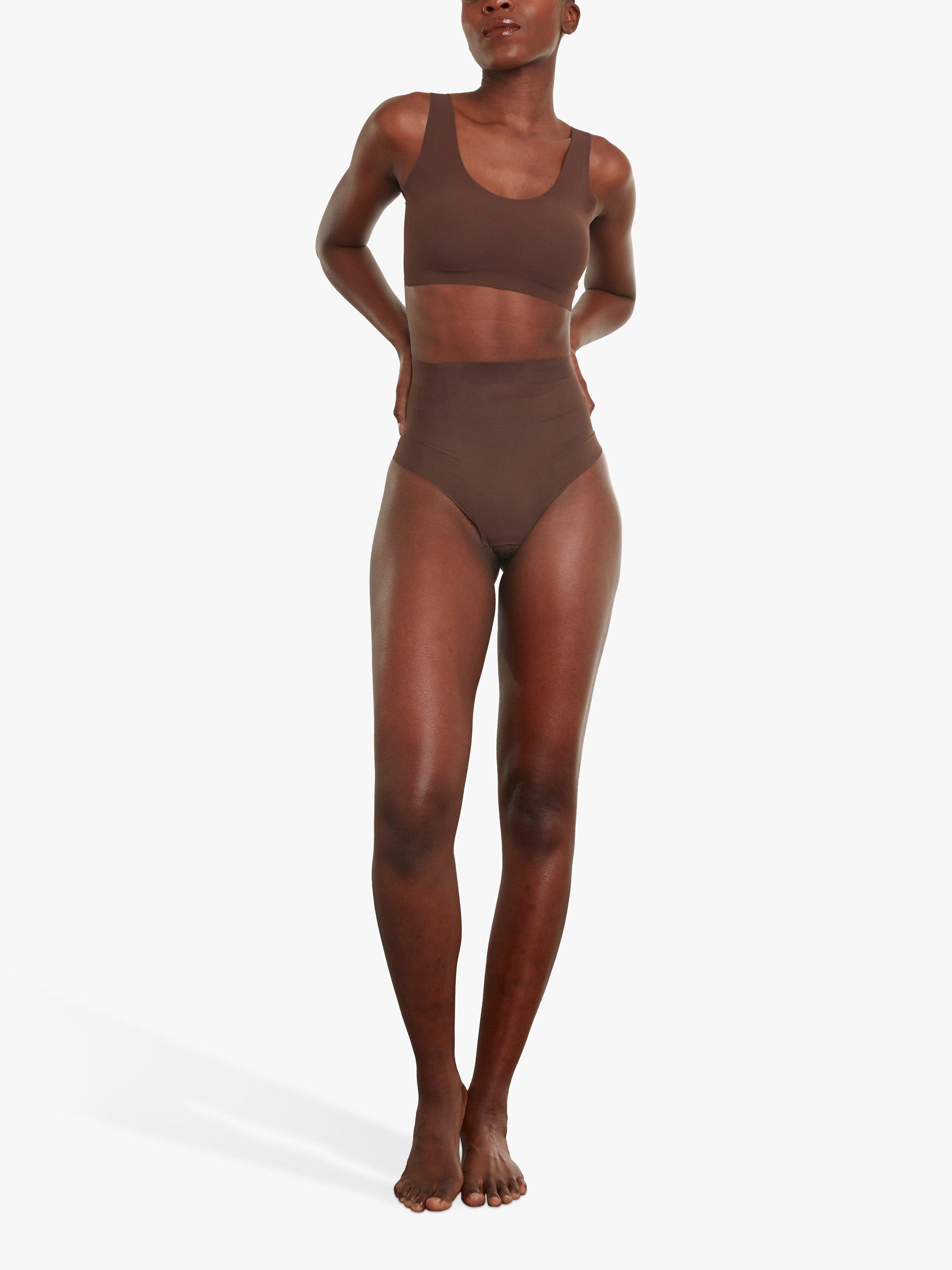 Commando's Zone Smoothing thong features a super-high rise, signature raw-cut hem, and light-medium compression. This shapewear style offers extra-targeted smoothing properties through zoned compression panels, while still offering a seamless and smooth undergarment effect.