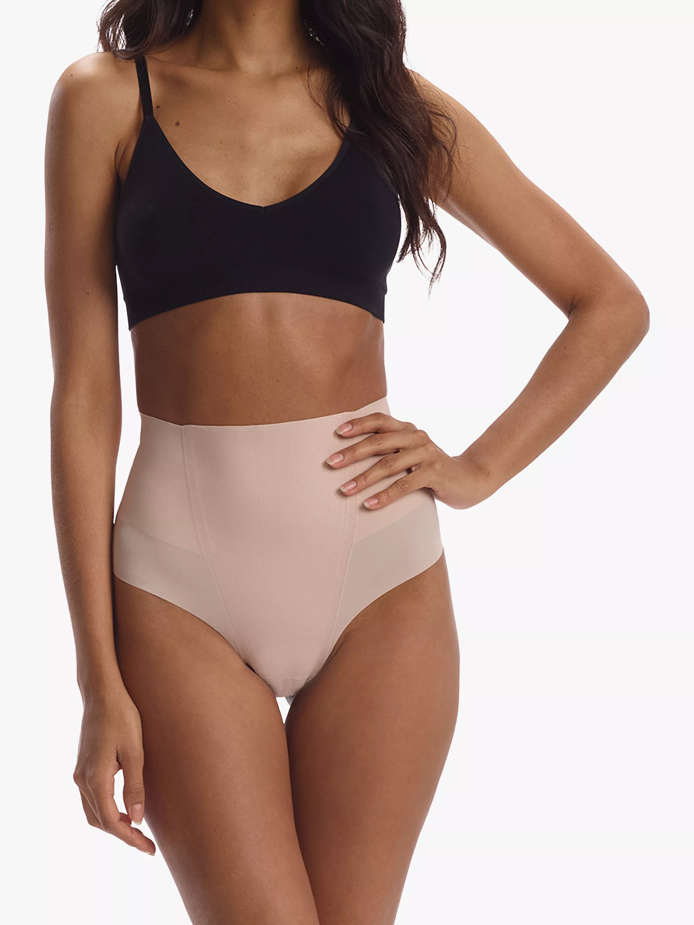 Commando's Zone Smoothing thong features a super-high rise, signature raw-cut hem, and light-medium compression. This shapewear style offers extra-targeted smoothing properties through zoned compression panels, while still offering a seamless and smooth undergarment effect.