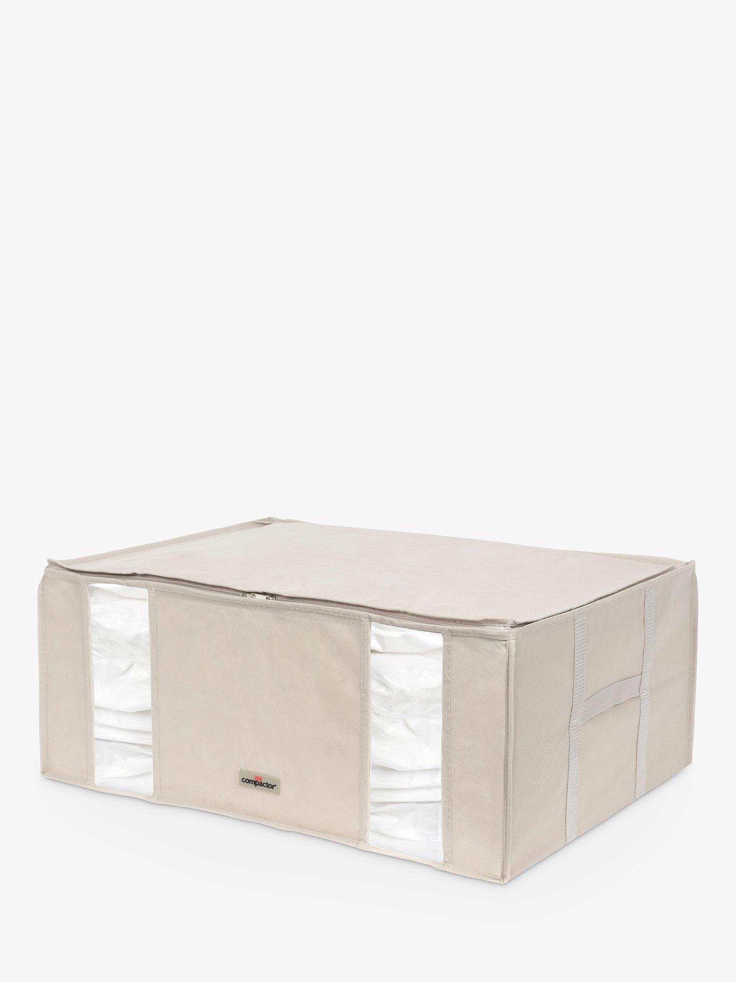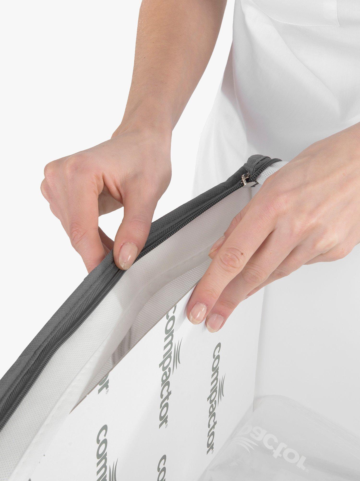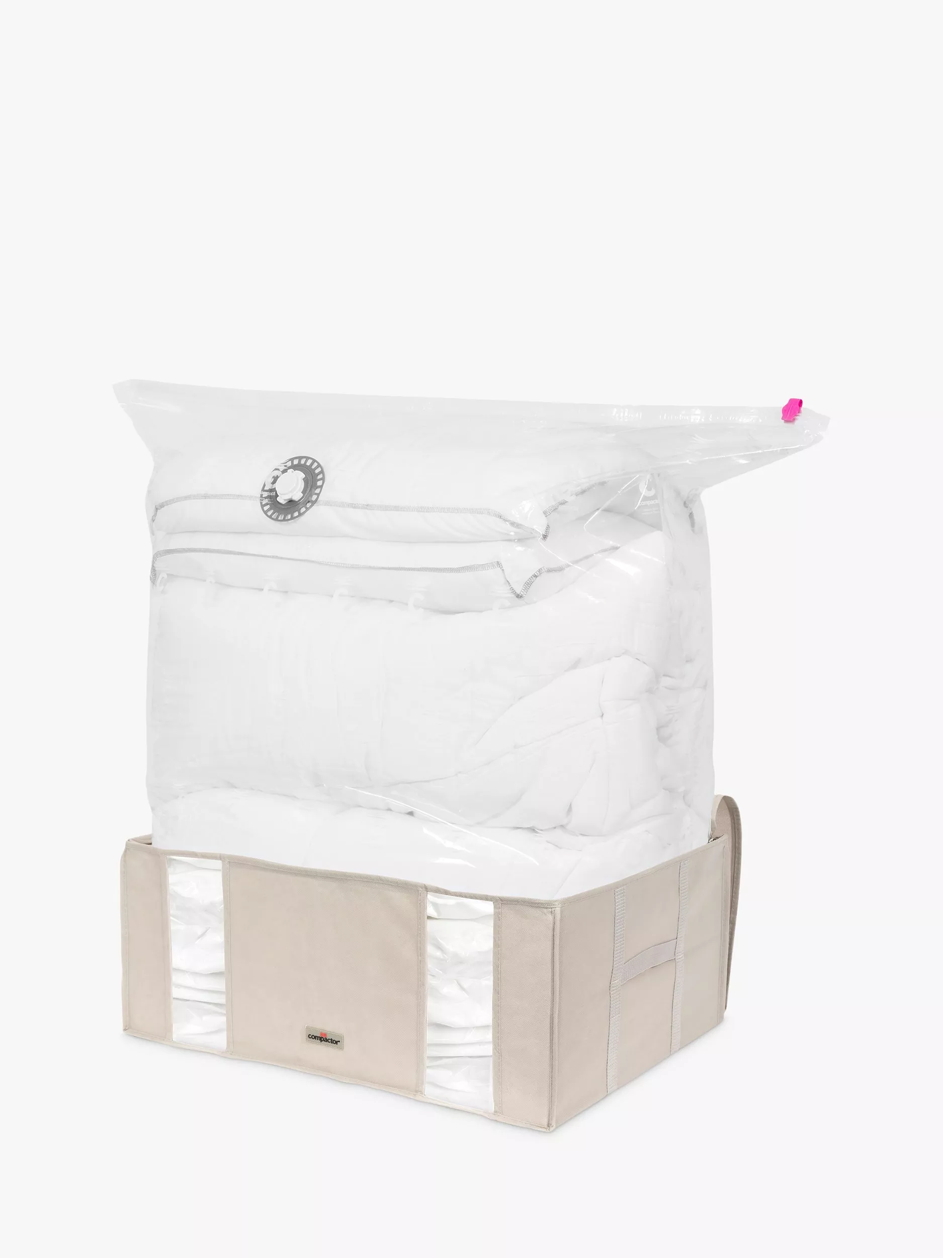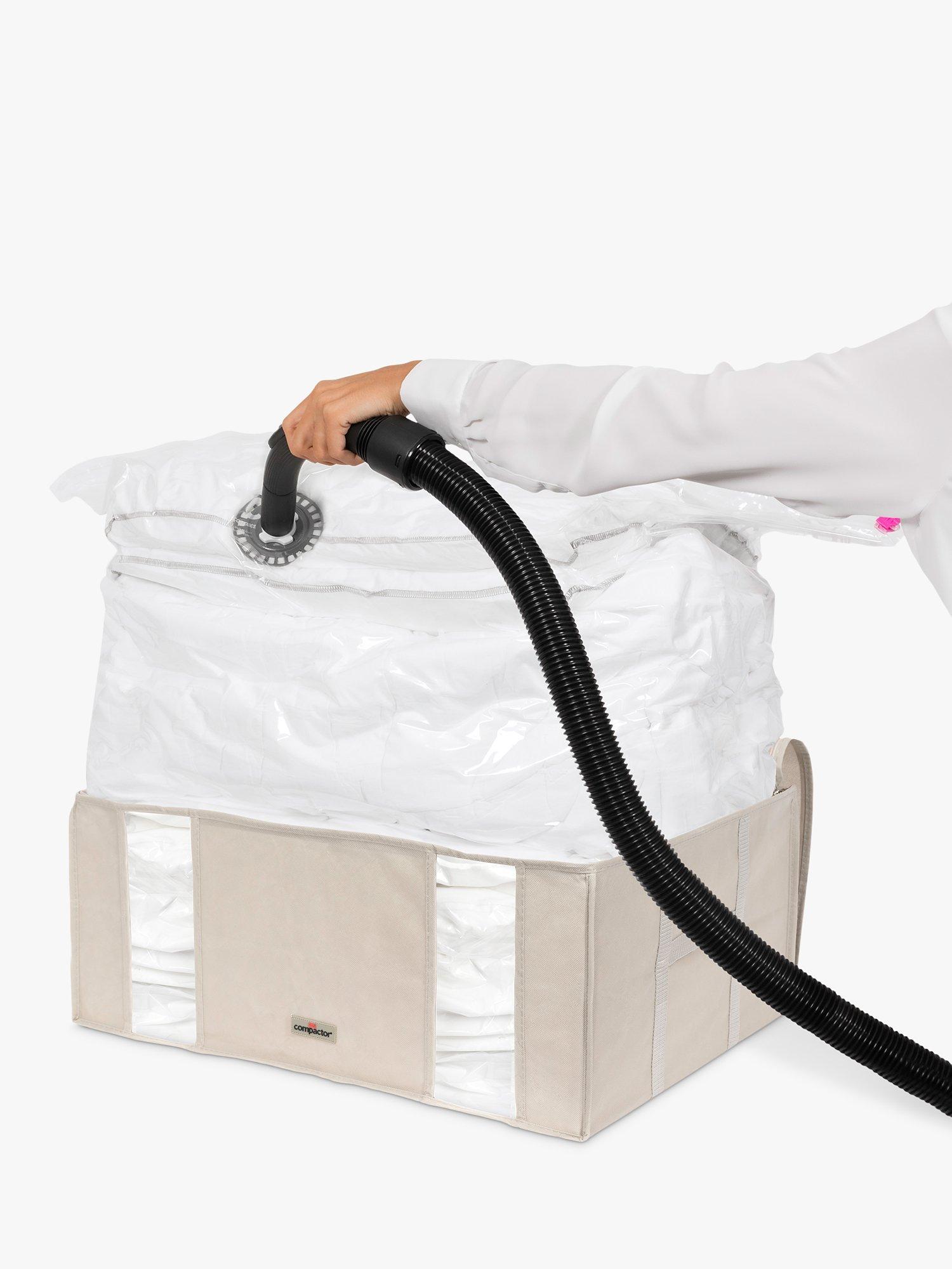 Save space when storing clothes, duvets, linens and more with Compactor's storage tote. The plastic vacuum bag is built into the protective nylon tote to create a single storage solution.