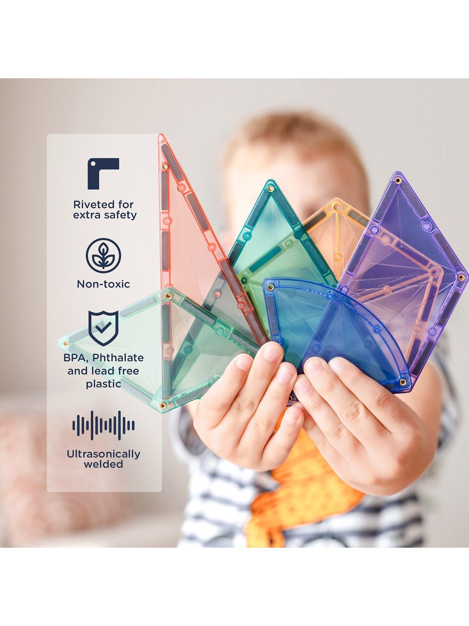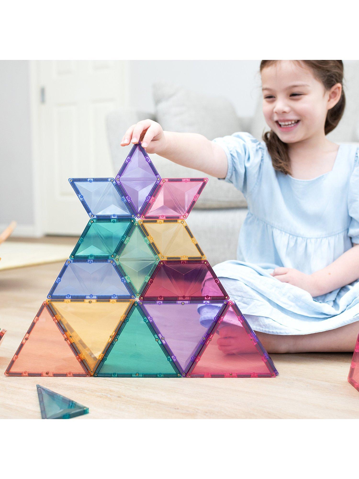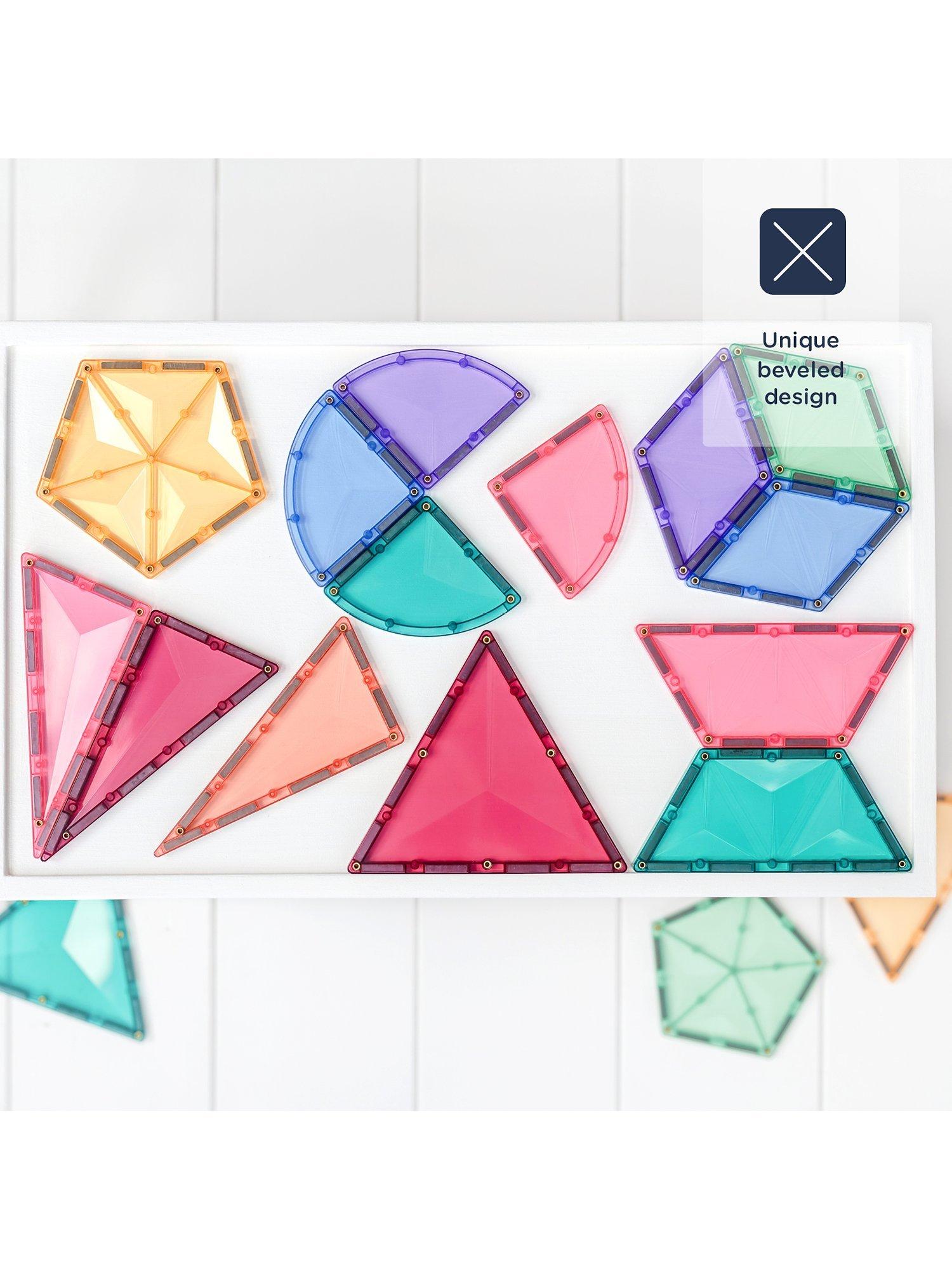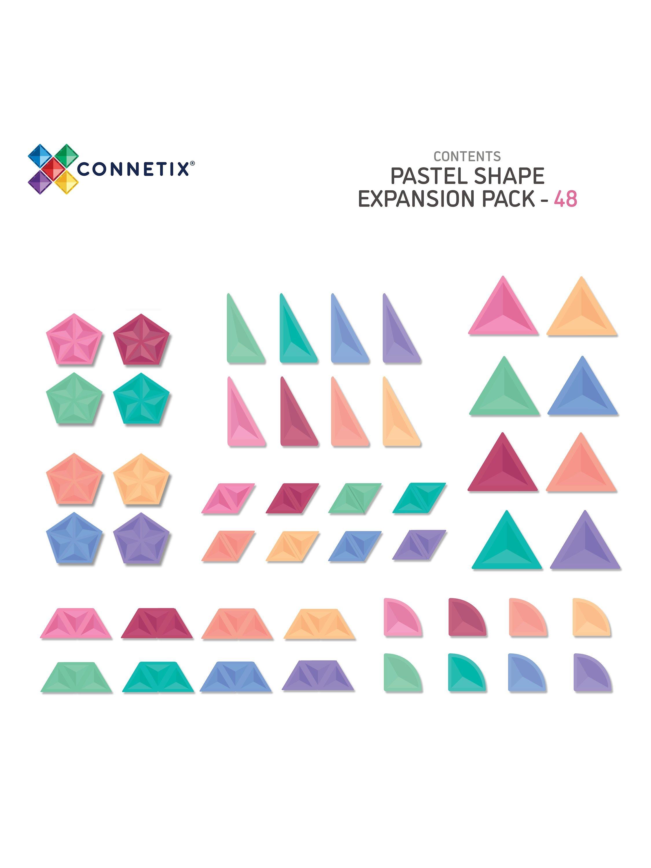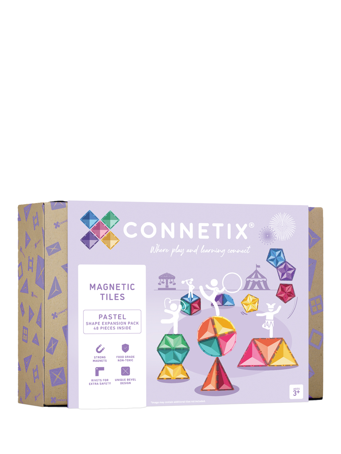 Expand play and learning possibilities with the 48 Piece Pastel Shape Expansion Pack. Inspire imaginations as quarter circles become winding roads, castle domes, or pizza and pie that can be equally shared! Marvel as large right-angle triangles transform into sturdy rocket fins, car ramps, while simultaneously adding extra support. Expand awareness of shapes as you tesselate trapezoids and rhombi together to create a large hexagon, or enjoy designing an array of flowers and butterflies. Challenge your inner engineer to utilise pentagons to create a dazzling dome. The ideal open-ended quality toy, Connetix grows WITH children as their play and learning become more complex.