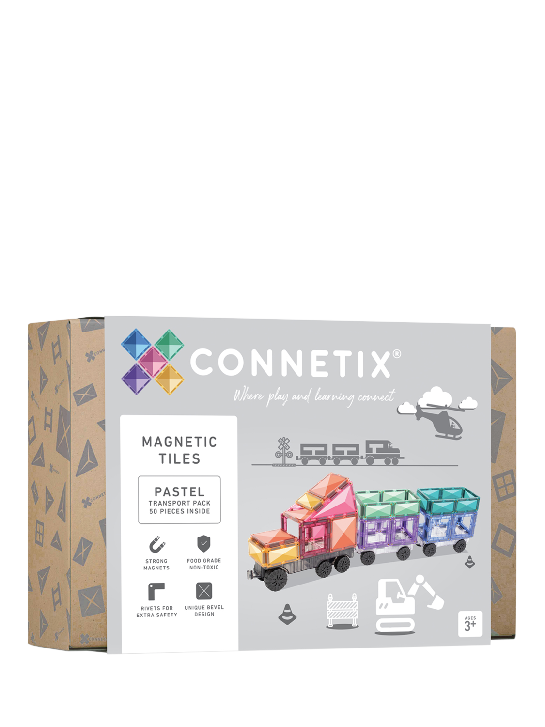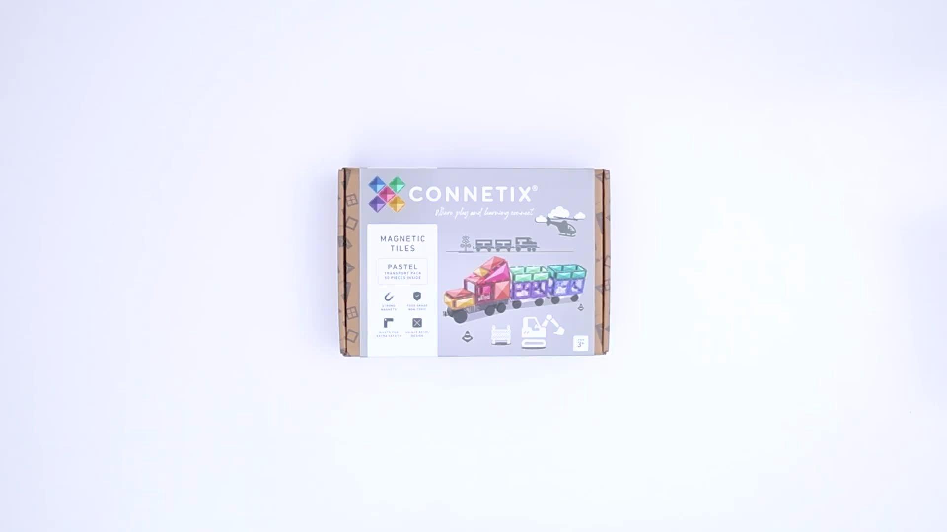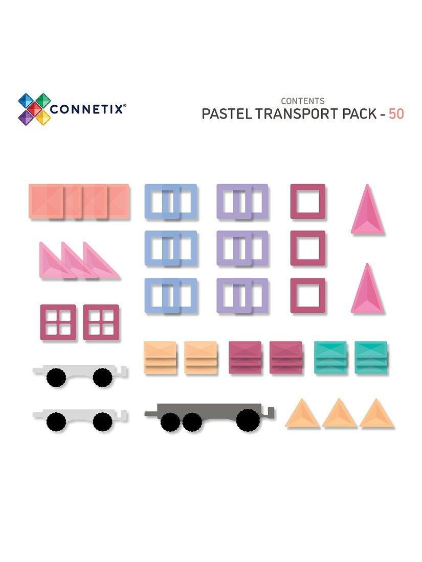 Perfect for vehicle enthusiasts and inspiring children to build bigger and more elaborate designs, this new 50 Piece Pastel Transport Pack comes with an exclusively designed light grey reversible transport base, two clear motion bases with real rubber wheels, and a range of CONNETIX magnetic tile shapes in earthy pastel colours.