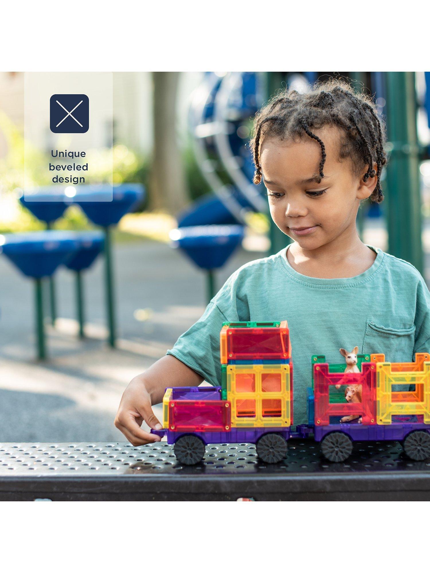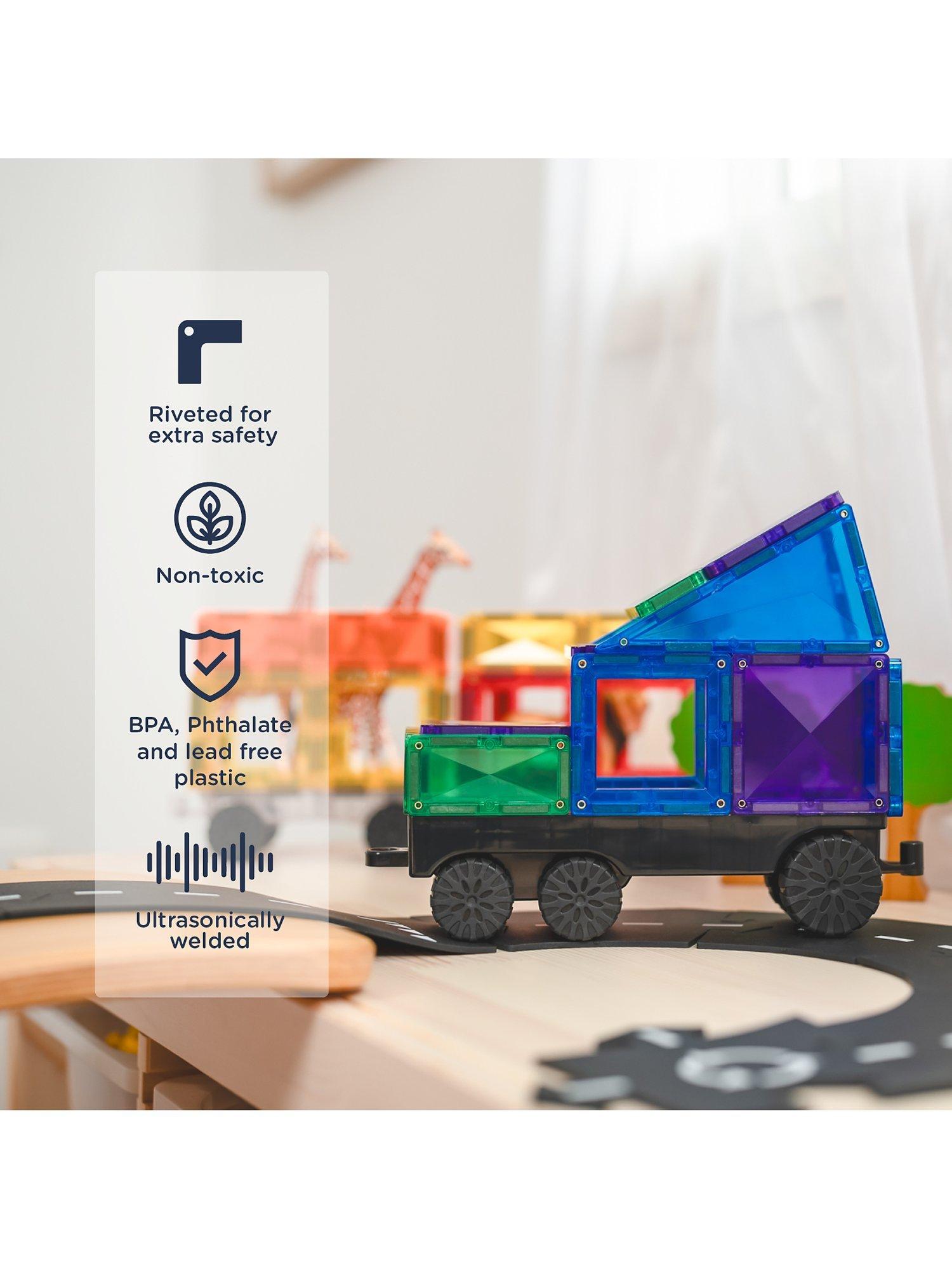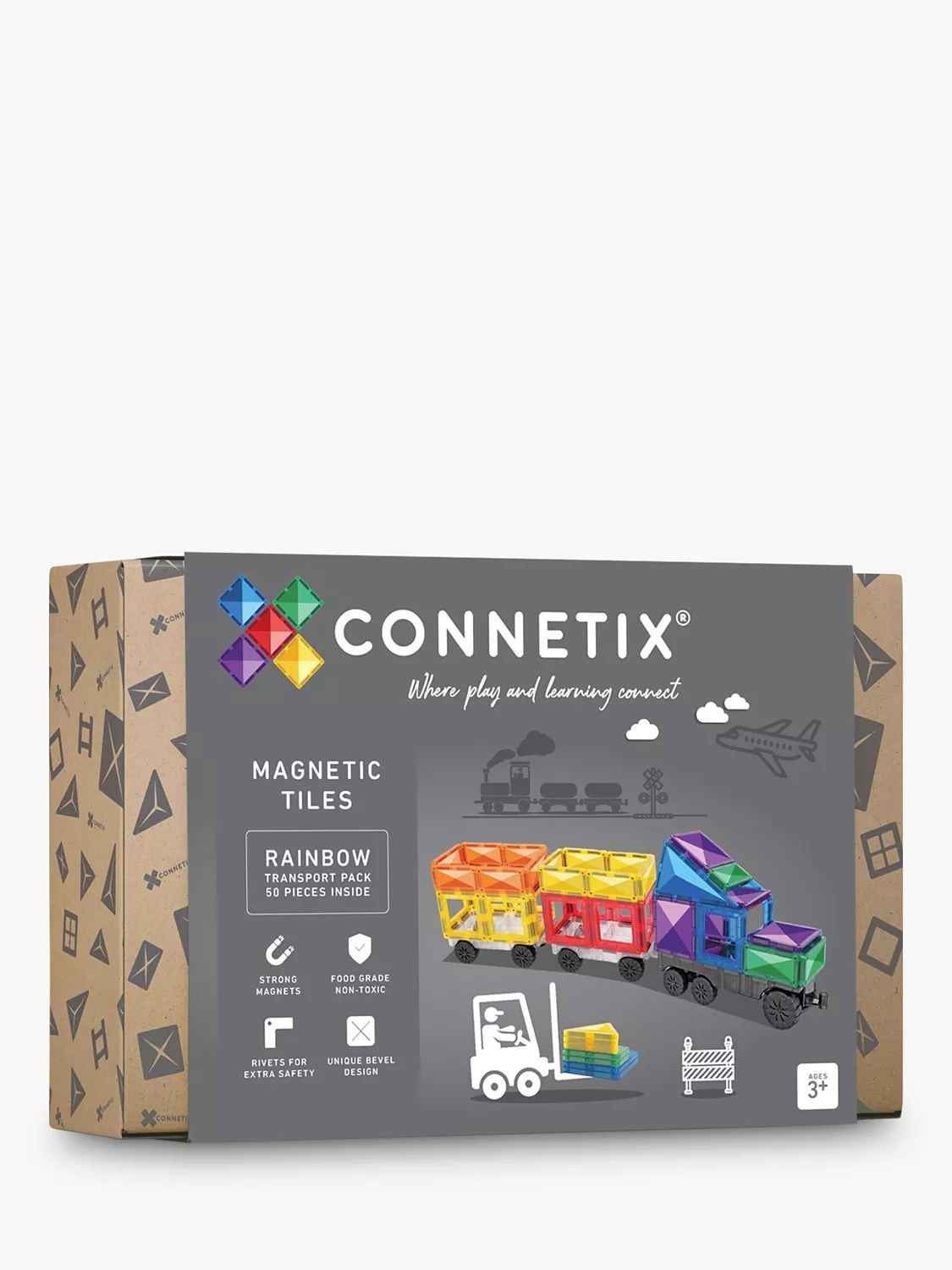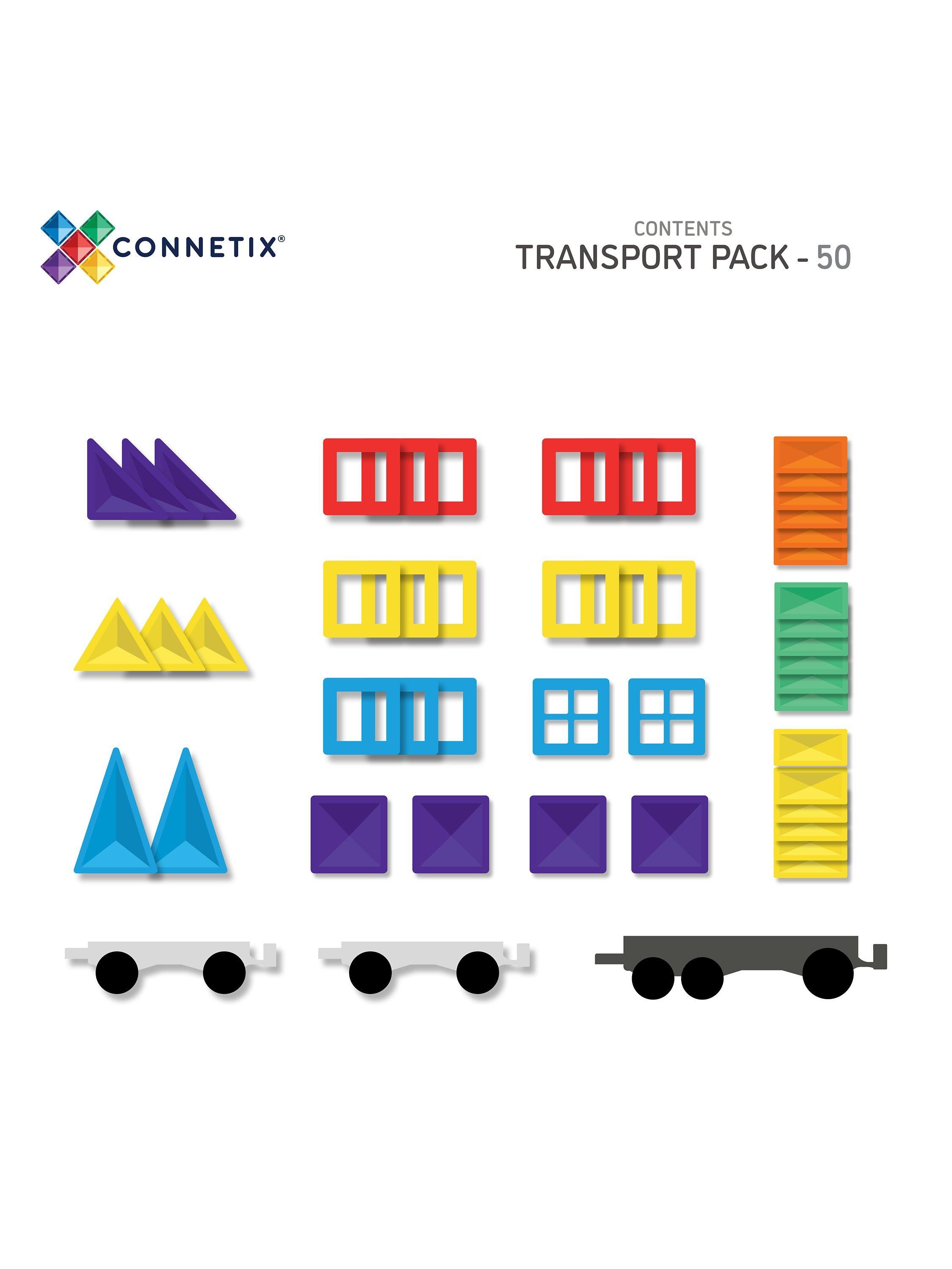 Gear up for epic vehicle fun with the Connetix 50 Piece Transport Pack. Designed with vehicle enthusiasts in mind, this pack features one REVERSIBLE grey transport base, two clear motion bases with REAL rubber wheels, and a range of Connetix magnetic tile shapes, allowing you to create and build endless vehicle designs. Explore STEAM learning concepts as you navigate magnetism, shapes and colour to create your very own trucks and trains, ambulances and aircrafts, forklifts and fire engines. Unleash your imagination and bring your ideas to life with the Connetix Transport Pack. Featuring the Connetix signature bevel design for durability and clearer refractions, Connetix Packs are designed to grow with children as play and learning develops. Complement your Transport Pack with any of the packs from the Connetix range to take your vehicle creations to the next level.