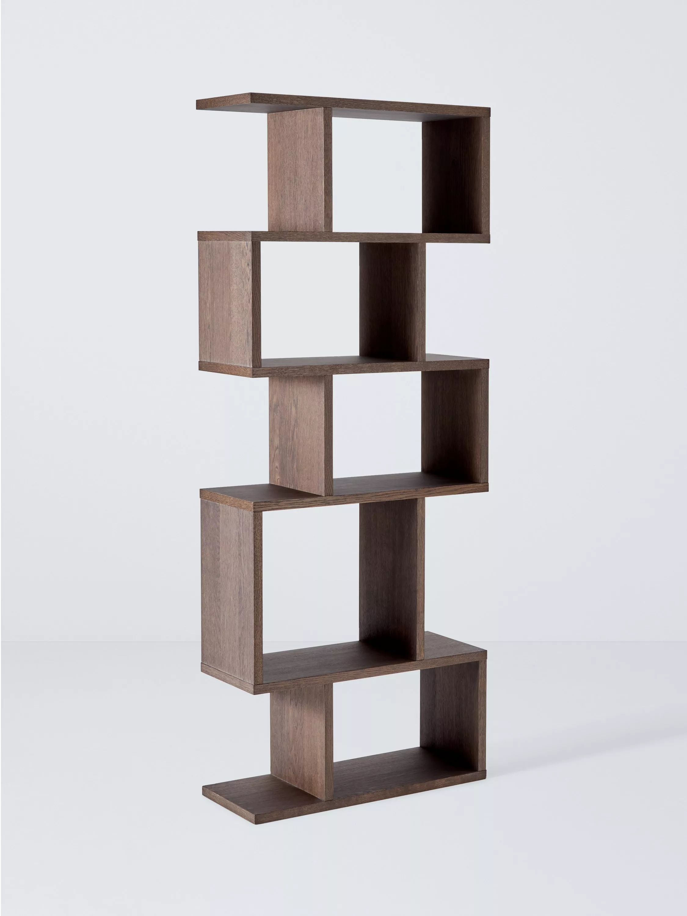 Curate a contemporary interior with modern, minimalist furniture that draws the eye. This alcove shelving unit is made from responsibly sourced oak veneers in a dark stain finish and its sleek, geometric structure features five shelves in total. It's supplied fully assembled so set it up and style it your way, with your favourite books, decorative items and ornaments.