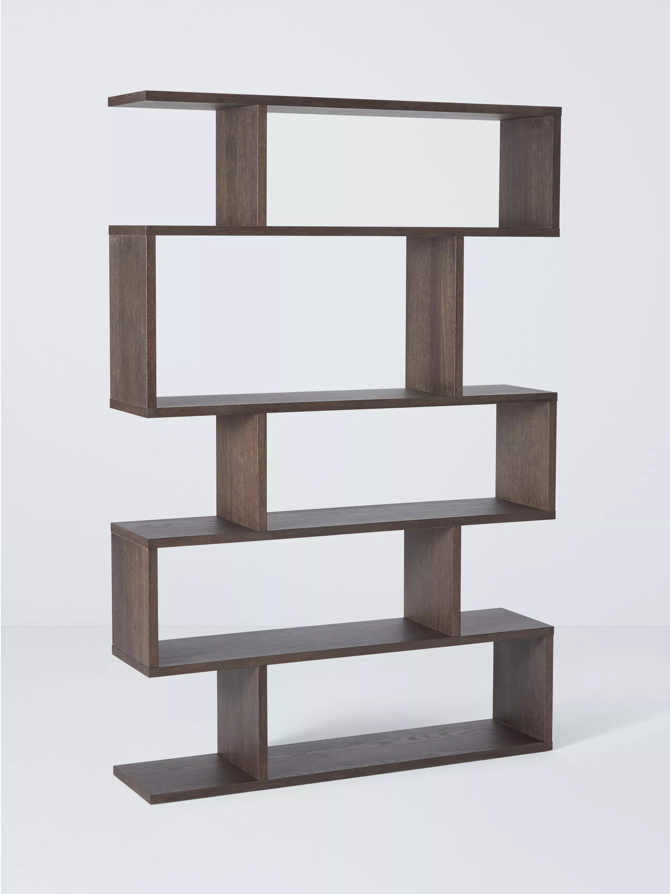 Curate a contemporary interior with modern, minimalist furniture that draws the eye. This wide shelving unit is made from responsibly sourced oak veneers in a dark stain finish and its sleek, geometric structure features five shelves in total. It's supplied fully assembled so set it up and style it your way, with your favourite books, decorative items and ornaments.