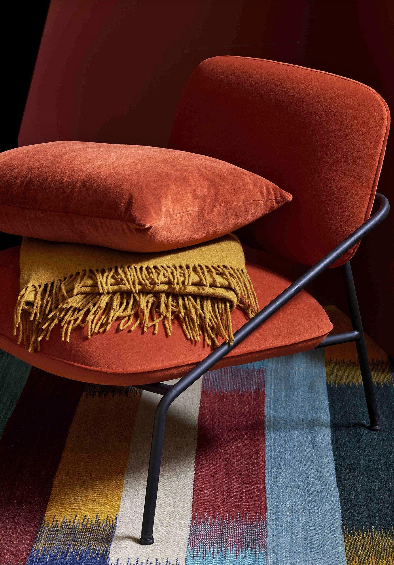 Fionnuala advises starting with neutral walls: ‘That way, the strong furniture shapes and colours will really pop. Try vibrant vermilion orange, rich plum tones or bold teal. This look can take three or more colours in one space because of the richness of each colour in the collection.’