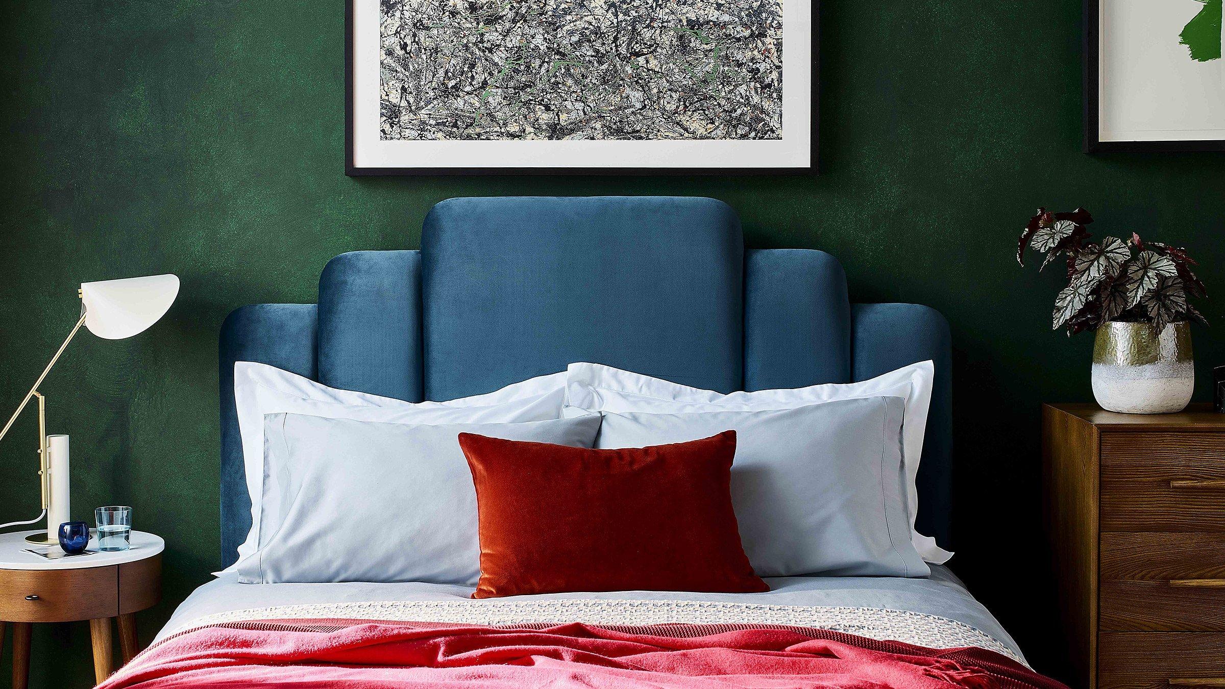 Polished silver and high-shine finishes will also give a lustrous feel, while dark woods, cut velvet and art deco geometrics add depth. ‘You don’t need much pattern to pull this look off,’ says Fionnuala. ‘One really strong pattern can supply a colour palette. I love the geometric jacquards that are in this collection.’ Fionnuala’s stand-out piece is the Boutique Upholstered Bed which is available in ‘stunning teal or blue’.