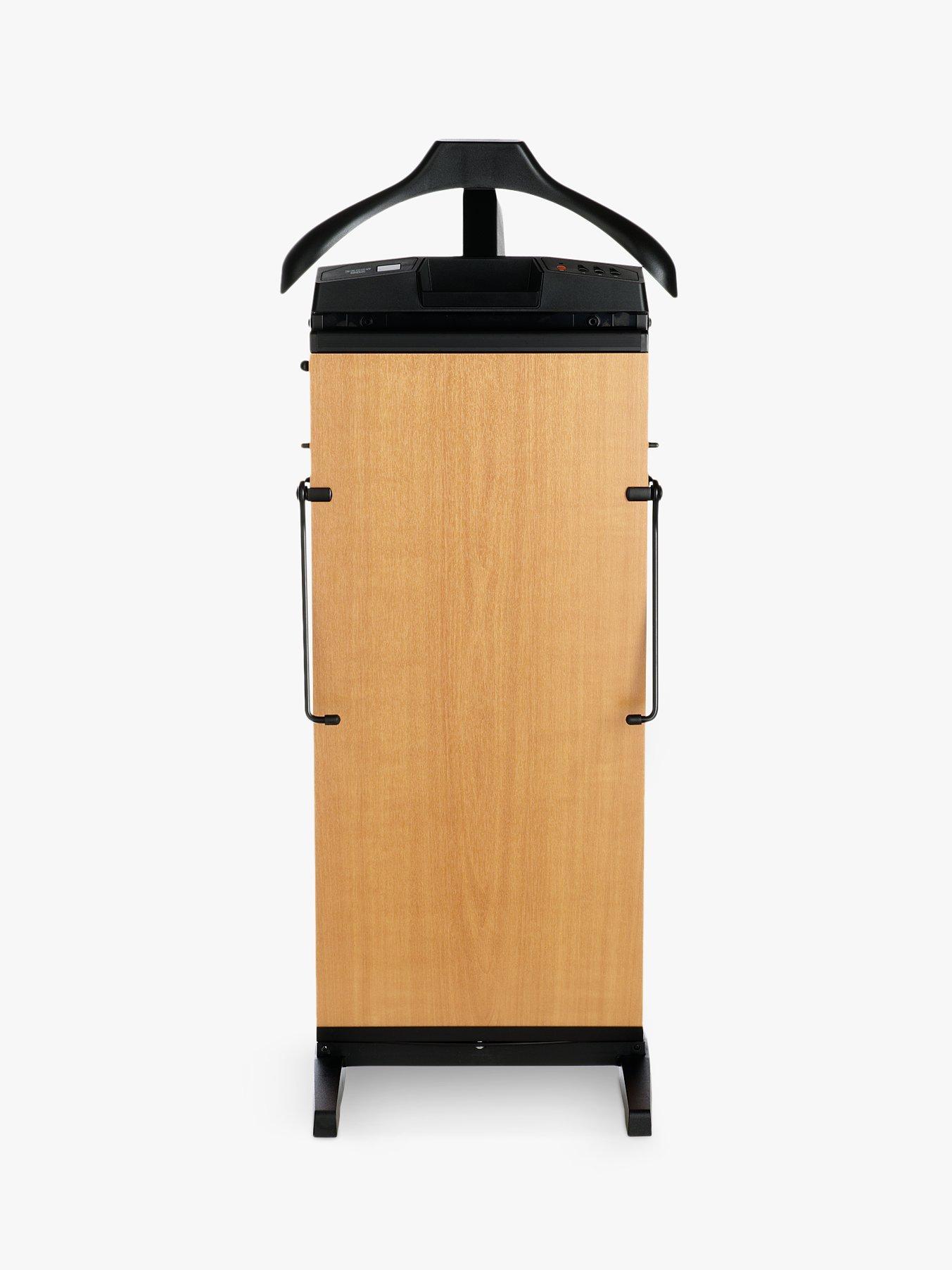 The 7700 Corby trouser press gently removes wrinkles, easing trousers back into shape before pressing a sharp crease. It has a sprung section at base of the heating pad to hold turn ups and hems in place and the Corby Stretcher Bar System, which removes back-of-knee wrinkles before pressure and heat are applied. Features include: auto cut-off and manual cancel option, LED countdown display and shelf for pocket contents.