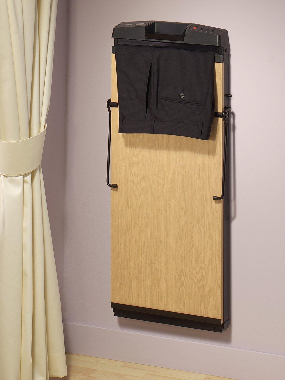 - Do not put damp trousers in the trouser press. Free standing or wall mounted 15, 30 & 45 minute timer Thermostat Manual cancel option Automatic cut off LED countdown timer Comes complete with feet, coin tray, jacket hanger and bracket Wall mounted fixings included Black trim White effect finish 220-240V AC