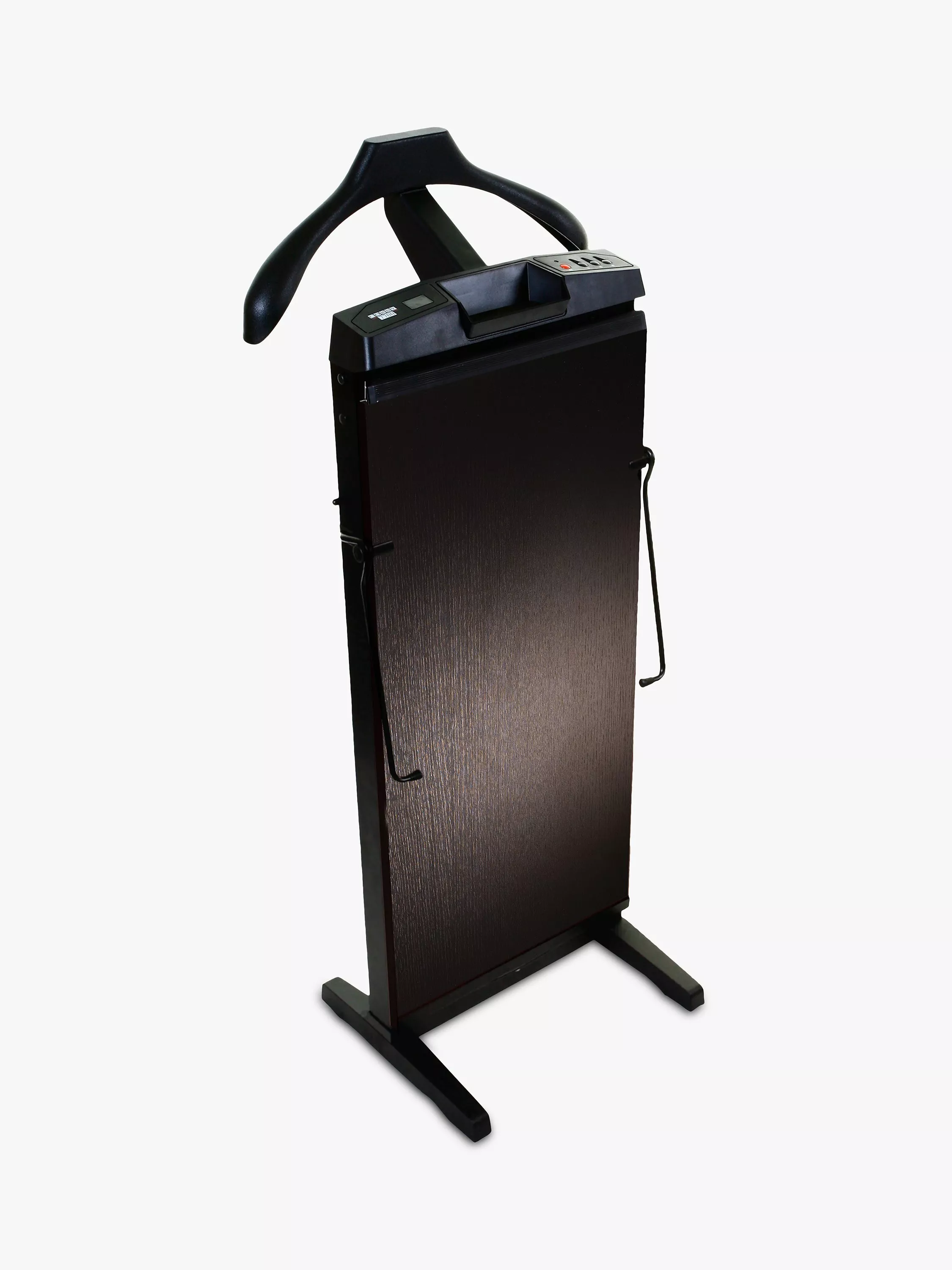 Patented and unique stretcher bars offer a solution to wrinkled trousers around the knee area, with a thermostatic temperature control and a self-adjusting section for turn-ups. A coin tray and jacket hanger allow the press to double as a useful valet stand.