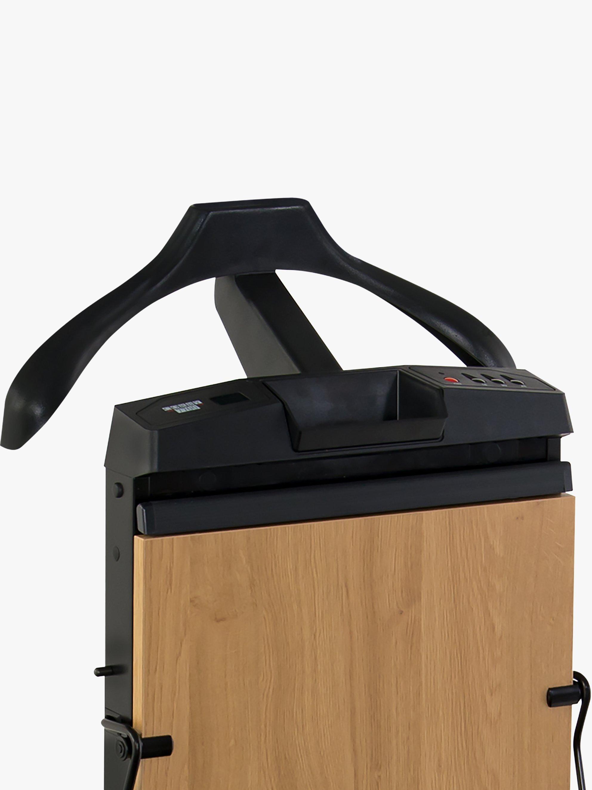 The 7700 Corby trouser press gently removes wrinkles, easing trousers back into shape before pressing a sharp crease. It has a sprung section at base of the heating pad to hold turn ups and hems in place and the Corby Stretcher Bar System, which removes back-of-knee wrinkles before pressure and heat are applied. Features include: auto cut-off and manual cancel option, LED countdown display and shelf for pocket contents.