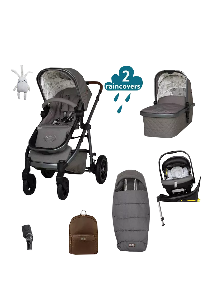 This handy everything bundle comes with the Wow 3 carrycot, pushchair, the ADAC award-winning Acorn 2 i-Size Car seat and compatible base, the compatible adaptors, plus the luxury changing bag backpack and plush pod-style footmuff, 2 rain covers and a cute cuddly toy - everything you need right from the start.