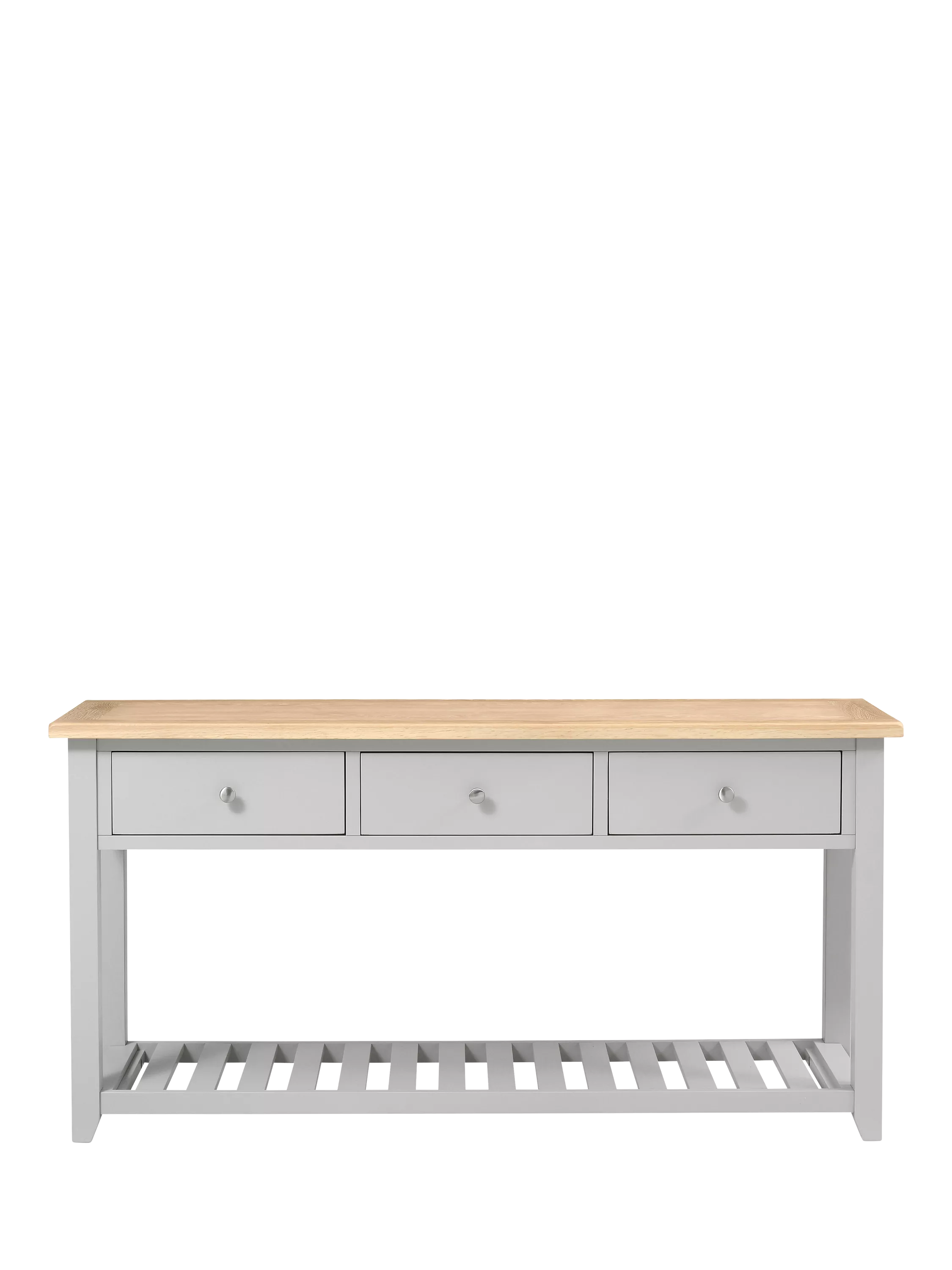 The sturdy top of this console table has been waxed and lacquered to bring out its characterful grain and contrasts beautifully with the grey paint finish on the frame and handy lower shelf. The three drawers will keep all your essentials easy to find and you get both smart polished handles and painted wooden handles, so its final appearance is up to you.