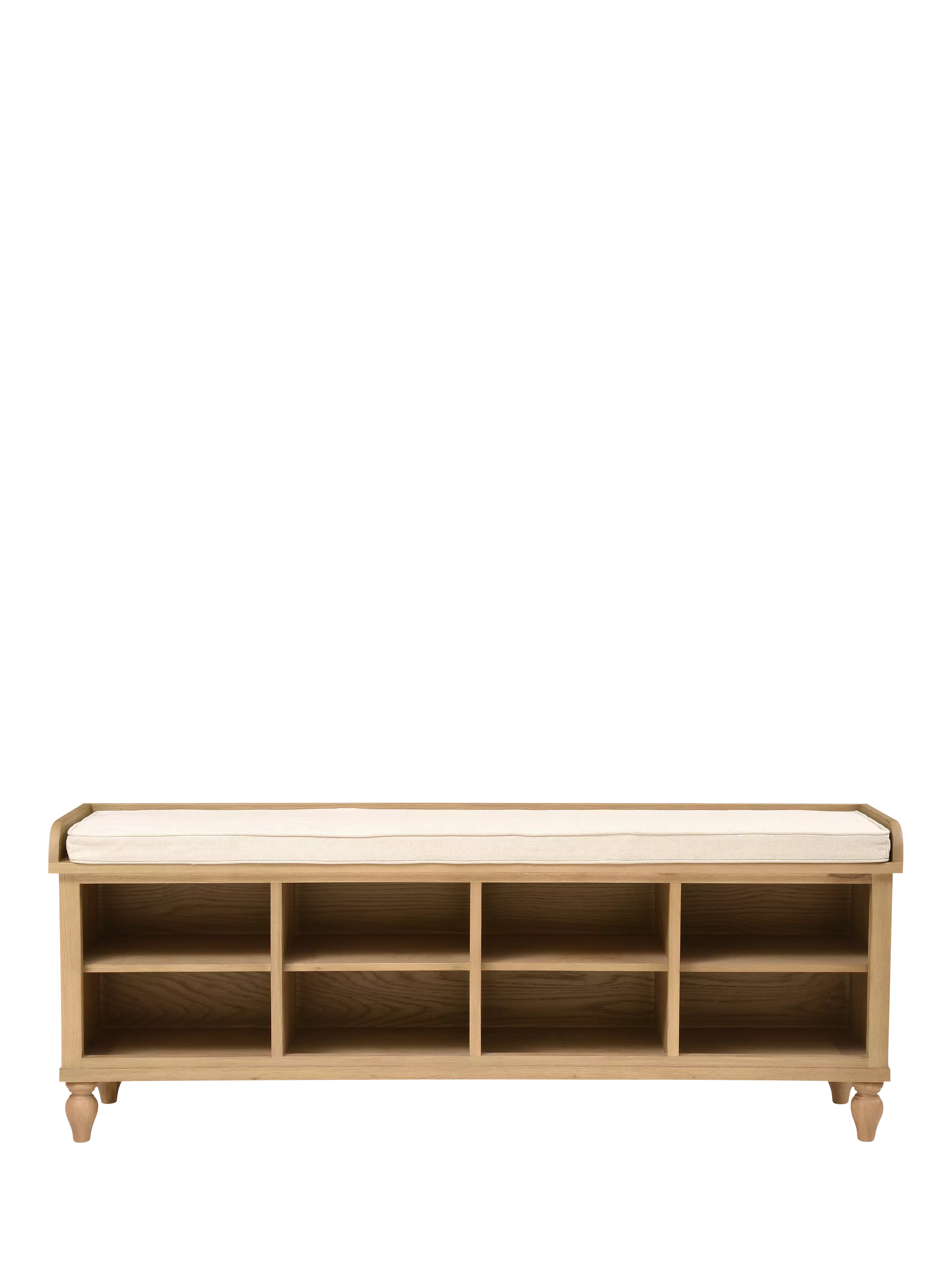 Crafted with solid oak, Cotswold's Elkstone shoe bench features beautifully turned legs and a soft cushioned top, making it a perfect perch for putting on and taking off shoes. With eight spacious cubby holes, it's a practical and timeless storage solution for busy hallways.