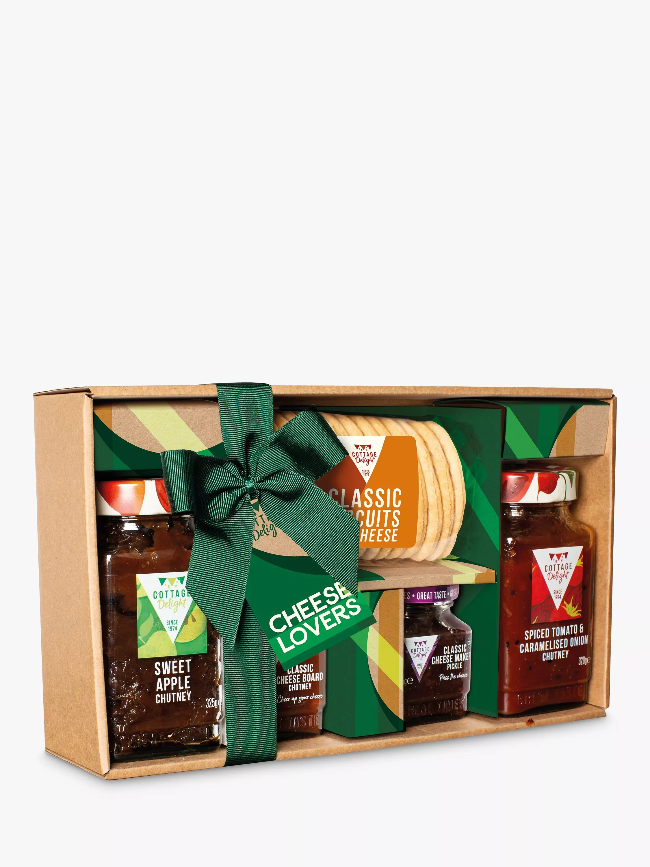 A delicious gift set containing a variety of savoury treats including: Sweet Apple Chutney, 325g. Spiced Tomato & Caramelised Onion Chutney, 320g. Classic Cheese Maker's Pickle, 115g. Classic Cheese Board Chutney, 115g and Scottish Oatcakes with Basil.