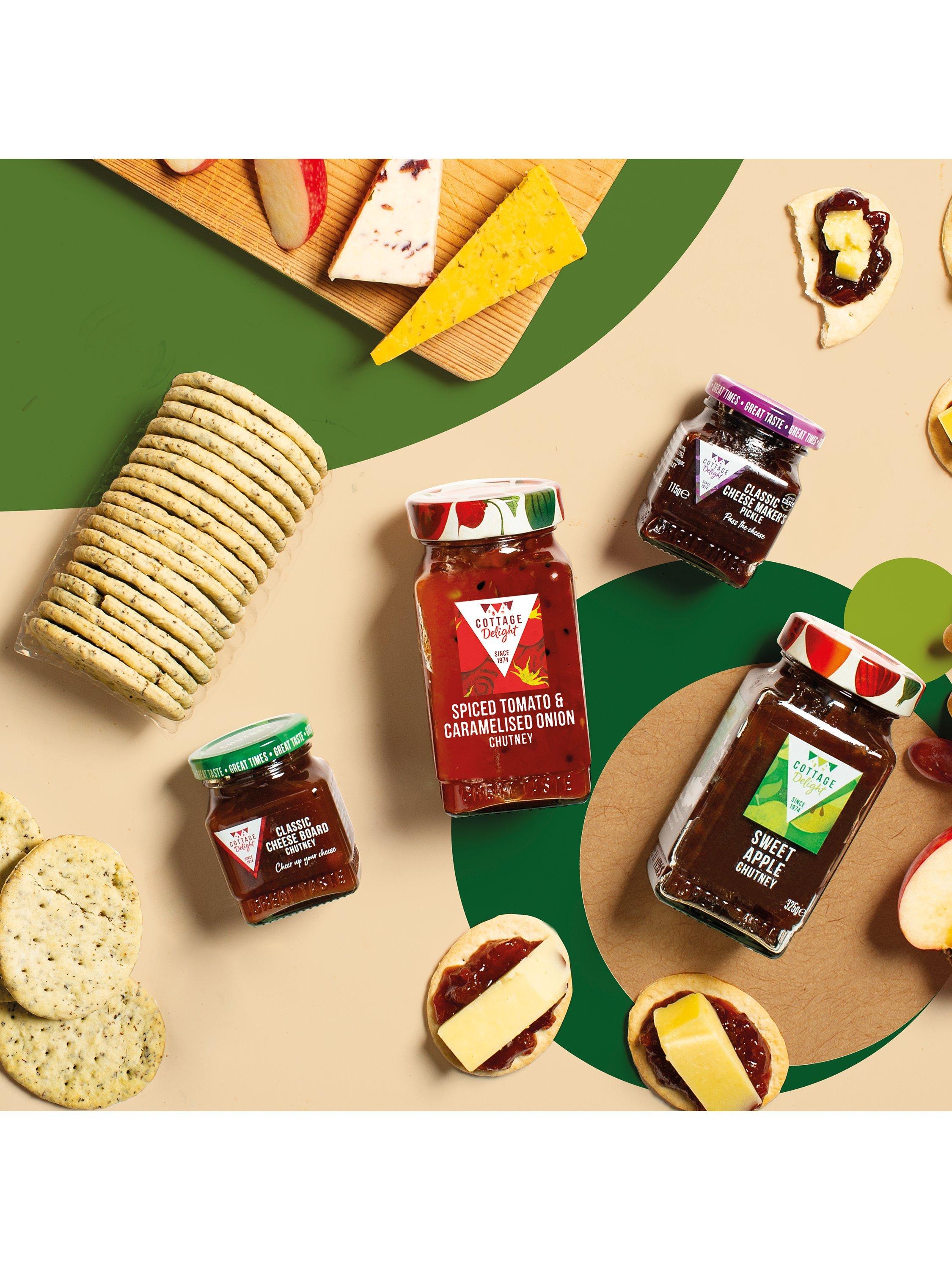 - Sweet Apple Chutney Bramley apple (30%), Sugar, Cider vinegar, Gelling agent: Fruit pectin, Muscovado sugar, Sultanas, Dried onion flakes, Salt, Spices, Acidity regulator: Citric acid. Spiced Tomato and Caramelised Onion Chutney Tomato (50%), Sugar, Onion (11%), Spirit vinegar, Concentrated tomato purée, Cornflour, Salt, Rapeseed oil, Spices, Garlic purée, MUSTARD seeds. Cheese Board Chutney Cheese Board Chutney with Apple and Fig Sugar, Bramley apple (27%), Dried figs (11%) (Contains Rice flour), Cider vinegar, Gelling agent: Fruit pectin, Stem ginger, Salt, Ground ginger. Cheese Makers Pickle Cheese Maker's Pickle with Rhubarb and Blackberries Demerara sugar, Cider vinegar, Carrots, Onions, Rhubarb (10%), Golden syrup, Blackberries (7%), Plums (7%), Blackcurrants (7%), Worcestershire sauce (Water, Spirit vinegar, Sugar, Onion, Salt, Tamarind paste, Ginger, Garlic, BARLEY malt extract, Cloves), Concentrated tomato purée, Spices. Basil Biscuits for Cheese WHEAT flour (Contains Calcium carbonate, Niacin, Iron, Thiamin), Vegetable oils (Palm*, Rapeseed), Vegetable margarine (Vegetable oils (Palm*, Rapeseed), Water, Salt, Emulsifier: Polyglycerol esters of fatty acids, Colours: Curcumin; Annatto), Sugar, Raising agents: Sodium bicarbonate; Disodium dihydrogen diphosphate, Ammonium bicarbonate, Salt, Dried basil May contain traces of SESAME.