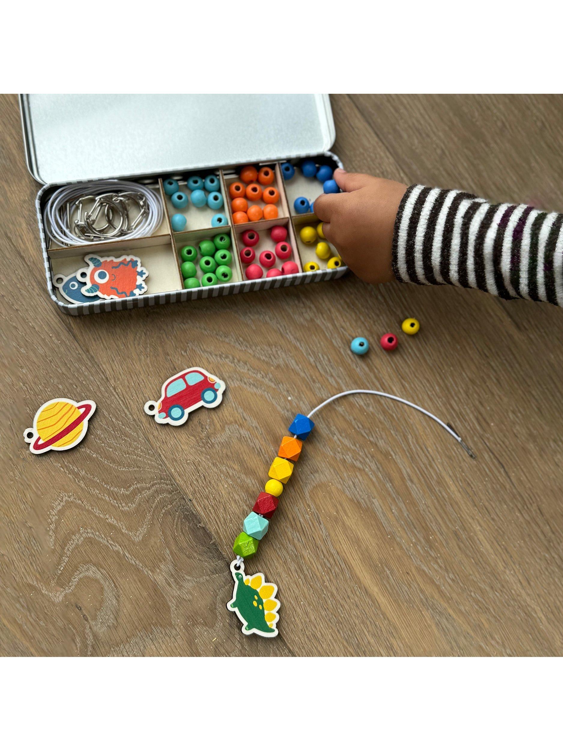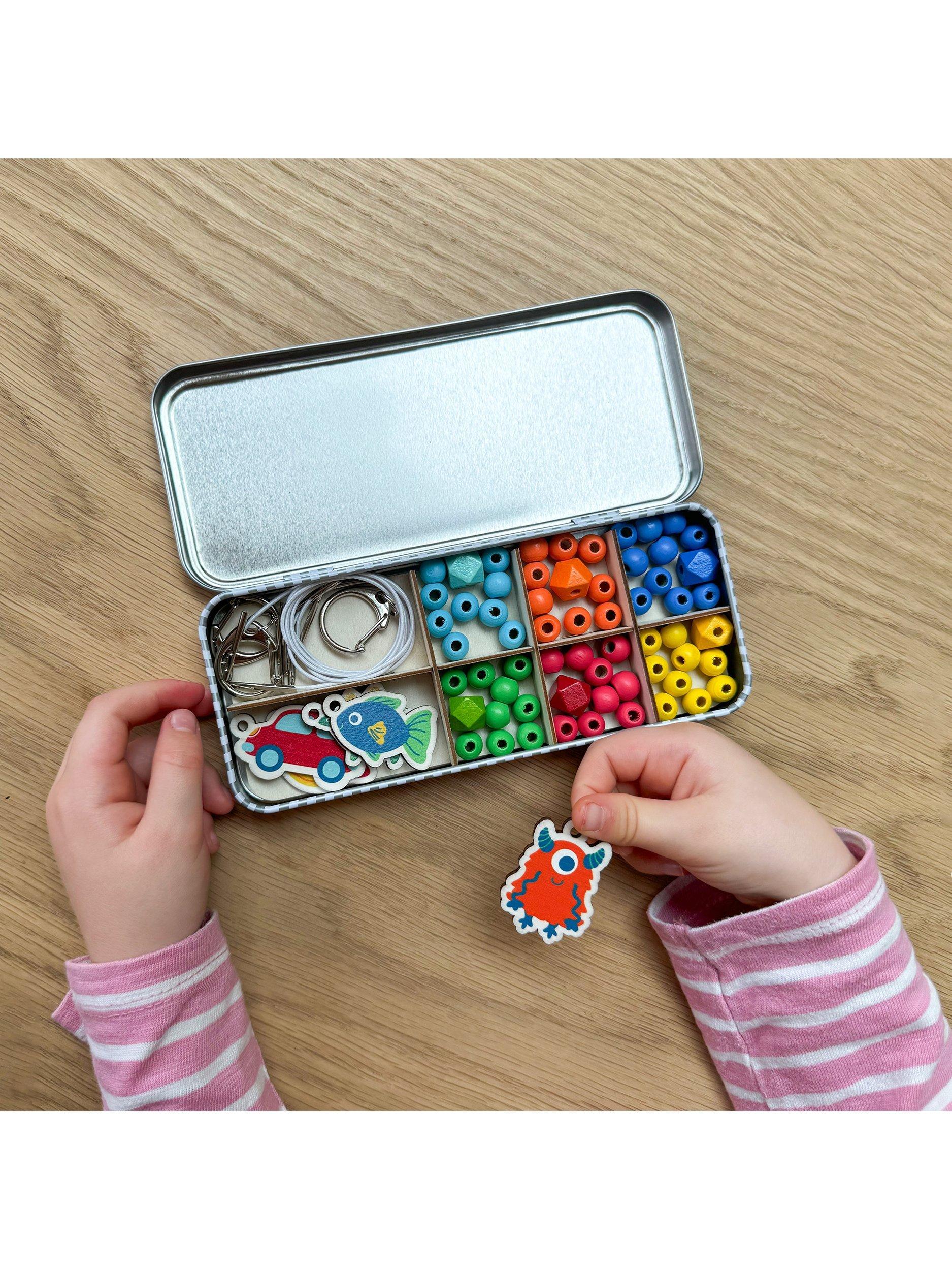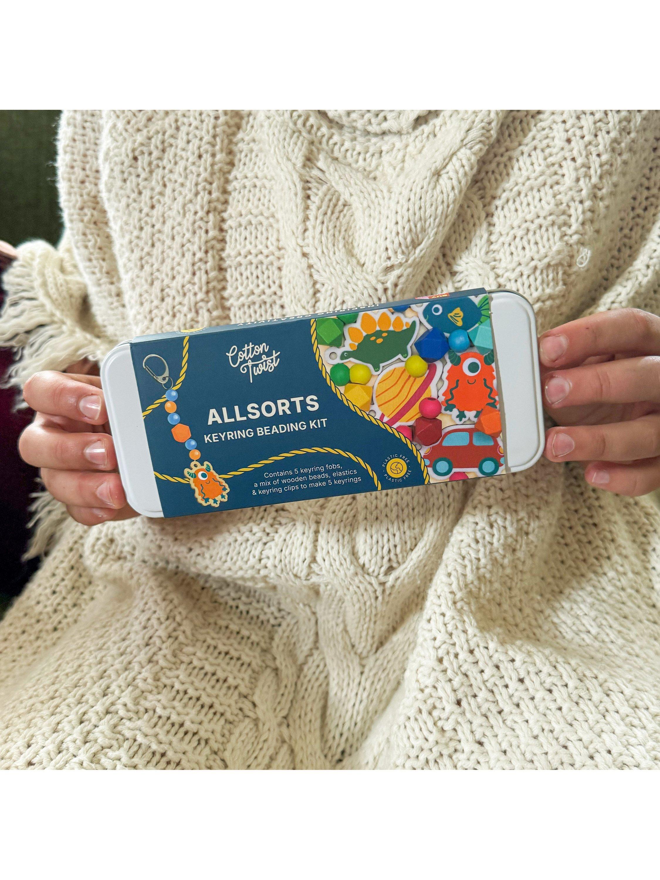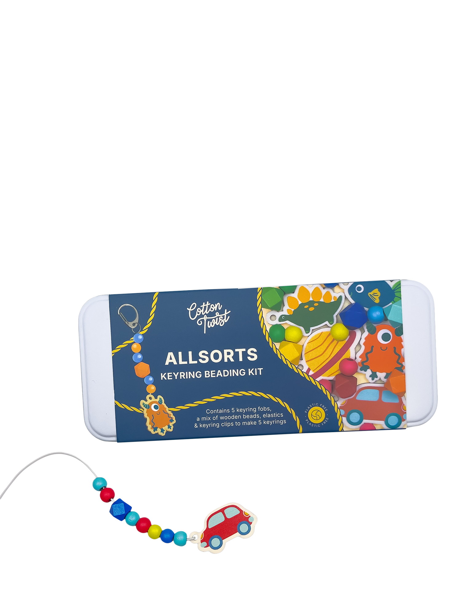 The Allsorts keyring kit makes a wonderful plastic-free activity for children. It offers a selection of wooden fobs, including a dinosaur, monster, fish, planet and car, allowing children to create 5 keyrings. The kit also comes with rainbow-coloured spacers and geometric beads to complement the showpiece beads for vibrant accessories. With elastic featuring metal ends, threading the beads is easy for young children.