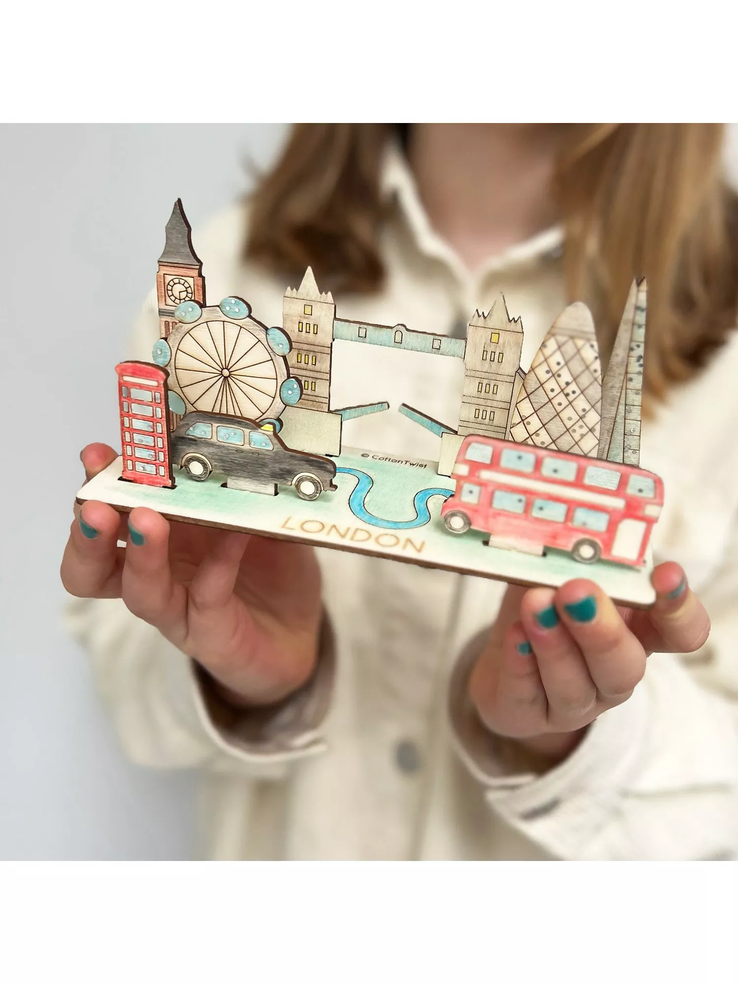 Includes: wood engraved London landmarks, jumbo watercolour pencils, paintbrush, jumbo sharpener, silver glitter glue, instruction card.