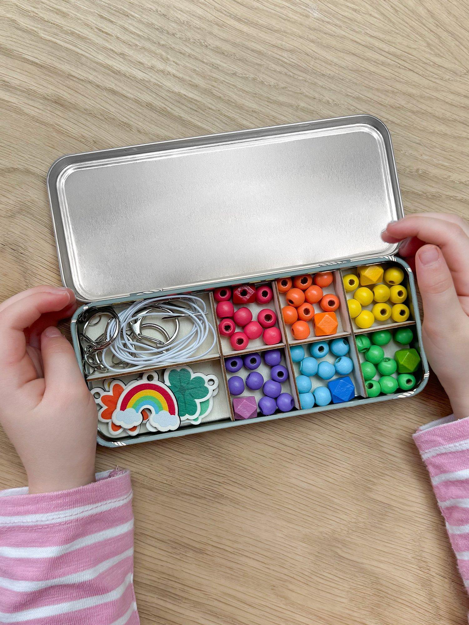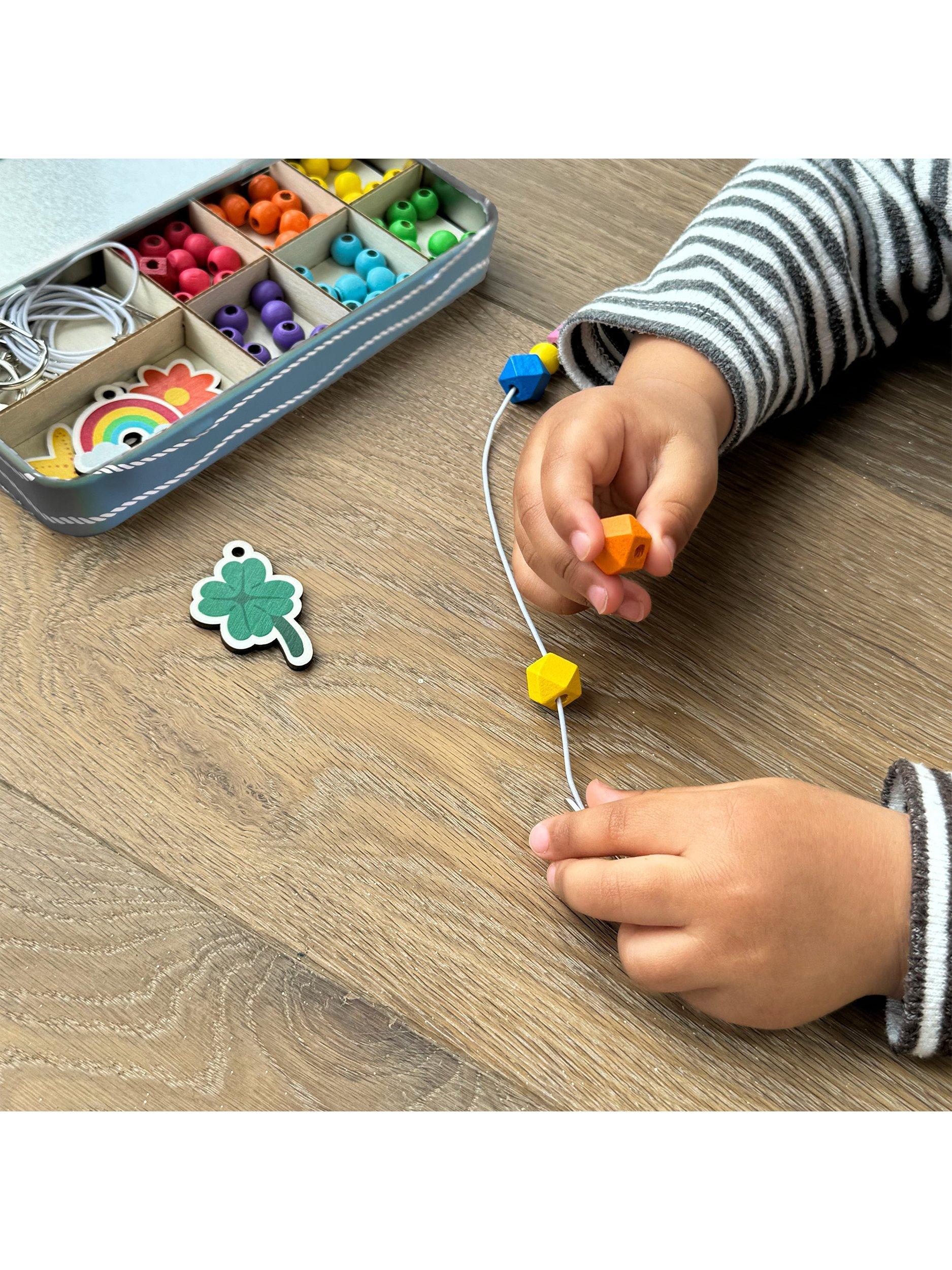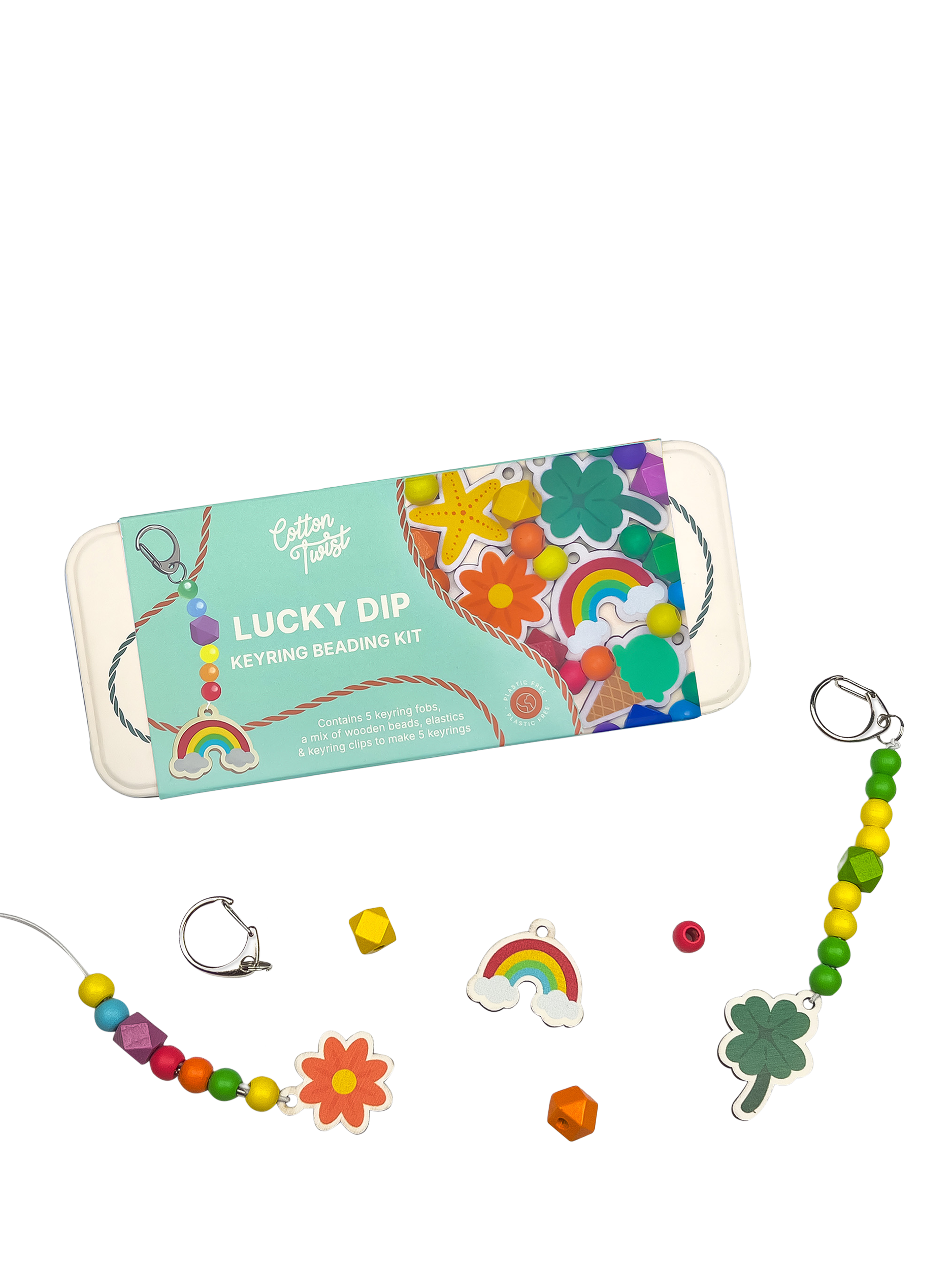 The Lucky Dip keyring kit makes a wonderful plastic-free activity for children. It offers a selection of wooden fobs including a clover, flower, starfish, ice cream and rainbow, allowing children to create 5 keyrings. The kit also comes with rainbow-coloured spacers and geometric beads to complement the showpiece beads for vibrant accessories. With elastic featuring metal ends, threading the beads is easy for young children.