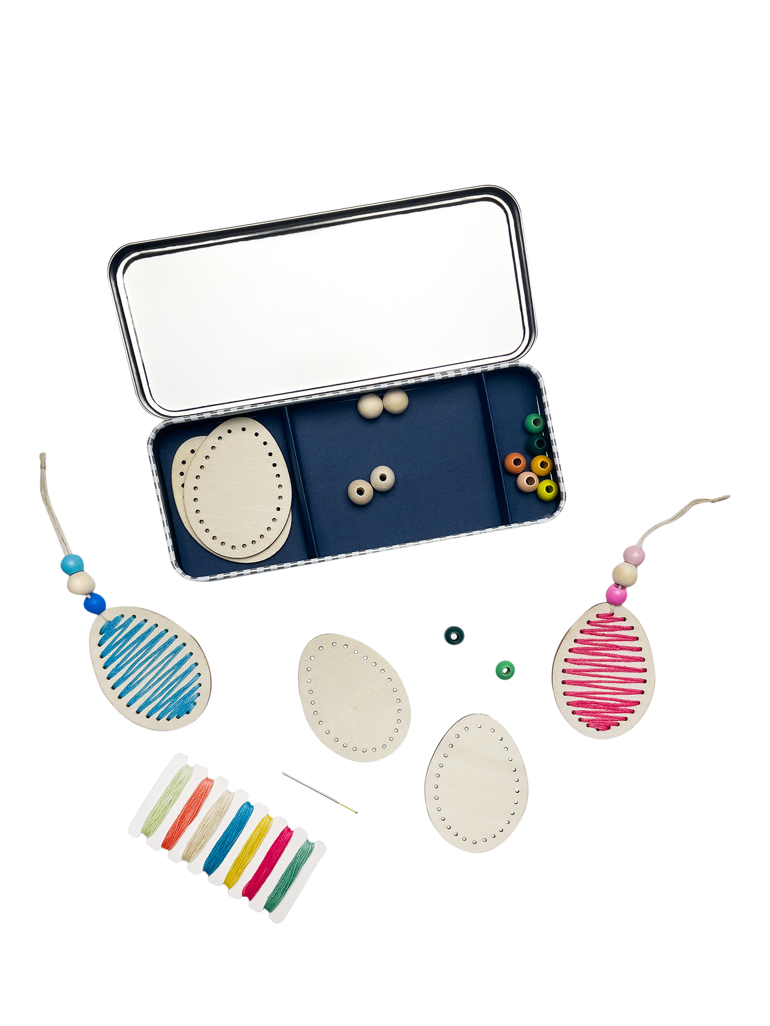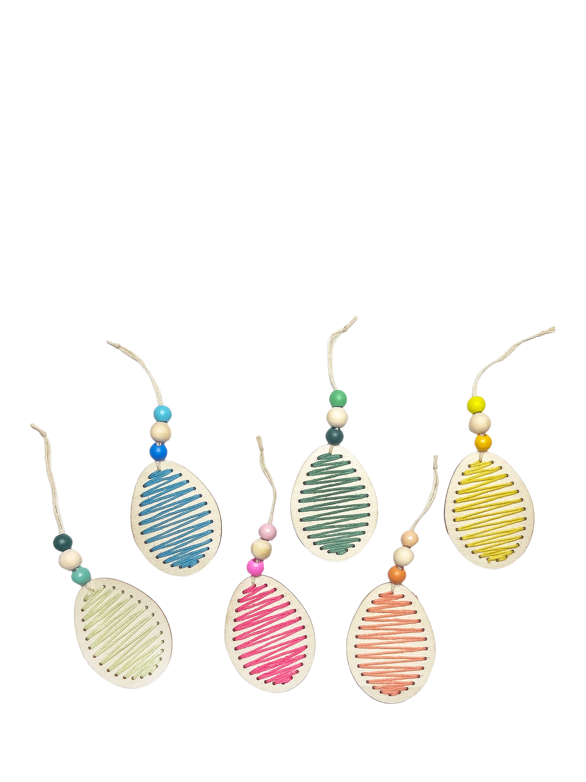 Inside, you'll find 6 wooden eggs, a pack of 7 pastel-coloured cotton threads, and wooden beads, allowing for a range of patterns and designs. It's a fantastic way to bring the whole family together for a fun, eco-friendly crafting session that celebrates the spirit of spring.
