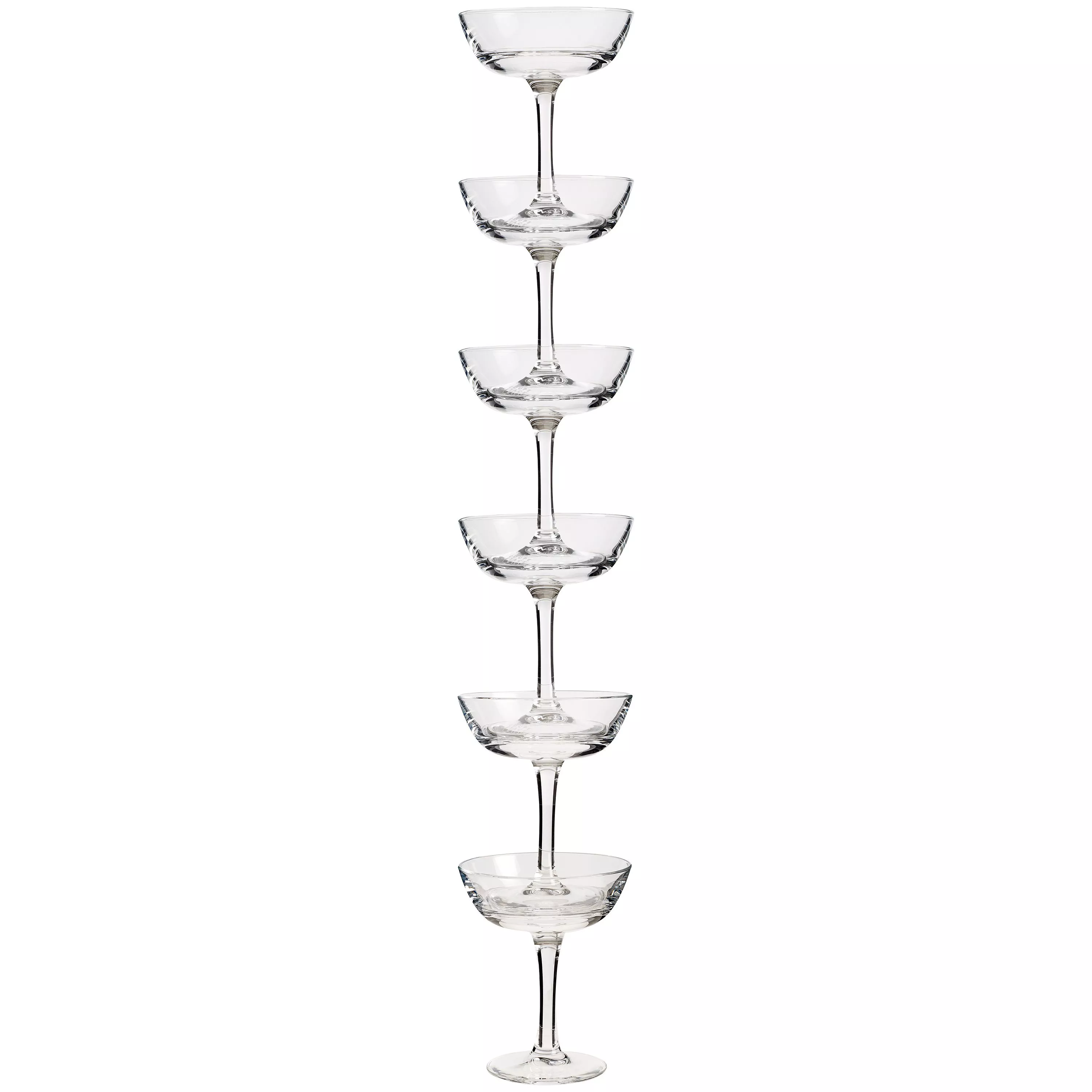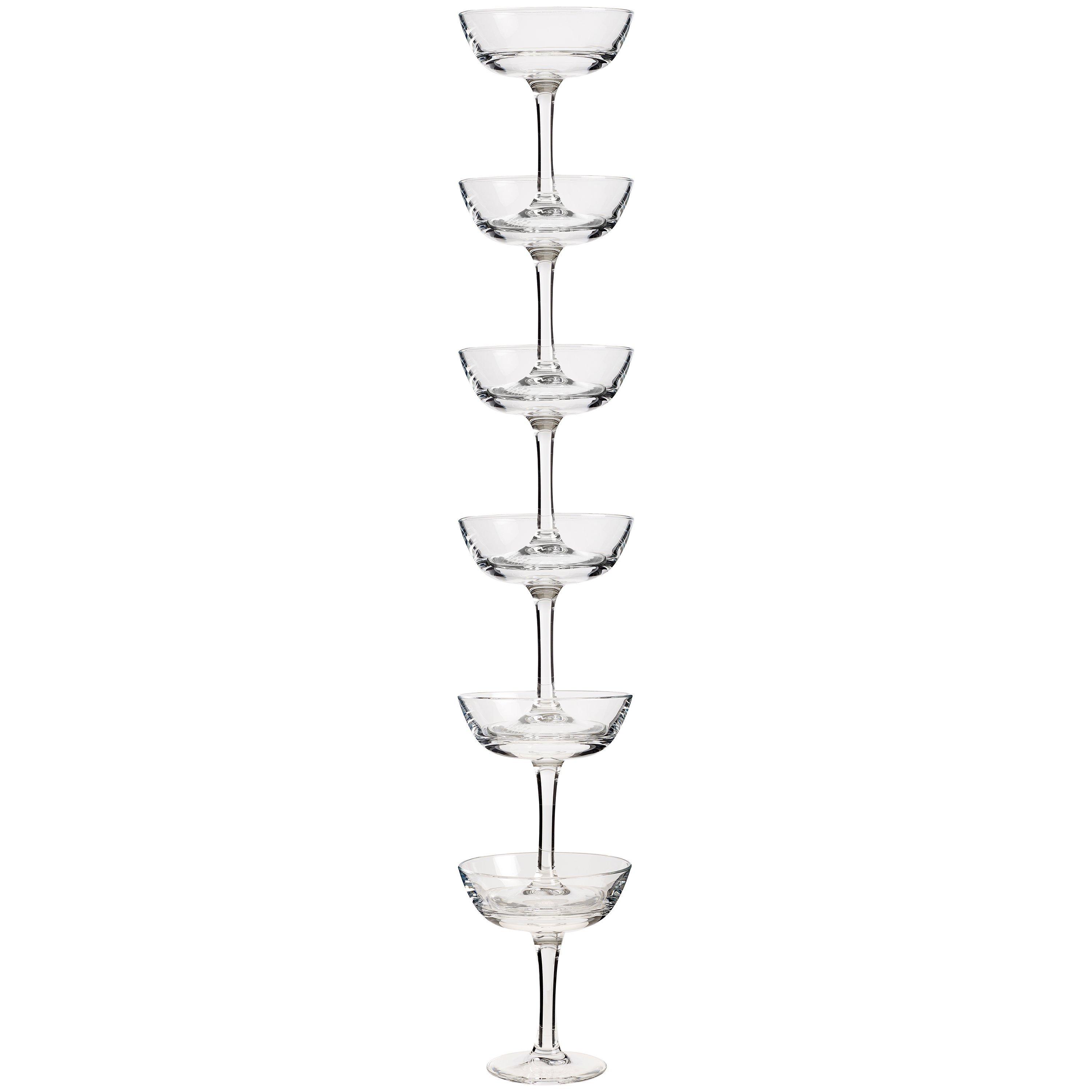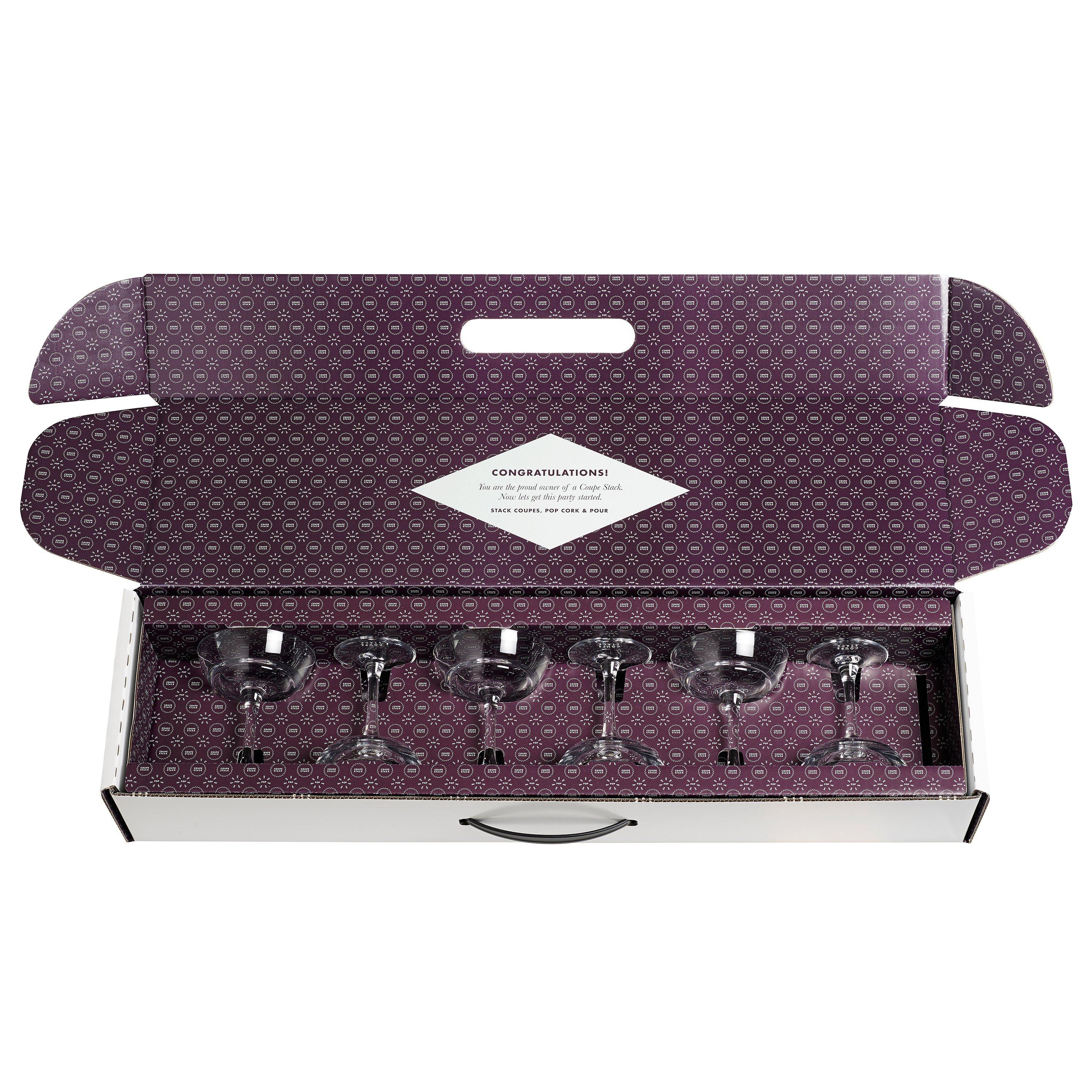 The six, unique champagne glasses have been specifically designed with a patent pending ledge inside to ensure they stay safely one above the other when stacked.