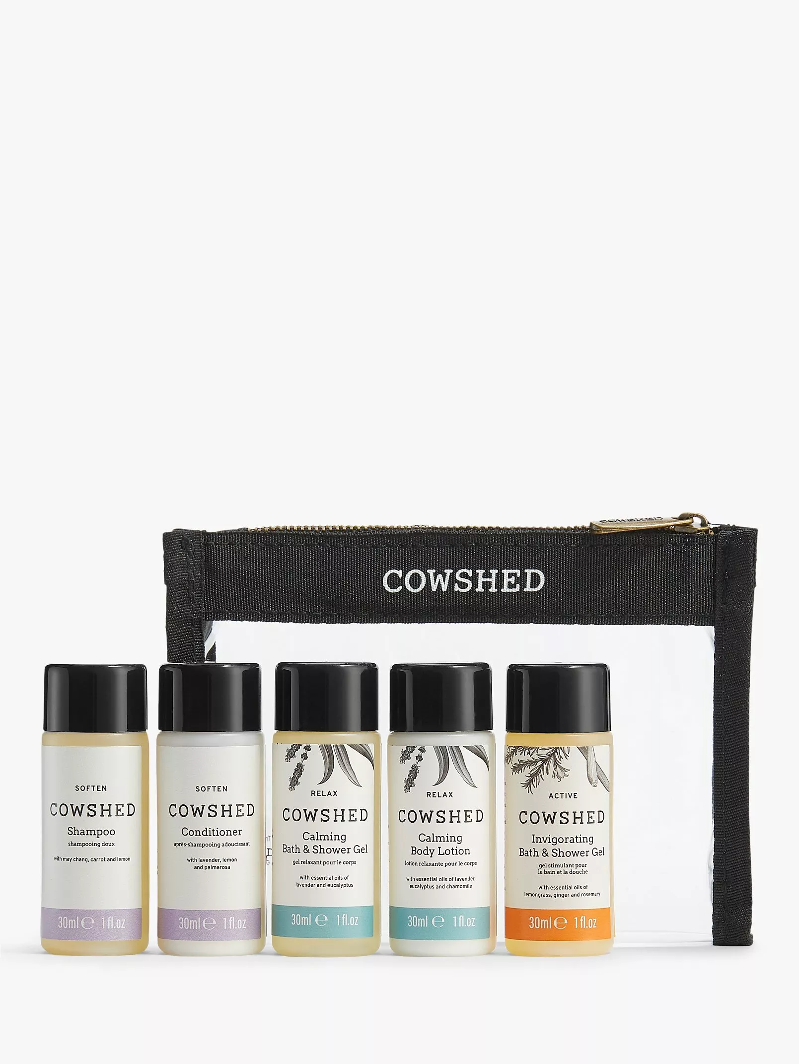 Our Travel Set gives you a taste of the best of Cowshed, wherever you are. Featuring our Soften Shampoo, Soften Conditioner, Relax Bath & Shower, Relax Body Lotion and Active Bath & Shower Gel for spa-level pampering on-the-go. Presented in a clear, flight-friendly bag, this selection will sit nicely next to your passport. Given as a gift or a treat to yourself, it's the perfect introduction to our bath and body range.