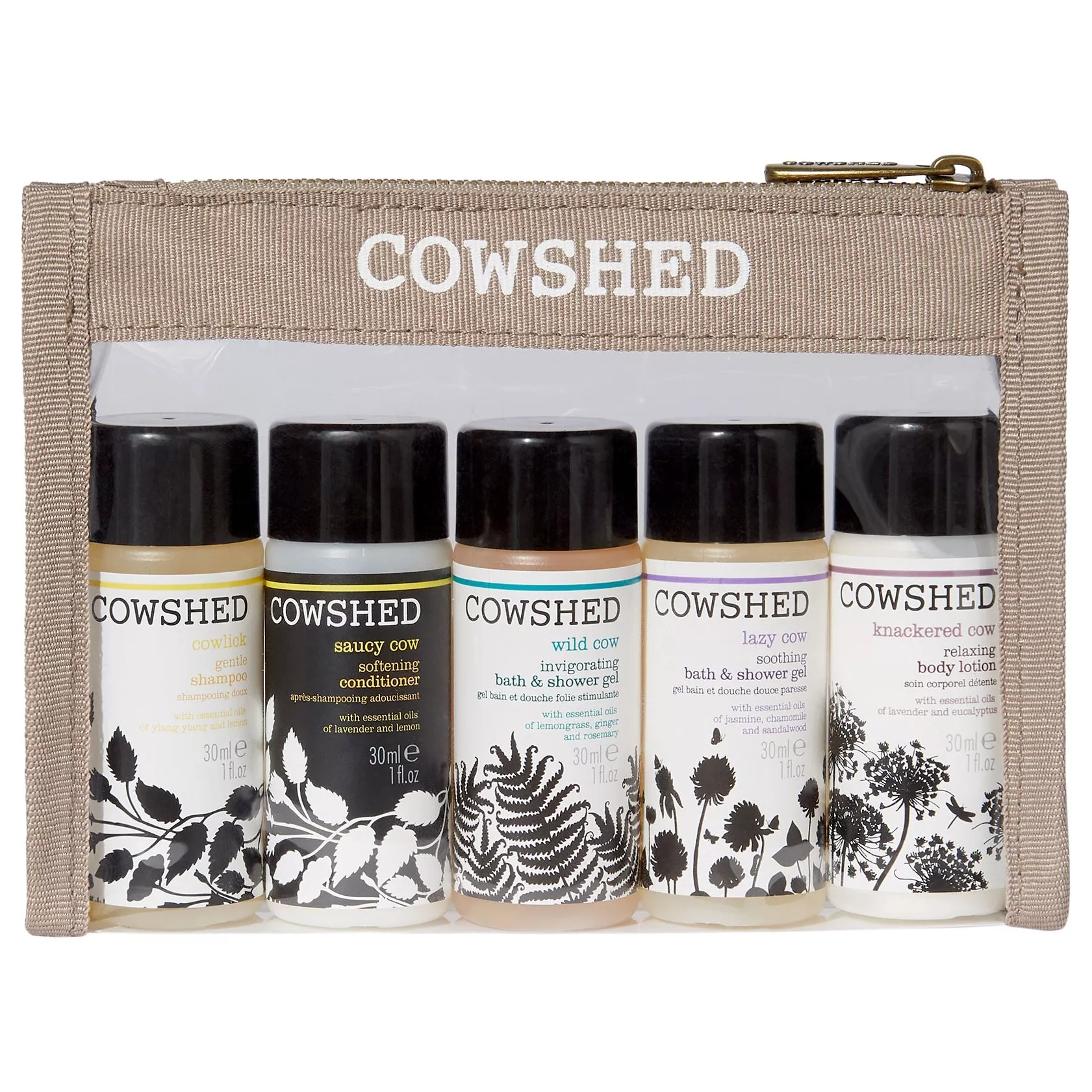 Presented in a transparent flight-friendly bag with a Cowshed-embossed brass zip fastening, this set is the ideal travelling companion and makes a perfect introduction to the Cowshed bath and body range.